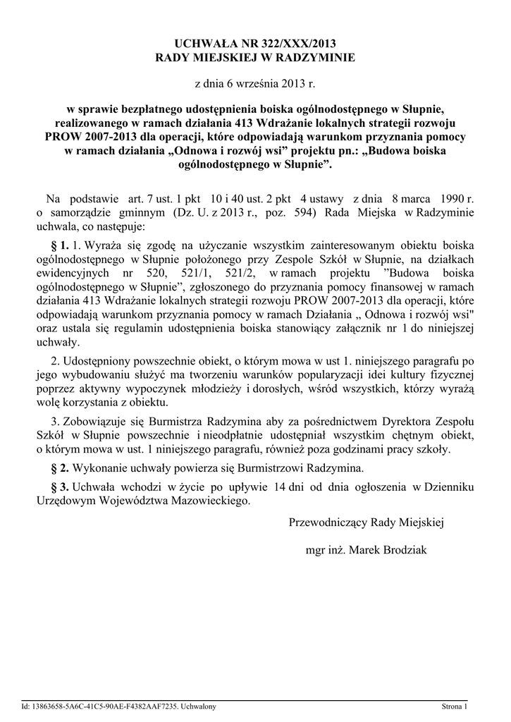 UCHWAŁA NR 322/XXX/2013 RADY MIEJSKIEJ W RADZYMINIE z dnia 6 września 2013 r. w sprawie bezpłatnego udostępnienia boiska ogólnodostępnego w Słupnie, realizowanego w ramach działania 413 Wdrażanie lokalnych strategii rozwoju PROW 2007-2013 dla operacji, które odpowiadają warunkom przyznania pomocy w ramach działania „Odnowa i rozwój wsi” projektu pn.: „Budowa boiska ogólnodostępnego w Słupnie”. Na podstawie art. 7 ust. 1 pkt 10 i 40 ust. 2 pkt 4 ustawy z dnia 8 marca 1990 r. o samorządzie gminnym (Dz. U. z 2013 r., poz. 594) Rada Miejska w Radzyminie uchwala, co następuje: § 1. 1. Wyraża się zgodę na użyczanie wszystkim zainteresowanym obiektu boiska ogólnodostępnego w Słupnie położonego przy Zespole Szkół w Słupnie, na działkach ewidencyjnych nr 520, 521/1, 521/2, w ramach projektu ”Budowa boiska ogólnodostępnego w Słupnie”, zgłoszonego do przyznania pomocy finansowej w ramach działania 413 Wdrażanie lokalnych strategii rozwoju PROW 2007-2013 dla operacji, które odpowiadają warunkom przyznania pomocy w ramach Działania „ Odnowa i rozwój wsi" oraz ustala się regulamin udostępnienia boiska stanowiący załącznik nr 1 do niniejszej uchwały. 2. Udostępniony powszechnie obiekt, o którym mowa w ust 1. niniejszego paragrafu po jego wybudowaniu służyć ma tworzeniu warunków popularyzacji idei kultury fizycznej poprzez aktywny wypoczynek młodzieży i dorosłych, wśród wszystkich, którzy wyrażą wolę korzystania z obiektu. 3. Zobowiązuje się Burmistrza Radzymina aby za pośrednictwem Dyrektora Zespołu Szkół w Słupnie powszechnie i nieodpłatnie udostępniał wszystkim chętnym obiekt, o którym mowa w ust. 1 niniejszego paragrafu, również poza godzinami pracy szkoły. § 2. Wykonanie uchwały powierza się Burmistrzowi Radzymina. § 3. Uchwała wchodzi w życie po upływie 14 dni od dnia ogłoszenia w Dzienniku Urzędowym Województwa Mazowieckiego. Przewodniczący Rady Miejskiej mgr inż. Marek Brodziak Id: 13863658-5A6C-41C5-90AE-F4382AAF7235. Uchwalony Strona 1 Załącznik Nr 1 do Uchwały Nr 322/XXX/2013 Rady Miejskiej w Radzyminie z dnia 6 września 2013 r. REGULAMIN KORZYSTANIA Z BOISKA OGÓLNODOSTĘPNEGO W SŁUPNIE Rozdział 1. CZEŚĆ OGÓLNA § 1. Właścicielem boiska wielofunkcyjnego w Słupnie jest Gmina Radzymin. § 2. Przed wejściem na boisko każdy korzystający z boiska sportowego w Słupnie jest zobowiązany do zapoznania się z Regulaminem korzystania z obiektu i do przestrzegania jego postanowień w trakcie korzystania. § 3. Dzieci do lat 7 mogą korzystać z boiska wyłącznie pod opieką osób dorosłych. § 4. Boisko jest powszechnie dostępne dla wszystkich, którzy zechcą z niego korzystać. § 5. Każdy użytkownik jest zobowiązany do niezwłocznego powiadamiania zarządcę obiektu o zauważonych uszkodzeniach urządzeń, w trosce o zdrowie własne i pozostałych użytkowników. Rozdział 2. ZASADY KORZYSTANIA Z BOISKA § 6. Korzystanie z boiska jest bezpłatne. § 7. Ramowe godziny otwarcia boiska - 8:00 do zmierzchu. Szczegółowy harmonogram na poszczególne miesiące ustala Dyrektor Zespołu Szkół w Słupnie. § 8. Pierwszeństwo w korzystaniu z boiska w dniach zajęć lekcyjnych w godz. od 8:00 do 17:00 mają uczniowie Zespołu Szkół w Słupnie oraz uczniowie innych placówek szkolnych z terenu Gminy Radzymin. § 9. Z boiska mogą korzystać: uczniowie szkół, członkowie klubów i organizacji pozarządowych, grupy młodzieży oraz inne osoby dorosłe. § 10. Korzystanie z urządzeń boiska przez inne grupy niż wymienione w § 9 lub osoby indywidualne, odbywa się zgodnie z ich przeznaczeniem, ale na własną odpowiedzialność użytkownika. § 11. Z boiska należy korzystać nie zagrażający innym użytkownikom. zgodnie z jego przeznaczeniem w sposób § 12. Osoby korzystające z boiska są zobowiązane do zachowania czystości i porządku, oraz ponoszą odpowiedzialność materialną za powstałe szkody wyrządzone umyślnie. Id: 13863658-5A6C-41C5-90AE-F4382AAF7235. Uchwalony Strona 1 § 13. Wszystkich korzystających z boiska obowiązuje strój sportowy oraz obuwie sportowe, zabrania się używania butów piłkarskich na wysokich i metalowych korkach oraz kolcach. § 14. W celu zapewnienia bezpieczeństwa użytkownikom i korzystania z boiska zgodnie z jego przeznaczeniem, na terenie boiska jak i w jego sąsiedztwie obowiązuje zakaz: 1) wprowadzania i użytkowania sprzętu innego niż zgodnego z przeznaczeniem boiska, np. rower, skuter, deskorolka, rolki, wrotki itp.; 2) niszczenia urządzeń sportowych i płyty boiska; 3) wchodzenia na urządzenia sportowe, wieszania się na bramkach oraz wchodzenia na ogrodzenia; 4) palenia tytoniu, spożywania alkoholu, zażywania środków odurzających; 5) zaśmiecania płyty boiska, szczególnie gumą do żucia; 6) wprowadzania zwierząt; 7) przeszkadzania w grze innym korzystającym z boiska; 8) zakłócania porządku i używania słów wulgarnych; 9) wnoszenia pojemników do rozpylania gazów, substancji żrących lub farbujących, opakowań szklanych łatwo tłukących się; 10) przebywania na obiekcie osób nietrzeźwych i pod wpływem środków odurzających. Rozdział 3. POSTANOWIENIA KOŃCOWE § 15. Zarządca boiska nie ponosi odpowiedzialności za wypadki powstałe w trakcie korzystania z obiektu. § 16. Zarządca boiska nie ponosi odpowiedzialności za rzeczy pozostawione na terenie boiska. § 17. Zarządca boiska może kontrolować wszystkie zajęcia, a w razie naruszenia niniejszego regulaminu może zakazać dalszego korzystania z boiska. § 18. Zarządca boiska może odwołać zajęcia w celu przeprowadzenia: 1) imprez sportowo-rekreacyjnych; 2) rozgrywek międzyszkolnych; 3) prac konserwacyjnych. § 19. Zarządca boiska może odwołać niesprzyjających warunków atmosferycznych nawierzchni boiska. zajęcia w przypadku wystąpienia zagrażających użytkownikom oraz § 20. Nie przestrzeganie Regulaminu może spowodować prz