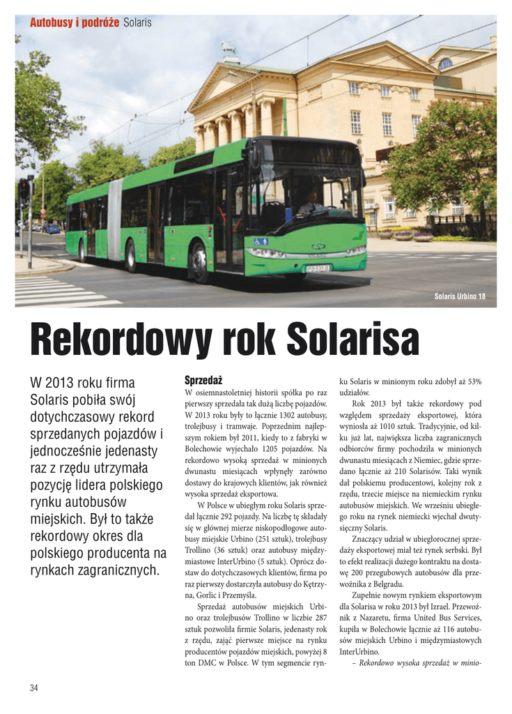 Autobusy i podróże Solaris Solaris Urbino 18 Rekordowy rok Solarisa W 2013 roku firma Solaris pobiła swój dotychczasowy rekord sprzedanych pojazdów i jednocześnie jedenasty raz z rzędu utrzymała pozycję lidera polskiego rynku autobusów miejskich. Był to także rekordowy okres dla polskiego producenta na rynkach zagranicznych. 34 Sprzedaż W osiemnastoletniej historii spółka po raz pierwszy sprzedała tak dużą liczbę pojazdów. W 2013 roku były to łącznie 1302 autobusy, trolejbusy i tramwaje. Poprzednim najlepszym rokiem był 2011, kiedy to z fabryki w Bolechowie wyjechało 1205 pojazdów. Na rekordowo wysoką sprzedaż w minionych dwunastu miesiącach wpłynęły zarówno dostawy do krajowych klientów, jak również wysoka sprzedaż eksportowa. W Polsce w ubiegłym roku Solaris sprzedał łącznie 292 pojazdy. Na liczbę tę składały się w głównej mierze niskopodłogowe autobusy miejskie Urbino (251 sztuk), trolejbusy Trollino (36 sztuk) oraz autobusy międzymiastowe InterUrbino (5 sztuk). Oprócz dostaw do dotychczasowych klientów, firma po raz pierwszy dostarczyła autobusy do Kętrzyna, Gorlic i Przemyśla. Sprzedaż autobusów miejskich Urbino oraz trolejbusów Trollino w liczbie 287 sztuk pozwoliła firmie Solaris, jedenasty rok z rzędu, zająć pierwsze miejsce na rynku producentów pojazdów miejskich, powyżej 8 ton DMC w Polsce. W tym segmencie ryn- ku Solaris w minionym roku zdobył aż 53% udziałów. Rok 2013 był także rekordowy pod względem sprzedaży eksportowej, która wyniosła aż 1010 sztuk. Tradycyjnie, od kilku już lat, największa liczba zagranicznych odbiorców firmy pochodziła w minionych dwunastu miesiącach z Niemiec, gdzie sprzedano łącznie aż 210 Solarisów. Taki wynik dał polskiemu producentowi, kolejny rok z rzędu, trzecie miejsce na niemieckim rynku autobusów miejskich. We wrześniu ubiegłego roku na rynek niemiecki wjechał dwutysięczny Solaris. Znaczący udział w ubiegłorocznej sprzedaży eksportowej miał też rynek serbski. Był to efekt realizacji dużego kontraktu na dostawę 200 przegubowych autobusów dla przewoźnika z Belgradu. Zupełnie nowym rynkiem eksportowym dla Solarisa w roku 2013 był Izrael. Przewoźnik z Nazaretu, firma United Bus Services, kupiła w Bolechowie łącznie aż 116 autobusów miejskich Urbino i międzymiastowych InterUrbino. – Rekordowo wysoka sprzedaż w minio- nym roku to przede wszystkim efekt zaufania, jakim obdarzają nas wieloletni klienci. Większość kontraktów zrealizowaliśmy bowiem w miastach, gdzie już wcześniej jeździły pojazdy naszej marki. To najlepszy dowód jakości naszych produktów oraz dobrej obsługi serwisowej. Jak widać klienci do nas wracają, bo marka Solaris cieszy się ich dobrą opinią – komentuje rekordowe wyniki roku 2013 Solange Olszewska, prezes Zarządu firmy Solaris. Nowe produkty W minionym roku firma Solaris zaprezentowała autobusy spełniające normę Euro 6, która zaczęła obowiązywać z początkiem 2014. Spółka jest dobrze przygotowana do tej zmiany i już od kilku miesięcy oferuje swoim klientom pełną gamę produktów spełniających najnowsze wymogi prawne dotyczące emisji spalin. Nowością produktową, zaprezentowaną przez Solarisa w roku 2013, był model autobusu elektrycznego z innowacyjnym systemem ładowania baterii. Zamontowany na dachu odbierak prądu w połączeniu z zawieszoną nad jezdnią stacją ładowania gwarantuje szybkie, bezobsługowe uzupełnianie energii elektrycznej w bateriach. Rozwiązanie to zostało opatentowane przez firmę Solaris i zdobyło między innymi złoty medal Targów Kielce. Firma może także pochwalić się pierwszymi sukcesami komercyjnymi, jeśli chodzi o autobusy elektryczne. W ubiegłym roku pierwszy tego typu pojazd został sprzedany do Klagenfurtu w Austrii. Z kolei w tym roku pięć elektrycznych Solarisów zostanie dostarczonych do Brunszwiku w Niemczech. Będzie to jeden autobus dwunastometrowy oraz cztery autobusy przegubowe. Co ciekawe wszystkie pojazdy będą ładowane indukcyjnie. Następne dwa autobusy elektryczne Solaris przekaże w tym roku przewoźnikowi z Düsseldorfu, a kolejny do firmy z Vasteras w Szwecji. W bieżącym roku będzie miała również miejsce dostawa dwóch przegubowych autobusów elektrycznych do firmy Hochbahn Hamburg. Będą to pojazdy dodatkowo wyposażone w wodorowe ogniwa paliwowe zwiększające zasięg autobusów. – Z dużym optymizmem obserwujemy coraz większe zainteresowanie przewoźników zakupem autobusów elektrycznych. W minionym roku przełożyło się to już na konkretne zamówienia. Rok 2014 zapowiada się pod tym względem jeszcze lepiej. Sądzę, że w kolejnych latach udział w naszej sprzedaży całkowicie bezemisyjnych autobusów napędzanych energią elektryczną będzie coraz większy – prognozuje Solange Olszewska. W roku 2014 Solaris planuje prezentację kolejnych nowych produktów. Niewątpliwie najważniejszą z premier będzie długo oczekiwana prezentacja nowego Solarisa. Innowacyjny projekt zostanie zaprezentowany w czasie wrześniowych targów IAA w Hanowerze. Nowa, lżejsza konstrukcja autobusu Solaris Urbino MetroStyle Solange Olszewska: – Rok 2013 był rekordowy pod kątem sprzedaży, co niezwykle nas cieszy. Obecnie pracujemy nad tym, aby kolejne lata były równie dobre dla spółki. Prognozy wyglądają optymistycznie i bazują między innymi na liczbie zamówień, które już mamy w naszym portfelu na ten rok i następne lata. W bieżącym roku zrealizujemy między innymi kontrakt na dostawę 100 autobusów dla Izmiru, a w kilku kolejnych latach dostarczymy łącznie 300 pojazdów do Rygi. Jak zawsze będziemy także budować portfel naszych zamówień o mniejsze kontrakty, które dla naszej firmy są równie istotne – zapowiada o dynamicznym designie będzie sukcesywnie wdrażana do produkcji i w najbliższych latach zastąpi dotychczasową generację pojazdów marki Solaris. Firma planuje także za