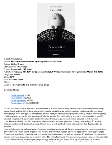 E-Book: Trucicielka Author: Éric-Emmanuel Schmitt, Agata Sylwestrzak-Wszelaki Rating: 3.82 of 5 stars Rating count: 745 ratings Format: Paperback, 240 pages Published: February 7th 2011 by Społeczny Instytut Wydawniczy Znak (first published March 3rd 2010) Language: Polish Series: N/A ISBN10: 8324016198 ASIN: Original Title: Concerto à la memoire d'un ange Download links: • • • • Trucicielka.pdf [PDF] Trucicielka.doc [DOC] Trucicielka.epub [ePUB] Trucicielka.mp3 [AUDIOBOOK] Książka Trucicielka i inne historie o namiętnościach to zbiór czterech wyjątkowych opowiadań bestsellerowego francuskiego autora. Schmitt porusza w nich kwestie poszukiwania miłości, nadziei, zwątpienia, ale tym razem wzbogaca je o coś nowego. O namiętność, analizę naszych najskrytszych pragnień, emocji. Uczuć, które w jednej chwili mogą nas wyzwolić lub doprowadzić do zbr Książka Trucicielka i inne historie o namiętnościach to zbiór czterech wyjątkowych opowiadań bestsellerowego francuskiego autora. Schmitt porusza w nich kwestie poszukiwania miłości, nadziei, zwątpienia, ale tym razem wzbogaca je o coś nowego. O namiętność, analizę naszych najskrytszych pragnień, emocji. Uczuć, które w jednej chwili mogą nas wyzwolić lub doprowadzić do zbrodni. Jego bohaterowie nie są kryształowi. Często wzbudzają prawdziwy lęk. Pewna starsza kobieta podejrzewana jest o zamordowanie swych trzech mężów. Nikt nie zna prawdy i tylko jeden człowiek, będzie miał szansę ją usłyszeć. Zmieni ona jego życie, zabierając tak potrzebną jego duchowemu rozwojowi niewinność. W drugim opowiadaniu pewien marynarz dowiaduje się o śmierci córki. Nie wie tylko której. Przerażony uświadamia sobie, że nie wszystkie kocha równie mocno. Kolejne opisuje rywalizację dwóch młodych muzyków. Chęć wyrównania rachunków odkrywa mroczne kulisy życia ludzi, którzy mogli mieć wszystko, ale zmarnowali swój dar. Ostatnie opowiadanie kocha równie mocno. Kolejne opisuje rywalizację dwóch młodych muzyków. Chęć wyrównania rachunków odkrywa mroczne kulisy życia ludzi, którzy mogli mieć wszystko, ale zmarnowali swój dar. Ostatnie opowiadanie opisuje wzruszającą miłość za kulisami pałacu prezydenckiego. W pustych ścianach wytwornej rezydencji toczy się dramat samotnej, umierającej kobiety. W swoim najnowszym zbiorze opowiadań Schmitt odkrywa prawdziwą potęgę uczuć. Ich moc. Jego bohaterowie ukrywają zbrodnie, brak im cierpliwości, jedynie w sytuacji kryzysowej przypominają sobie o tym, co jest dla nich najważniejsze. Na ich przykładzie Schmitt uczy nas czegoś ważnego - że nigdy nie jest za późno na zmianę, nawet jeśli nie zawsze dane nam będzie szczęśliwe zakończenie. Wyjątkowość książki Trucicielka i inne historie o namiętnościach doceniło jury prestiżowej nagrody literackiej - Le Prix Goncourt, w 2010 roku wyróżniając ją nagrodą Le Prix Goncourt de la Nouvelle. Zbiór wzbogaca fragment prywatnego dziennika autora z okresu, kiedy pisał książkę. Dzieli się w nim swoimi uwagami na temat poruszanych w niej tematów, opisuje inspiracje i zdradza tajniki warsztatu. Dzięki tym zapiskom jeszcze lepiej poznajemy autora, i to nie tylko jako wyjątkowego pisarza, ale także jako niezwykle wnikliwego człowieka, filozofa.