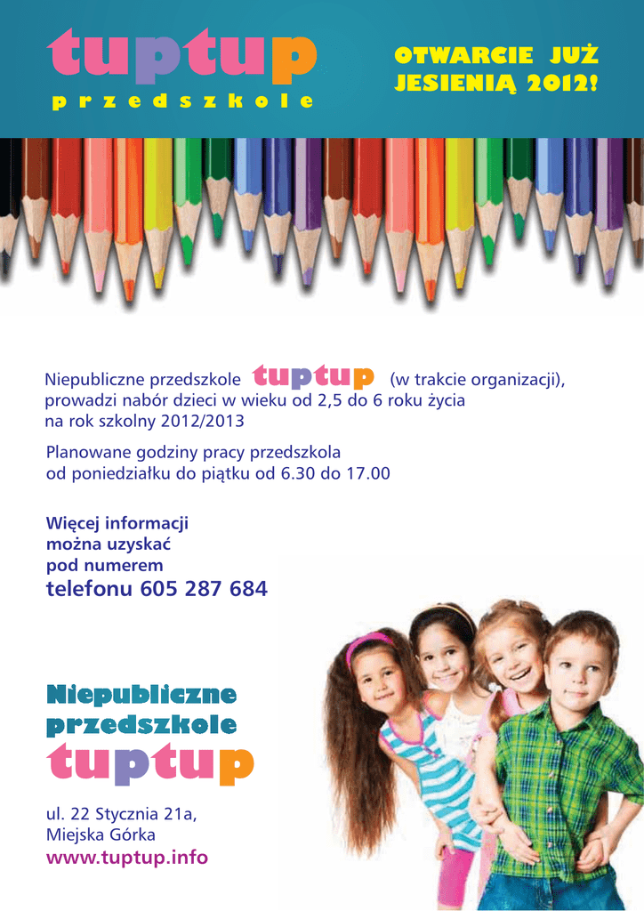 tuptu p p r z e d s z k o l e tuptu p OTWARCIE JUŻ JESIENIĄ 2012! Niepubliczne przedszkole (w trakcie organizacji), prowadzi nabór dzieci w wieku od 2,5 do 6 roku życia na rok szkolny 2012/2013 Planowane godziny pracy przedszkola od poniedziałku do piątku od 6.30 do 17.00 Więcej informacji można uzyskać pod numerem telefonu 605 287 684 tuptu p ul. 22 Stycznia 21a, Miejska Górka www.tuptup.info tuptu p p r z e d s z k o l e OTWARCIE JUŻ JESIENIĄ 2012! Nasze przedszkole oferuje między innymi: - długie godziny otwarcia - wygodny parking - nowoczesne, wysokie i przestronne sale o powierzchni 56m2 - łazienki przy każdej sali - nowoczesne pomoce dydaktyczne - sale rehabilitacyjną dla dzieci niepełnosprawnych - zajęcia prowadzone metodą Marii Montessori - indywidualne podejście do każdego dziecka - najnowsze metody rozwoju dzieci w wieku przedszkolnym - doświadczoną i wykwalifikowaną kadrę Czekamy na Twoje dziecko! tuptu p ul. 22 Stycznia 21a, Miejska Górka www.tuptup.info