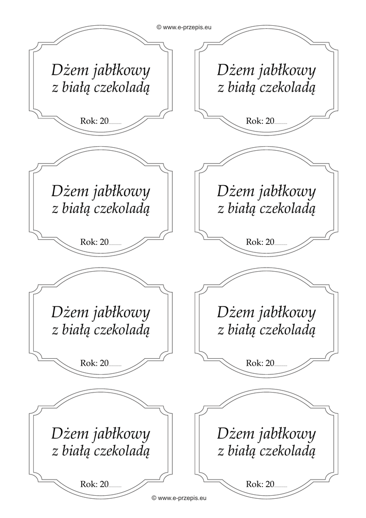 © www.e-przepis.eu Dżem jabłkowy Dżem jabłkowy z białą czekoladą z białą czekoladą Rok: 20.............. Rok: 20.............. Dżem jabłkowy Dżem jabłkowy z białą czekoladą z białą czekoladą Rok: 20.............. Rok: 20.............. Dżem jabłkowy Dżem jabłkowy z białą czekoladą z białą czekoladą Rok: 20.............. Rok: 20.............. Dżem jabłkowy Dżem jabłkowy z białą czekoladą z białą czekoladą Rok: 20.............. Rok: 20.............. © www.e-przepis.eu