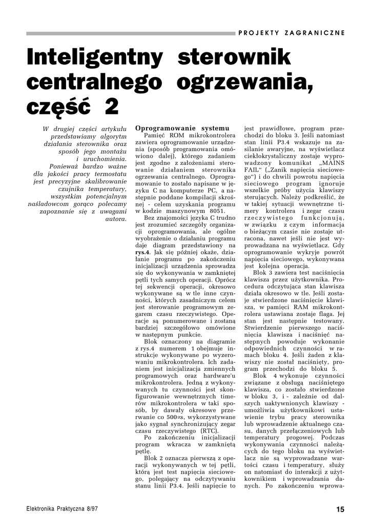 P R O J E K T Y P R O JZ E A K TG Y RZ AAGNR A I N CI C Z ZNN E Inteligentny sterownik centralnego ogrzewania, część 2 W†drugiej czÍúci artyku³u przedstawiamy algorytm dzia³ania sterownika oraz sposÛb jego montaøu i†uruchomienia. Poniewaø bardzo waøne dla jakoúci pracy termostatu jest precyzyjne skalibrowanie czujnika temperatury, wszystkim potencjalnym naúladowcom gor¹co polecamy zapoznanie siÍ z†uwagami autora. Elektronika Praktyczna 8/97 Oprogramowanie systemu PamiÍÊ ROM mikrokontrolera zawiera oprogramowanie urz¹dzenia (sposÛb programowania omÛwiono dalej), ktÛrego zadaniem jest zgodne z†za³oøeniami sterowanie dzia³aniem sterownika ogrzewania centralnego. Oprogramowanie to zosta³o napisane w†jÍzyku C†na komputerze PC, a†nastÍpnie poddane kompilacji skroúnej - celem uzyskania programu w†kodzie maszynowym 8051. Bez znajomoúci jÍzyka C†trudno jest zrozumieÊ szczegÛ³y organizacji oprogramowania, ale ogÛlne wyobraøenie o†dzia³aniu programu daje diagram przedstawiony na rys.4. Jak siÍ pÛüniej okaøe, dzia³anie programu po zakoÒczeniu inicjalizacji urz¹dzenia sprowadza siÍ do wykonywania w†zamkniÍtej pÍtli tych samych operacji. OprÛcz tej sekwencji operacji, okresowo wykonywane s¹ w†tle inne czynnoúci, ktÛrych zasadniczym celem jest sterowanie programowym zegarem czasu rzeczywistego. Operacje s¹ ponumerowane i†zostan¹ bardziej szczegÛ³owo omÛwione w†nastÍpnym punkcie. Blok oznaczony na diagramie z†rys.4 numerem 1†obejmuje instrukcje wykonywane po wyzerowaniu mikrokontrolera. Ich zadaniem jest inicjalizacja zmiennych programowych oraz hardware'u mikrokontrolera. Jedn¹ z†wykonywanych tu czynnoúci jest skonfigurowanie wewnÍtrznych timerÛw mikrokontrolera w†taki sposÛb, by dawa³y okresowe przerwanie co 500µs, wykorzystywane jako sygna³ synchronizuj¹cy zegar czasu rzeczywistego (RTC). Po zakoÒczeniu inicjalizacji program wkracza w†zamkniÍt¹ pÍtlÍ. Blok 2†oznacza pierwsz¹ z†operacji wykonywanych w†tej pÍtli, ktÛr¹ jest test napiÍcia sieciowego, polegaj¹cy na odczytywaniu stanu linii P3.4. Jeúli napiÍcie to jest prawid³owe, program przechodzi do bloku 3. Jeúli natomiast stan linii P3.4 wskazuje na zasilanie awaryjne, na wyúwietlacz ciek³okrystaliczny zostaje wyprowadzony komunikat ìMAINS FAILî (ìZanik napiÍcia sieciowegoî) i†do chwili powrotu napiÍcia sieciowego program ignoruje wszelkie prÛby uøycia klawiszy steruj¹cych. Naleøy podkreúliÊ, øe w†takiej sytuacji wewnÍtrzne timery kontrolera i†zegar czasu rzeczywistego funkcjonuj¹, w†zwi¹zku z†czym informacja o†bieø¹cym czasie nie zostaje utracona, nawet jeúli nie jest wyprowadzana na wyúwietlacz. Gdy oprogramowanie wykryje powrÛt napiÍcia sieciowego, wykonywana jest kolejna operacja. Blok 3†zawiera test naciúniÍcia klawisza przez uøytkownika. Procedura odczytuj¹ca stan klawisza dzia³a okresowo w†tle. Jeúli zostaje stwierdzone naciúniÍcie klawisza, w†pamiÍci RAM mikrokontrolera ustawiana zostaje flaga. Jej stan jest nastÍpnie testowany. Stwierdzenie pierwszego naciúniÍcia klawisza i†naciúniÍÊ nastÍpnych powoduje wykonanie odpowiednich czynnoúci w†ramach bloku 4. Jeúli øaden z†klawiszy nie zosta³ naciúniÍty, program przechodzi do bloku 5. Blok 4†wykonuje czynnoúci zwi¹zane z†obs³ug¹ naciúniÍtego klawisza, co zosta³o stwierdzone w†bloku 3, i†- zaleønie od dalszych uaktywnionych klawiszy umoøliwia uøytkownikowi ustawienie trybu pracy sterownika lub wprowadzenie aktualnego czasu, danych prze³¹czeniowych lub temperatury progowej. Podczas wykonywania czynnoúci naleø¹cych do tego bloku na wyúwietlacz nie s¹ wyprowadzane wartoúci czasu i†temperatury, s³uøy on natomiast do interakcji z†uøytkownikiem i†wprowadzania danych. Po zakoÒczeniu wprowa- 15 P R O J E K T Y Z A G R A N I C Z N E n¹ (w stopniach Celsjusza) oraz wyprowadzenie jej na wyúwietlacz. CzynnoúÊ ta wykonywana jest raz na sekundÍ i synchronizowana informacj¹ pochodz¹c¹ z†zegara czasu rzeczywistego, co w†przypadku zmiany temperatury zapobiega migotaniu wyúwietlacza. W†bloku 7, na podstawie danych wprowadzonych uprzednio do programu, jest podejmowana decyzja, ktÛry z†przekaünikÛw naleøy w³¹czyÊ. W†przypadku sterowania ogrzewaniem centralnym (nie dotyczy to ogrzewania wody) brane s¹ pod uwagÍ aktualna temperatura oraz nastawa termostatu. Oprogramowanie posiada wbudowany mechanizm histerezy, ktÛry zapobiega czÍstym zmianom stanu wyjúcia, ktÛre wystÍpowa³yby w†przypadku braku histerezy, jeúli temperatura zmienia³aby siÍ wokÛ³ wartoúci progowej. Po zakoÒczeniu bloku 7†program powraca do bloku 2†i†ponownie wykonuje omÛwion¹ sekwencjÍ. Rys. 4. Uproszczony diagram działania programu. dzania danych oprogramowanie wykonuje operacje bloku 5. Blok 5†obejmuje odczyt zegara czasu rzeczywistego i†wyprowadzenie wartoúci czasu na wyúwietlacz ciek³okrystaliczny. Dane pochodz¹ce z†zegara czasu rzeczywistego znajduj¹ siÍ w†pamiÍci RAM mikrokontrolera. Program pobiera je stamt¹d, formatuje i†wpisuje w†odpowiednie pola wyúwietlacza. Oprogramowanie steruje takøe zapalaniem i†wygaszaniem, z†czÍstotliwoúci¹ 1Hz, przecinka oddzielaj¹cego godziny i†minuty, sygnalizuj¹c w†ten sposÛb dzia³anie zegara. Podczas odczytu informacji o†czasie, okresowe przerwanie zostaje zablokowane, co zapobiega zmianie danych pochodz¹cych z†zegara podczas ich odczytu i†ewentualnemu wyúwietleniu b³Ídnych wartoúci. Blok 6†dokonuje odczytu wartoúci temperatury poprzez odczyt wyniku konwersji A/C, przetworzenie prÛbki na wartoúÊ dziesiÍt- 16 Okresowe operacje wykonywane w†tle Blok 8†stanowi implementacjÍ oprogramowania steruj¹cego prac¹ zegara czasu rzeczywistego i†dokonuje podzia³u sygna³u wejúciowego o†czÍstotliwoúci 2kHz (odpowiada okresowi przerwaÒ 500µs) na sekundy, dni, minuty, godziny. Sygna³ o