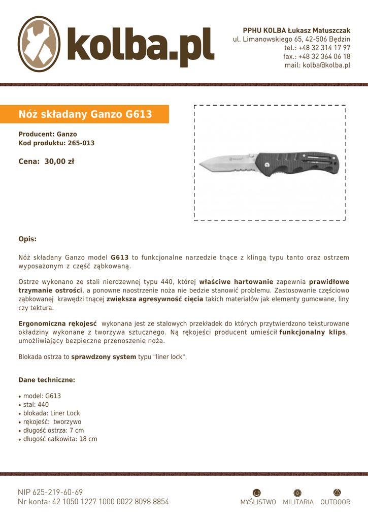 Nóż składany Ganzo G613 Producent: Ganzo Kod produktu: 265-013 Cena: 30,00 zł Opis: Nóż składany Ganzo model G613 to funkcjonalne narzedzie tnące z klingą typu tanto oraz ostrzem wyposażonym z część ząbkowaną. Ostrze wykonano ze stali nierdzewnej typu 440, której właściwe hartowanie zapewnia prawidłowe trzymanie ostrości, a ponowne naostrzenie noża nie bedzie stanowić problemu. Zastosowanie częściowo ząbkowanej krawędzi tnącej zwiększa agresywność cięcia takich materiałów jak elementy gumowane, liny czy tektura. Ergonomiczna rękojesć wykonana jest ze stalowych przekładek do których przytwierdzono teksturowane okładziny wykonane z tworzywa sztucznego. Ną rękojeści producent umieścił funkcjonalny klips, umożliwiający bezpieczne przenoszenie noża. Blokada ostrza to sprawdzony system typu "liner lock". Dane techniczne: ● ● ● ● ● ● model: G613 stal: 440 blokada: Liner Lock rękojeść: tworzywo długość ostrza: 7 cm długość całkowita: 18 cm ● grubość ostrza: 2,5 mm Gwarancja 12 miesięcy.