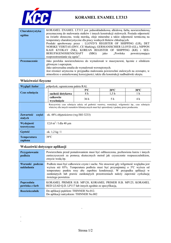 KORAMEL ENAMEL LT313 Charakterystyka ogólna KORAMEL ENAMEL LT313 jest jednoskładnikową alkidową farbą nawierzchniową przeznaczoną do malowania statków i innych konstrukcji stalowych. Posiada odporność na światło słoneczne, wodę morską, oleje mineralne a takŜe odporność termiczną na temperatury charakterystyczne dla pracy wodnych bloków chłodzących. Produkt aprobowany przez : LLOYD’S REGISTER OF SHIPPING (LR), DET NORSKE VERITAS (DNV, CE Marking), GERMANISCHIER LLOYD (GL), NIPPON KAIJI KYOKAY (NK), KOREAN REGISTER OF SHIPPING (KR) i SEEBERUFSGENOSSENSCHAFT (SBG) jako „Powłoka powstrzymująca rozprzestrzenianie się ognia”. Przeznaczenie Jako powłoka nawierzchniowa do wymalowań w maszynowni, łącznie z silnikiem głównym i osprzętem. Jako uniwersalna emalia do wymalowań wewnętrznych. Jest równieŜ uŜyteczna w przypadku malowania powierzchni stalowych na zewnątrz, w atmosferze o umiarkowanej korozyjności; takŜe dla konstrukcji nadbudówki okrętu. Właściwości fizyczne Wygląd i kolor Czas schnięcia półpołysk; ograniczona paleta RAL 5ºC 8h suchość dotykowa całkowite 36 h wyschnięcie 20ºC 1,5 h 30ºC 1h 5h 4h Rzeczywisty czas schnięcia zaleŜy od grubości warstwy, wentylacji, wilgotności itp., czas schnięcia właściwy dla innych warunków klimatycznych musi być sprawdzony i podany przez producenta. Zawartość stałych części ok. 48% objętościowo (wg ISO 3233) Wydajność teoretyczna 12,0 m2 / l dla 40 µm Gęstość ok. 1,2 kg / l Temperatura zapłonu 38ºC Wskazówki dotyczące aplikacji Przygotowanie podłoŜa Powierzchnia przed pomalowaniem musi być odtłuszczona, pozbawiona kurzu i innych zanieczyszczeń za pomocą skutecznych metod jak czyszczenie rozpuszczalnikiem, zmycie wodą itp. Warunki podczas nakładania PodłoŜe musi być całkowicie czyste i suche. Nie stosować gdy wilgotność względna jest wyŜsza niŜ 85%. Temperatura podłoŜa musi być przynajmniej o 3ºC wyŜsza od temperatury punktu rosy aby zapobiec kondensacji. W przypadku aplikacji w zamkniętych lub prawie zamkniętych przestrzeniach naleŜy zapewnić cyrkulację świeŜego powietrza Poprzednia powłoka z farb KORAMEL PRIMER H.B. MP120, KORAMEL PRIMER H.B. MP125, KORAMEL RED LEAD Q.D. LP117 lub innych zgodnie ze specyfikacją. Rozcieńczalnik Do aplikacji pędzlem: THINNER No.012. Do aplikacji natryskiem: THINNER No.002 . . . Strona 1/2 KORAMEL ENAMEL LT313 Sposób aplikacji Nakładać natryskiem (bezpowietrznym lub konwencjonalnym), wałkiem lub pędzlem. Natrysk bezpowietrzny: rozmiar dyszy: 0,017-0,023’’ ciśnienie: 14,5 MPa kąt dyszy 40 - 60º. (Podano przykładowe parametry natrysku bezpowietrznego.) Typowa grubość powłoki 40 µm na sucho Interwał czasowy do nakładania następnych powłok W temperaturze 20oC: Minimalny: 6 h, Maksymalny: Nieograniczony. Przed aplikacją następnej powłoki naleŜy usunąć z powierzchni: zatłuszczenia, sole, produkty kredowania i inne zanieczyszczenia starej, sezonowanej powłoki, poprzez dokładne czyszczenie rozpuszczalnikiem lub mycie bieŜącą wodą. Okres przechowywania 12 miesięcy Odporność na temperaturę Ekspozycja ciągła: 93ºC (nie dotyczy ekspozycji w zanurzeniu) Działanie periodyczne: 121ºC (nie dotyczy ekspozycji w zanurzeniu) Odporność chemiczna Rozprysk, zwilŜanie Opary Zanurzenie Opakowanie BHP Data wydania Kwasy Zasady Rozpuszczalniki Woda morska Woda bieŜaca Nie zalecane Nie zalecane Nie zalecane Dobra Doskonała Słaba Słaba Słaba Dobra Doskonała Nie zalecane Nie zalecane Nie zalecane Nie zalecane Nie zalecane 18 l. Zabezpieczyć skórę i oczy, a takŜe zapobiegać wdychaniu oparów poprzez właściwą wentylację. W wypadku aplikacji w pomieszczeniach kiepsko wentylowanych zaleca się stosowanie dodatkowo środków ochrony osobistej dróg oddechowych. Przechowywać z dala od źródła iskier i otwartego ognia. Kwiecień 2008 Informacje zawarte w karcie technicznej zostały podane na podstawie badań laboratoryjnych i mogą nieznacznie odbiegać od stanu faktycznego dla danej partii produkcyjnej. Zalecamy posługiwanie się nimi jako wskaźnikami natury ogólnej. Wszystkie zalecenia dotyczące stosowania produktów są opracowane dla osób o odpowiedniej wiedzy technicznej, zostały oparte o aktualny stan wiedzy i są wiarygodne. Producent i sprzedawca nie ma wpływu na jakość aplikacji, stan powierzchni, warunków aplikacji oraz innych czynników mających wpływ na jakość powłoki. W związku z powyŜszym producent ani sprzedawca nie ponoszą odpowiedzialności za straty i szkody spowodowane zastosowaniem produktu. Karta katalogowa moŜe ulec zmianie bez powiadomienia. Przed aplikacją produktu w obowiązku uŜytkownika jest upewnienie się co do aktualności karty technicznej. Strona 2/2