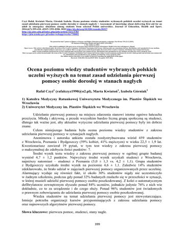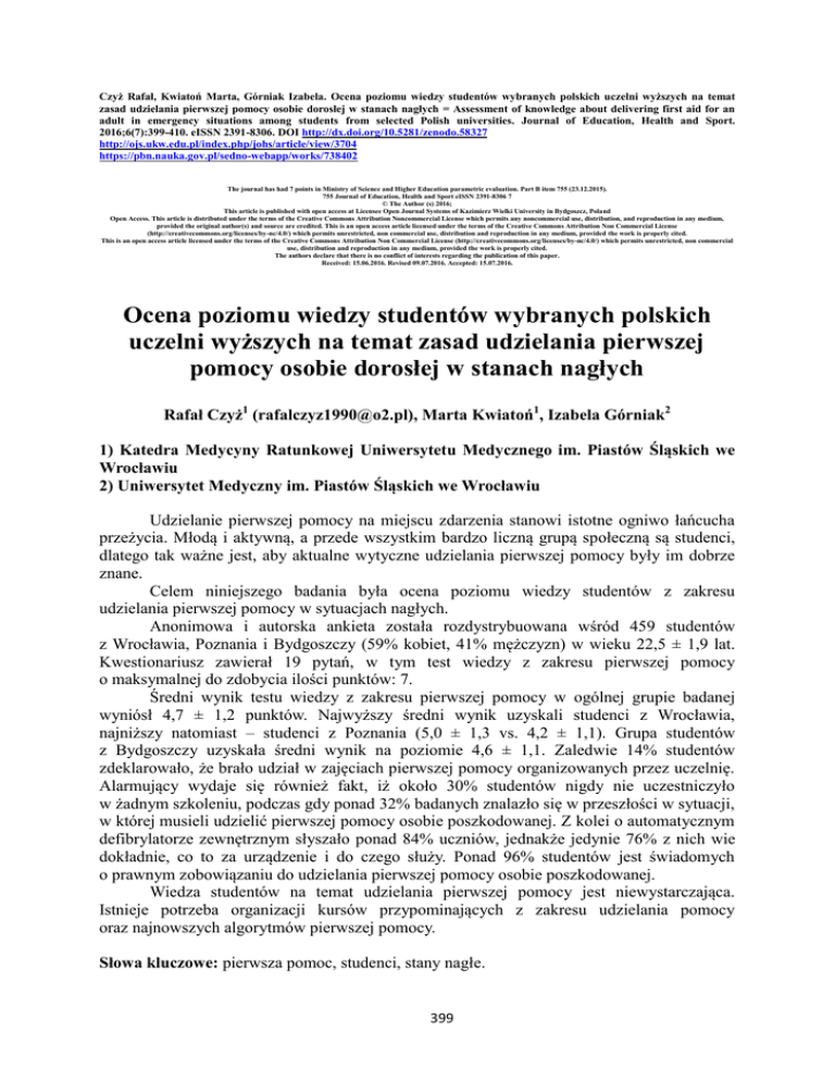 Czyż Rafał, Kwiatoń Marta, Górniak Izabela. Ocena poziomu wiedzy studentów wybranych polskich uczelni wyższych na temat zasad udzielania pierwszej pomocy osobie dorosłej w stanach nagłych = Assessment of knowledge about delivering first aid for an adult in emergency situations among students from selected Polish universities. Journal of Education, Health and Sport. 2016;6(7):399-410. eISSN 2391-8306. DOI http://dx.doi.org/10.5281/zenodo.58327 http://ojs.ukw.edu.pl/index.php/johs/article/view/3704 https://pbn.nauka.gov.pl/sedno-webapp/works/738402 The journal has had 7 points in Ministry of Science and Higher Education parametric evaluation. Part B item 755 (23.12.2015). 755 Journal of Education, Health and Sport eISSN 2391-8306 7 © The Author (s) 2016; This article is published with open access at Licensee Open Journal Systems of Kazimierz Wielki University in Bydgoszcz, Poland Open Access. This article is distributed under the terms of the Creative Commons Attribution Noncommercial License which permits any noncommercial use, distribution, and reproduction in any medium, provided the original author(s) and source are credited. This is an open access article licensed under the terms of the Creative Commons Attribution Non Commercial License (http://creativecommons.org/licenses/by-nc/4.0/) which permits unrestricted, non commercial use, distribution and reproduction in any medium, provided the work is properly cited. This is an open access article licensed under the terms of the Creative Commons Attribution Non Commercial License (http://creativecommons.org/licenses/by-nc/4.0/) which permits unrestricted, non commercial use, distribution and reproduction in any medium, provided the work is properly cited. The authors declare that there is no conflict of interests regarding the publication of this paper. Received: 15.06.2016. Revised 09.07.2016. Accepted: 15.07.2016. Ocena poziomu wiedzy studentów wybranych polskich uczelni wyższych na temat zasad udzielania pierwszej pomocy osobie dorosłej w stanach nagłych Rafał Czyż1 ([email protected]), Marta Kwiatoń1, Izabela Górniak2 1) Katedra Medycyny Ratunkowej Uniwersytetu Medycznego im. Piastów Śląskich we Wrocławiu 2) Uniwersytet Medyczny im. Piastów Śląskich we Wrocławiu Udzielanie pierwszej pomocy na miejscu zdarzenia stanowi istotne ogniwo łańcucha przeżycia. Młodą i aktywną, a przede wszystkim bardzo liczną grupą społeczną są studenci, dlatego tak ważne jest, aby aktualne wytyczne udzielania pierwszej pomocy były im dobrze znane. Celem niniejszego badania była ocena poziomu wiedzy studentów z zakresu udzielania pierwszej pomocy w sytuacjach nagłych. Anonimowa i autorska ankieta została rozdystrybuowana wśród 459 studentów z Wrocławia, Poznania i Bydgoszczy (59% kobiet, 41% mężczyzn) w wieku 22,5 ± 1,9 lat. Kwestionariusz zawierał 19 pytań, w tym test wiedzy z zakresu pierwszej pomocy o maksymalnej do zdobycia ilości punktów: 7. Średni wynik testu wiedzy z zakresu pierwszej pomocy w ogólnej grupie badanej wyniósł 4,7 ± 1,2 punktów. Najwyższy średni wynik uzyskali studenci z Wrocławia, najniższy natomiast – studenci z Poznania (5,0 ± 1,3 vs. 4,2 ± 1,1). Grupa studentów z Bydgoszczy uzyskała średni wynik na poziomie 4,6 ± 1,1. Zaledwie 14% studentów zdeklarowało, że brało udział w zajęciach pierwszej pomocy organizowanych przez uczelnię. Alarmujący wydaje się również fakt, iż około 30% studentów nigdy nie uczestniczyło w żadnym szkoleniu, podczas gdy ponad 32% badanych znalazło się w przeszłości w sytuacji, w której musieli udzielić pierwszej pomocy osobie poszkodowanej. Z kolei o automatycznym defibrylatorze zewnętrznym słyszało ponad 84% uczniów, jednakże jedynie 76% z nich wie dokładnie, co to za urządzenie i do czego służy. Ponad 96% studentów jest świadomych o prawnym zobowiązaniu do udzielania pierwszej pomocy osobie poszkodowanej. Wiedza studentów na temat udzielania pierwszej pomocy jest niewystarczająca. Istnieje potrzeba organizacji kursów przypominających z zakresu udzielania pomocy oraz najnowszych algorytmów pierwszej pomocy. Słowa kluczowe: pierwsza pomoc, studenci, stany nagłe. 399 Assessment of knowledge about delivering first aid for an adult in emergency situations among students from selected Polish universities Delivering first aid at the spot of the accident is an essential link of the survival chain. A young and active socially group like students should know current first aid guidelines. The aim of this study was to evaluate the level of students' knowledge in delivering first aid in emergency situations. Anonymous and author’s survey was carried out on a group of 459 students from Wrocław, Poznań and Bydgoszcz (59% women, 41% men) aged 22.5 ± 1.9. The questionnaire comprised of 19 questions about general experience with first aid and quiz questions about practical knowledge in first aid delivery. The maximal amount of points to obtain in the quiz was 7. The average result for the quiz section of the questionnaire for the entire examined group amounted to 4.7 ± 1.2 points. The highest average result got students from Wrocław and the lowest average result got students from Poznań (5.0 ± 1.3 vs. 4.2 ± 1.1). Student group from Bydgoszcz achieved the average result of 4.6 ± 1.1 points. Only 14% of students declared participation in lessons about delivering first aid organized by the college. Also alarming seems the fact that about 30% of the students never took part in such training. Over the 32% of the examined students was in an emergency situation that required them to provide first help to an injured person. About the automated external defibrillator heard over the 84% of those surveyed, however, only 76% of them know exactly what it is and what the device is used for. Over the 96% of the students are aware of the material fact of obliging to delivering first aid to an injured person. Students knowle