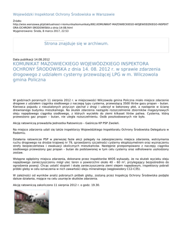 Wojewódzki Inspektorat Ochrony Środowiska w Warszawie Źródło: http://wios.warszawa.pl/pl/aktualnosci-i-komunika/komunikaty/692,KOMUNIKAT-MAZOWIECKIEGO-WOJEWODZKIEGO-INSPEKT ORA-OCHRONY-SRODOWISKA-z-dnia-14-08.html Wygenerowano: Środa, 8 marca 2017, 22:53 Strona znajduje się w archiwum. Data publikacji 14.08.2012 KOMUNIKAT MAZOWIECKIEGO WOJEWÓDZKIEGO INSPEKTORA OCHRONY ŚRODOWISKA z dnia 14. 08. 2012 r. w sprawie zdarzenia drogowego z udziałem cysterny przewożącej LPG w m. Wilczowola gmina Policzna W godzinach porannych 11 sierpnia 2012 r. w miejscowości Wilczowola gmina Policzna miało miejsce zdarzenie drogowe z udziałem ciągnika siodłowego z naczepą typu cysterna, przewożącą 3500 litrów gazu propan – butan. Kierowca pojazdu z nieustalonych przyczyn zjechał z drogi i uderzył w betonowy płot, a następnie w ścianę drewnianego budynku mieszkalnego. Na skutek zdarzenia nastąpiło rozszczelnienie zbiorników magazynowych oleju napędowego ciągnika siodłowego, z których wyciekło do ziemi kilkaset litrów paliwa. Cysterna, którą przewożono gaz propan – butan, nie uległa rozszczelnieniu. Osób poszkodowanych nie było. Akcję ratowniczą prowadziła Jednostka Ratowniczo – Gaśnicza KP PSP Zwoleń. Na miejsce zdarzenia udali się także inspektorzy Wojewódzkiego Inspektoratu Ochrony Środowiska Delegatura w Radomiu. Działania ratownicze PSP w pierwszej fazie akcji polegały na zabezpieczeniu miejsca zdarzenia, wstrzymania ruchu drogowego na drodze krajowej nr 79, sprawdzeniu szczelności cysterny eksplozymetrem oraz wyznaczeniu strefy bezpieczeństwa i ewakuacji okolicznych mieszkańców. Następnie przepompowano z naczepy ciągnika siodłowego przewożony gaz propan – butan do podstawionej w tym celu cysterny oraz odholowano uszkodzony zestaw. Wstępne oględziny miejsca zdarzenia, dokonane przez inspektorów WIOŚ wykazały, że na skutek wycieku oleju napędowego zanieczyszczeniu mógł ulec teren o powierzchni około 40 – 60 m2, przylegający bezpośrednio do ogrodzenia posesji. Chcąc ustalić stopień i skalę zanieczyszczenia ziemi olejem napędowym, inspektorzy pobrali próbki gleby w celu oznaczenia w nich zawartości oleju mineralnego (węglowodory C12-C35). W zależności od wyników analiz pobranych próbek gleby, zostaną przez Inspekcję Ochrony Środowiska podjęte dalsze działania, mające na celu usunięcie skutków zdarzenia. Akcję ratowniczą zakończono 11 sierpnia 2012 r. o godz. 19.30. Data publikacji 14.08.2012 Data modyfikacji 14.08.2012Rejestr zmian Liczba wizyt: 866 Autor: Tomasz Klech Opublikowane przez Iwona Kalinowska-Witowska
