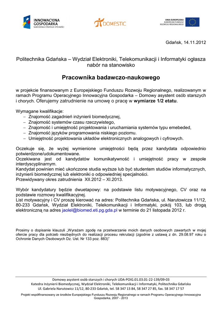 Gdańsk, 14.11.2012 Politechnika Gdańska – Wydział Elektroniki, Telekomunikacji i Informatyki ogłasza nabór na stanowisko Pracownika badawczo-naukowego w projekcie finansowanym z Europejskiego Funduszu Rozwoju Regionalnego, realizowanym w ramach Programu Operacyjnego Innowacyjna Gospodarka – Domowy asystent osób starszych i chorych. Oferujemy zatrudnienie na umowę o pracę w wymiarze 1/2 etatu. Wymagane kwalifikacje: − Znajomość zagadnień inŜynierii biomedycznej, − Znajomość systemów czasu rzeczywistego, − Znajomość i umiejętność projektowania i uruchamiania systemów typu emebeded, − Znajomość języków programowania niskiego poziomu. − Umiejętność projektowania układów elektronicznych analogowych i cyfrowych. Oczekuje się, Ŝe wyŜej wymienione umiejętności będą przez kandydata odpowiednio potwierdzone/udokumentowane. Oczekiwana jest od kandydatów komunikatywność i umiejętność pracy w zespole interdyscyplinarnym. Kandydat powinien mieć ukończone studia wyŜsze lub być studentem studiów informatycznych, inŜynierii biomedycznej lub elektroniki o odpowiedniej specjalności. Przewidywany okres zatrudnienia XII.2012 – XI.2013. Wybór kandydatury będzie dwuetapowy: na podstawie listu motywacyjnego, CV oraz na podstawie rozmowy kwalifikacyjnej. List motywacyjny i CV proszę kierować na adres: Politechnika Gdańska, ul. Narutowicza 11/12, 80-233 Gdańsk, Wydział Elektroniki, Telekomunikacji i Informatyki, pokój 103, lub drogą elektroniczną na adres [email protected] w terminie do 21 listopada 2012 r. Prosimy o dopisanie klauzuli „WyraŜam zgodę na przetwarzanie moich danych osobowych zawartych w mojej ofercie pracy dla potrzeb niezbędnych do realizacji procesu rekrutacji (zgodnie z ustawą z dn. 29.08.97 roku o Ochronie Danych Osobowych Dz. Ust. Nr 133 poz. 883)” Domowy asystent osób starszych i chorych UDA-POIG.01.03.01-22-139/09-03 Katedra Inżynierii Biomedycznej, Wydział Elektroniki, Telekomunikacji i Informatyki, Politechnika Gdańska Ul. Gabriela Narutowicz 11/12, 80-233 Gdańsk, tel. 58 347 13 84, 58 347 27 85, fax. 58 347 17 57 Projekt współfinansowany ze środków Europejskiego Funduszu Rozwoju Regionalnego w ramach Programu Operacyjnego Innowacyjna Gospodarka, 2007 - 2013