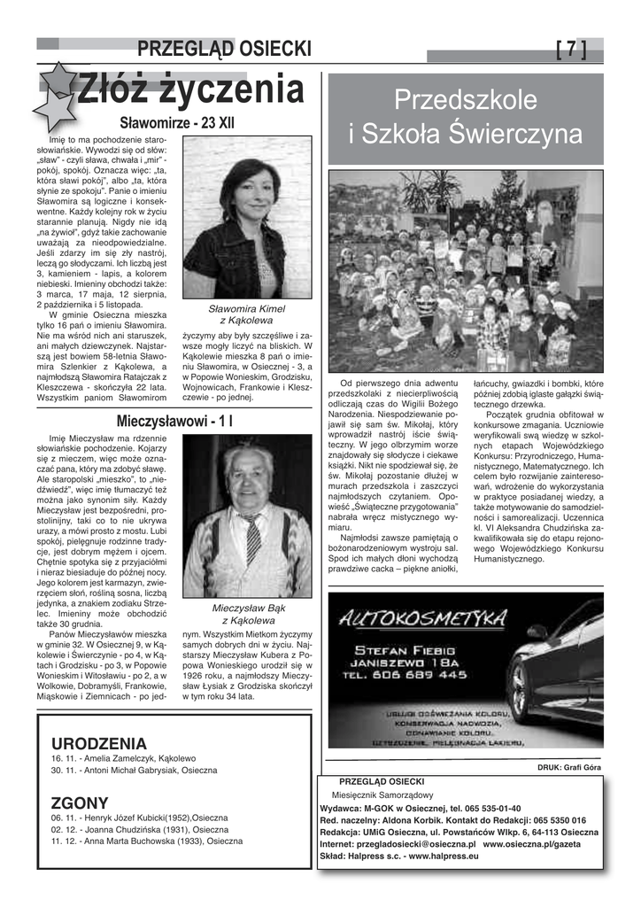 PRZEGLĄD OSIECKI ZłóŜ Ŝyczenia Sławomirze - 23 XII Imię to ma pochodzenie starosłowiańskie. Wywodzi się od słów: „sław” - czyli sława, chwała i „mir” pokój, spokój. Oznacza więc: „ta, która sławi pokój”, albo „ta, która słynie ze spokoju”. Panie o imieniu Sławomira są logiczne i konsekwentne. Każdy kolejny rok w życiu starannie planują. Nigdy nie idą „na żywioł”, gdyż takie zachowanie uważają za nieodpowiedzialne. Jeśli zdarzy im się zły nastrój, leczą go słodyczami. Ich liczbą jest 3, kamieniem - lapis, a kolorem niebieski. Imieniny obchodzi także: 3 marca, 17 maja, 12 sierpnia, 2 października i 5 listopada. W gminie Osieczna mieszka tylko 16 pań o imieniu Sławomira. Nie ma wśród nich ani staruszek, ani małych dziewczynek. Najstarszą jest bowiem 58-letnia Sławomira Szlenkier z Kąkolewa, a najmłodszą Sławomira Ratajczak z Kleszczewa - skończyła 22 lata. Wszystkim paniom Sławomirom Przedszkole i Szkoła Świerczyna Sławomira Kimel z Kąkolewa życzymy aby były szczęśliwe i zawsze mogły liczyć na bliskich. W Kąkolewie mieszka 8 pań o imieniu Sławomira, w Osiecznej - 3, a w Popowie Wonieskim, Grodzisku, Wojnowicach, Frankowie i Kleszczewie - po jednej. Mieczysławowi - 1 I Imię Mieczysław ma rdzennie słowiańskie pochodzenie. Kojarzy się z mieczem, więc może oznaczać pana, który ma zdobyć sławę. Ale staropolski „mieszko”, to „niedźwiedź”, więc imię tłumaczyć też można jako synonim siły. Każdy Mieczysław jest bezpośredni, prostolinijny, taki co to nie ukrywa urazy, a mówi prosto z mostu. Lubi spokój, pielęgnuje rodzinne tradycje, jest dobrym mężem i ojcem. Chętnie spotyka się z przyjaciółmi i nieraz biesiaduje do późnej nocy. Jego kolorem jest karmazyn, zwierzęciem słoń, rośliną sosna, liczbą jedynka, a znakiem zodiaku Strzelec. Imieniny może obchodzić także 30 grudnia. Panów Mieczysławów mieszka w gminie 32. W Osiecznej 9, w Kąkolewie i Świerczynie - po 4, w Kątach i Grodzisku - po 3, w Popowie Wonieskim i Witosławiu - po 2, a w Wolkowie, Dobramyśli, Frankowie, Miąskowie i Ziemnicach - po jed- [7] Od pierwszego dnia adwentu przedszkolaki z niecierpliwością odliczają czas do Wigilii Bożego Narodzenia. Niespodziewanie pojawił się sam św. Mikołaj, który wprowadził nastrój iście świąteczny. W jego olbrzymim worze znajdowały się słodycze i ciekawe książki. Nikt nie spodziewał się, że św. Mikołaj pozostanie dłużej w murach przedszkola i zaszczyci najmłodszych czytaniem. Opowieść „Świąteczne przygotowania” nabrała wręcz mistycznego wymiaru. Najmłodsi zawsze pamiętają o bożonarodzeniowym wystroju sal. Spod ich małych dłoni wychodzą prawdziwe cacka – piękne aniołki, łańcuchy, gwiazdki i bombki, które później zdobią iglaste gałązki świątecznego drzewka. Początek grudnia obfitował w konkursowe zmagania. Uczniowie weryfikowali swą wiedzę w szkolnych etapach Wojewódzkiego Konkursu: Przyrodniczego, Humanistycznego, Matematycznego. Ich celem było rozwijanie zainteresowań, wdrożenie do wykorzystania w praktyce posiadanej wiedzy, a także motywowanie do samodzielności i samorealizacji. Uczennica kl. VI Aleksandra Chudzińska zakwalifikowała się do etapu rejonowego Wojewódzkiego Konkursu Humanistycznego. Mieczysław Bąk z Kąkolewa nym. Wszystkim Mietkom życzymy samych dobrych dni w życiu. Najstarszy Mieczysław Kubera z Popowa Wonieskiego urodził się w 1926 roku, a najmłodszy Mieczysław Łysiak z Grodziska skończył w tym roku 34 lata. URODZENIA 16. 11. - Amelia Zamelczyk, Kąkolewo 30. 11. - Antoni Michał Gabrysiak, Osieczna ZGONY 06. 11. - Henryk Józef Kubicki(1952),Osieczna 02. 12. - Joanna Chudzińska (1931), Osieczna 11. 12. - Anna Marta Buchowska (1933), Osieczna PRZEGLĄD OSIECKI Miesięcznik Samorządowy DRUK: Grafi Góra Wydawca: M-GOK w Osiecznej, tel. 065 535-01-40 Red. naczelny: Aldona Korbik. Kontakt do Redakcji: 065 5350 016 Redakcja: UMiG Osieczna, ul. Powstańców Wlkp. 6, 64-113 Osieczna Internet: [email protected] www.osieczna.pl/gazeta Skład: Halpress s.c. - www.halpress.eu