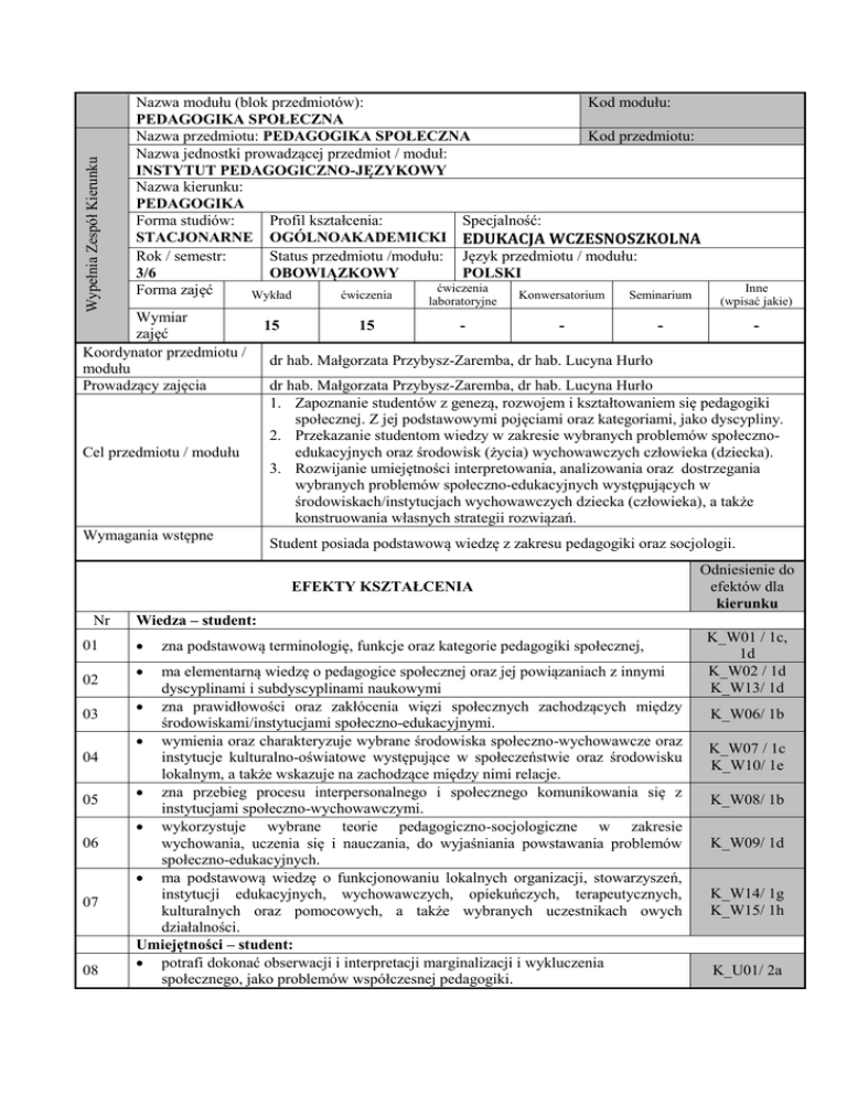 Wypełnia Zespół Kierunku Nazwa modułu (blok przedmiotów): Kod modułu: PEDAGOGIKA SPOŁECZNA Nazwa przedmiotu: PEDAGOGIKA SPOŁECZNA Kod przedmiotu: Nazwa jednostki prowadzącej przedmiot / moduł: INSTYTUT PEDAGOGICZNO-JĘZYKOWY Nazwa kierunku: PEDAGOGIKA Forma studiów: Profil kształcenia: Specjalność: STACJONARNE OGÓLNOAKADEMICKI EDUKACJA WCZESNOSZKOLNA Rok / semestr: Status przedmiotu /modułu: Język przedmiotu / modułu: 3/6 OBOWIĄZKOWY POLSKI ćwiczenia Forma zajęć Wykład ćwiczenia Konwersatorium Seminarium laboratoryjne Wymiar zajęć Koordynator przedmiotu / modułu Prowadzący zajęcia Cel przedmiotu / modułu Wymagania wstępne 15 15 - - - 01 02 03 04 05 06 07 08 - dr hab. Małgorzata Przybysz-Zaremba, dr hab. Lucyna Hurło dr hab. Małgorzata Przybysz-Zaremba, dr hab. Lucyna Hurło 1. Zapoznanie studentów z genezą, rozwojem i kształtowaniem się pedagogiki społecznej. Z jej podstawowymi pojęciami oraz kategoriami, jako dyscypliny. 2. Przekazanie studentom wiedzy w zakresie wybranych problemów społecznoedukacyjnych oraz środowisk (życia) wychowawczych człowieka (dziecka). 3. Rozwijanie umiejętności interpretowania, analizowania oraz dostrzegania wybranych problemów społeczno-edukacyjnych występujących w środowiskach/instytucjach wychowawczych dziecka (człowieka), a także konstruowania własnych strategii rozwiązań. Student posiada podstawową wiedzę z zakresu pedagogiki oraz socjologii. EFEKTY KSZTAŁCENIA Nr Inne (wpisać jakie) Odniesienie do efektów dla kierunku Wiedza – student: zna podstawową terminologię, funkcje oraz kategorie pedagogiki społecznej, ma elementarną wiedzę o pedagogice społecznej oraz jej powiązaniach z innymi dyscyplinami i subdyscyplinami naukowymi zna prawidłowości oraz zakłócenia więzi społecznych zachodzących między środowiskami/instytucjami społeczno-edukacyjnymi. wymienia oraz charakteryzuje wybrane środowiska społeczno-wychowawcze oraz instytucje kulturalno-oświatowe występujące w społeczeństwie oraz środowisku lokalnym, a także wskazuje na zachodzące między nimi relacje. zna przebieg procesu interpersonalnego i społecznego komunikowania się z instytucjami społeczno-wychowawczymi. wykorzystuje wybrane teorie pedagogiczno-socjologiczne w zakresie wychowania, uczenia się i nauczania, do wyjaśniania powstawania problemów społeczno-edukacyjnych. ma podstawową wiedzę o funkcjonowaniu lokalnych organizacji, stowarzyszeń, instytucji edukacyjnych, wychowawczych, opiekuńczych, terapeutycznych, kulturalnych oraz pomocowych, a także wybranych uczestnikach owych działalności. Umiejętności – student: potrafi dokonać obserwacji i interpretacji marginalizacji i wykluczenia społecznego, jako problemów współczesnej pedagogiki. K_W01 / 1c, 1d K_W02 / 1d K_W13/ 1d K_W06/ 1b K_W07 / 1c K_W10/ 1e K_W08/ 1b K_W09/ 1d K_W14/ 1g K_W15/ 1h K_U01/ 2a 09 10 11 12 13 potrafi wykorzystywać wiedzę pedagogiczno-socjologiczną do analizowania i interpretowania wybranych problemów społeczno-edukacyjnych oraz projektowania własnych strategii ich rozwiązywania. potrafi wykorzystać wiedzę pedagogiczno-socjologiczną do analizowania motywów i wzorów (niewłaściwych) ludzkich zachowań, diagnozowania i prognozowania sytuacji, a także konstruowania strategii działań praktycznych w kontekście działalności pedagogicznej. potrafi przekazywać wiedzę dotyczącą głównych środowisk wychowawczych człowieka (dziecka) oraz wskazać różnorodne problemy i zagrożenia. potrafi dokonywać analizy własnych działań w zakresie konstruowania strategii działań praktycznych oraz dostrzec obszary wymagające dopracowania, uzupełnienia oraz poszerzenia wiedzy w danym zakresie. Kompetencje społeczne ma świadomość poziomu swojej wiedzy i umiejętności, rozumie potrzebę ciągłego dokształcania się zawodowego i rozwoju osobistego, dokonuje samooceny własnych kompetencji i doskonali umiejętności, wyznacza kierunki własnego rozwoju i kształcenia K_U02/ 2b K_U10/ 2h K_U03/ 2c K_U08/ 2f K_U14/ 2n K_K01 / 3a podejmuje dyskusje w zakresie problemów więzi społecznych zachodzących K_K02 / 3b między środowiskami/instytucjami społeczno-edukacyjnymi oraz wyraża własne opinie ich rozwiązania. wykazuje zainteresowanie angażowaniem się w rozwiązywanie wybranych K_K03 / 3b 15 problemów występujących w środowiskach społeczno-wychowawczych człowieka (dziecka) dyskutuje o problemach etyczno-moralnych związanych z funkcjonowaniem K_K05 / 3c 16 środowisk (instytucji) wychowawczych człowieka (dziecka) oraz wskazuje ewentualne ich rozwiązania. TREŚCI PROGRAMOWE Forma zajęć – WYKŁAD 1. Geneza, funkcje oraz podstawowe pojęcia i kategorie pedagogiki społecznej. 2. Czołowi przedstawiciele oraz ich wkład w rozwój pedagogiki społecznej (Helena Radlińska, Aleksander Kamiński, Ryszard Wroczyński, Stanisław Kowalski itp.). 3. Pedagogika społeczna a praca socjalna. 4. Praca kulturalno-oświatowa i jej znaczenie dla pedagogiki społecznej. 5. Poradnictwo w teorii i praktyce. 6. Marginalizacja i wykluczenie – problem pedagogiki społecznej. 7. Edukacja ustawiczna i jej związek z pedagogiką społeczną. Forma zajęć – ĆWICZENIA 1. Główne środowiska wychowawcze człowieka, definicje, funkcje, przemiany, problemy i zagrożenia oraz rozwiązania praktyczne: rodzina – jej znaczenie dla jednostki i społeczeństwa, szkoła, jako środowisko społeczno-wychowawcze dziecka, grupa rówieśnicza, jako środowisko wychowawcze dziecka, organizacje i stowarzyszenia występujące w środowisku lokalnym i ich znaczenie dla jednostki i społeczeństwa, zakład pracy, jako środowisko „życia” człowieka, 2. Wybrane problemy społeczno-edukacyjne – autorskie propozycje rozwiązań: ubóstwo, bieda, bezrobocie – jako problem społeczny, agresja i przemoc – problem współczesnej szkoły, społeczne przyczyny powodzeń i niepowodzeń szkolnych, Prezentacja multimedial