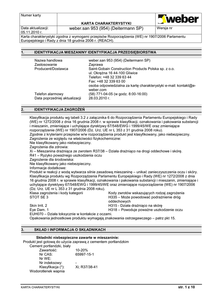 Numer karty KARTA CHARAKTERYSTYKI Data aktualizacji: Wersja nr weber.san 953 (954) (Deitermann SP) 05.11.2010 r. Karta charakterystyki zgodna z wymogami przepisów Rozporządzenia (WE) nr 1907/2006 Parlamentu Europejskiego i Rady z dnia 18 grudnia 2006 r. (REACH). 1. IDENTYFIKACJA MIESZANINY IDENTYFIKACJA PRZEDSIĘBIORSTWA Nazwa handlowa Zastosowanie Producent/Dostawca Telefon alarmowy Data poprzedniej aktualizacji 2. weber.san 953 (954) (Deitermann SP) Zaprawa Saint-Gobain Construction Products Polska sp. z o.o. ul. OkręŜna 16 44-100 Gliwice Telefon: +48 32 339 63 44 Fax: +48 32 339 63 00 osoba odpowiedzialna za kartę charakterystyki e-mail: [email protected] (58) 771-04-05 (w godz. 8:00-16:00) 28.03.2010 r. IDENTYFIKACJA ZAGROśEŃ Klasyfikacja produktu wg tabeli 3.2 z załącznika 6 do Rozporządzenia Parlamentu Europejskiego i Rady (WE) nr 1272/2008 z dnia 16 grudnia 2008 r. w sprawie klasyfikacji, oznakowania i pakowania substancji i mieszanin, zmieniające i uchylające dyrektywy 67/548/EWG i 1999/45/WE oraz zmieniające rozporządzenie (WE) nr 1907/2006 (Dz. Urz. UE nr L 353 z 31 grudnia 2008 roku). Zgodnie z kryteriami przepisów w/w rozporządzenia produkt jest klasyfikowany, jako niebezpieczny. ZagroŜenia ze względu na właściwości fizykochemiczne: Nie klasyfikowany jako niebezpieczny. ZagroŜenia dla zdrowia: Xi – Mieszanina draŜniąca ze zwrotem R37/38 – Działa draŜniąco na drogi oddechowe i skórę. R41 – Ryzyko powaŜnego uszkodzenia oczu ZagroŜenie dla środowiska: Nie klasyfikowany jako niebezpieczny. Informacje dodatkowe: Produkt w reakcji z wodą wytwarza silnie zasadową mieszaninę – unikać zanieczyszczenia oczu i skóry. Klasyfikacja produktu wg Rozporządzenia Parlamentu Europejskiego i Rady (WE) nr 1272/2008 z dnia 16 grudnia 2008 r. w sprawie klasyfikacji, oznakowania i pakowania substancji i mieszanin, zmieniające i uchylające dyrektywy 67/548/EWG i 1999/45/WE oraz zmieniające rozporządzenie (WE) nr 1907/2006 (Dz. Urz. UE nr L 353 z 31 grudnia 2008 roku). Klasa zagroŜenia i kody kategorii Kody zwrotów wskazujących rodzaj zagroŜenia STOT SE 3 H335 – MoŜe powodować podraŜnienie dróg oddechowych Skin Irrit. 2 H315 - Działa draŜniąco na skórę Eye Dam. 1 H318 – Powoduje powaŜne uszkodzenie oczu EUH070 – Działa toksycznie w kontakcie z oczami. Opakowania jednostkowe produktu wymagają znakowania ostrzegawczego – patrz pkt 15. 3. SKŁAD I INFORMACJA O SKŁADNIKACH Składniki niebezpieczne zawarte w mieszaninie: Produkt jest gotową do uŜycia zaprawą z cementem portlandzkim Cement portlandzki, biały Zawartość: 10-20% Nr CAS: 65997-15-1 Nr WE: Nr indeksowy: Klasyfikacja (*): Xi; R37/38-41 Wodorotlenek wapnia KARTA CHARAKTERYSTYKI str. 1 z 10 Numer karty KARTA CHARAKTERYSTYKI Data aktualizacji: Wersja nr weber.san 953 (954) (Deitermann SP) 05.11.2010 r. Karta charakterystyki zgodna z wymogami przepisów Rozporządzenia (WE) nr 1907/2006 Parlamentu Europejskiego i Rady z dnia 18 grudnia 2006 r. (REACH). 3. SKŁAD I INFORMACJA O SKŁADNIKACH Zawartość: Nr CAS: Nr WE: Nr indeksowy: Klasyfikacja (*): Cement portlandzki, szary Zawartość: Nr CAS: Nr WE: Nr indeksowy: Klasyfikacja (*): 5-10% 1305-62-0 215-137-3 R37/38-41 1-2% 65997-15-1 266-043-4 Xi; R37/38-41 R43 Zawartość chromu jest mniejsza niŜ 2 ppm, w związku, z czym nie ma potrzeby oznakowania produktu ze zwrotem R43. (*) - substancja nie klasyfikowana zgodnie z tabelą 3.2 z załącznika 6 do Rozporządzenia Parlamentu Europejskiego i Rady (WE) nr 1272/2008 z dnia 16 grudnia 2008 r. w sprawie klasyfikacji, oznakowania i pakowania substancji i mieszanin, zmieniające i uchylające dyrektywy 67/548/EWG i 1999/45/WE oraz zmieniające rozporządzenie (WE) nr 1907/2006 (Dz. Urz. UE nr L 353 z 31 grudnia 2008 roku). Klasyfikacja producenta. Klasyfikacja składników produktu wg Rozporządzenia Parlamentu Europejskiego i Rady (WE) nr 1272/2008 z dnia 16 grudnia 2008 r. w sprawie klasyfikacji, oznakowania i pakowania substancji i mieszanin, zmieniające i uchylające dyrektywy 67/548/EWG i 1999/45/WE oraz zmieniające rozporządzenie (WE) nr 1907/2006 (Dz. Urz. UE nr L 353 z 31 grudnia 2008 roku). Cement portlandzki, biały 10-20% Zawartość: 65997-15-1 Nr CAS: Nr WE: Nr indeksowy: Klasyfikacja (*): Klasa zagroŜenia i kody Kody zwrotów wskazujących rodzaj zagroŜenia kategorii STOT SE 3 H335 – MoŜe powodować podraŜnienie dróg oddechowych Skin Irrit. 2 H315 – Działa draŜniąco na skórę Eye Dam. 1 H318 – Powoduje powaŜne uszkodzenie oczu Wodorotlenek wapnia Zawartość: 5-10% 1305-62-0 Nr CAS: 215-137-3 Nr WE: Nr indeksowy: Klasyfikacja (*): STOT SE 3 H335 – MoŜe powodować podraŜnienie dróg oddechowych Skin Irrit. 2 H315 - Działa draŜniąco na skórę Eye Dam. 1 H318 – Powoduje powaŜne uszkodzenie oczu Cement portlandzki, szary Zawartość: 1-2% Nr CAS: 65997-15-1 Nr WE: 266-043-4 Nr indeksowy: Klasyfikacja (*): Klasa zagroŜenia i kody Kody zwrotów wskazujących rodzaj zagroŜenia kategorii STOT SE 3 H335 – MoŜe powodować podraŜnienie dróg oddechowych Skin Irrit. 2 H315 - Działa draŜniąco na skórę KARTA CHARAKTERYSTYKI str. 2 z 10 Numer karty KARTA CHARAKTERYSTYKI Data aktualizacji: Wersja nr weber.san 953 (954) (Deitermann SP) 05.11.2010 r. Karta charakterystyki zgodna z wymogami przepisów Rozporządzenia (WE) nr 1907/2006 Parlamentu Europejskiego i Rady z dnia 18 grudnia 2006 r. (REACH). 3. SKŁAD I INFORMACJA O SKŁADNIKACH Eye Dam. 1 H318 – Powoduje powaŜne uszkodzenie oczu Skin Sens. 1 H317 – MoŜe powodować reakcję alergiczną skóry. (*) – substancja niesklasyfikowana wg Rozporządzenia Parlamentu Europejskiego i Rady (WE) nr 1272/2008 z dnia 16 grudnia 2008 r. w sprawie klasyfikacji, oznakowania i pakowania substancji i mieszanin, zmieniające i uchylające dyrektywy 67/548/EWG i 1999/45/WE oraz zmieniające rozporządzenie (WE) nr 1907/2006 (Dz. Urz. UE nr L 353 z 31 grudnia 2008 roku). Klasyfikacja producenta.