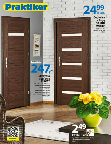 24 99 za opak. Cegiełka z fugą SAMUI WHITE opak. 0,43 m2, cena za m2 58,12 zł 470864 247,Skrzydło ramowe ELIOT* Tylko od 28.01 do 17.02.2016 r. L/P, kolor: orzech brown, zwiększona odporność na zarysowania, w ofercie: pokojowe, szer. 80 cm, łazienkowe, szer. 70 cm *cena nie obejmuje klamki 460734-5/40-1 2 49 PRYMULA* Kupuj online produkty z gazetki. wys. 15 cm, w doniczce o ø 10 cm, *cena nie obejmuje osłonki 381651 19 99 Wewnętrzny kamień dekoracyjny MALTA kolor: Sahara, opak. 0,48 m2, cena za m2 41,65 zł za opak. 419859 32 99 Wewnętrzny kamień dekoracyjny LOCARNO kolor: grafit, opak. 0,55 m2, cena za m2 59,98 zł za opak. 420761 35 3999 99 za opak. CENA Z KARTĄ 37 99 Kamień elewacyjny ROMA kolor: Sahara, opak. 0,62 m2, cena za m2 61,27 zł za opak. 291650 42 99 Kamień elewacyjny TOSCANIA opak. 0,58 m2, cena za m2 74,12 zł za opak. 413295 2 Dla zaradnych KLUBU PRAKTIKER Naturalny kamień dekoracyjny GINGER opak. 0,44 m2 ,11 szt. w opak., cena za m2 90,89 zł za opak. 370995 49 99 Naturalny kamień dekoracyjny BLACK opak. 0,44 m2 ,11 szt. w opak., cena za m2 113,61 zł za opak. 425041 Warszawa (Ząbki) M1 – CH Marki, ul. Radzymińska 303; Warszawa (Janki) Park Handlowy Janki, plac Szwedzki 4; Bytom M1 – CH, ul. Strzelców Bytomskich 96; Czeladź M1 – CH, ul. Będzińska 80; Częstochowa M1 – CH, ul. Kisielewskiego 8/16; Gdańsk, ul. Kołobrzeska 26; Grudziądz, ul. Konarskiego 47; Katowice, ul. Górnośląska 57; Kielce, ul. Radomska 8; Kraków M1 – CH, al. Pokoju 67; Leszno, al. Konstytucji 3 Maja 12; Lublin, ul. Mełgiewska 2c; 18 99 za m 2 4499 4999 za m2 za m2 Płytki ścienne STELLA wym. 25 x 40 cm, kolory: perla i crema, w ofercie również: płytki podłogowe, wym. 33,3 x 33,3 cm, kolory: perla i crema 27,99/m2 472357/63/70/4 32 99 za m 2 Płytki ścienne KIRIBATI wym. 25 x 36 cm, kolory: biały, niebieski i szary, w ofercie również: gresy, wym. 33,3 x 33,3 cm, kolory: biały, niebieski i szary 39,99/m2 458668/71/4/90/3/6 CENA Z KARTĄ KLUBU PRAKTIKER Gres szkliwiony OTIS wym. 60 x 60 cm, kolor: beż, rektyfikowany 475519 79 99 za m2 Gres polerowany SUPER WHITE wym. 60 x 60 cm, rektyfikowany 441463 Wszystkie płytki w I gatunku. Łódź M1 – CH, ul. Brzezińska 27/29; Łódź, ul. Wieniawskiego 1/3; Olsztyn, al. gen. Sikorskiego 2b; Opole Turawa Park – CH, ul. Dębowa 1; Piła, ul. 500-lecia Piły 5; Poznań M1 – CH, ul. Szwajcarska 14; Poznań CH Galeria Pestka, al. Solidarności 47; Radom M1 – CH, al. Grzecznarowskiego 28; Rybnik, ul. Żorska 16; Rzeszów, ul. Podkarpacka 4; Wrocław, ul. Krakowska 63/69; Zabrze M1 – CH, ul. Plutonowego R. Szkubacza 1 3 449,- Zestaw mebli REVENGE 149,- szer. 85 cm, kolor: biały, front MDF, lakierowany, w zestawie: szafka z umywalką, lustro z oświetleniem i szafką Szafka z umywalką* szer. 50 cm, kolor: biały, front lakierowany *cena nie obejmuje baterii 430557 400289 329,- 5999 54,- Wanna prostokątna SUPERO wym. 140 x 70 cm, akrylowa, w kpl.: nogi, dostępne inne wym. 348569 Deska WC wolnoopadająca CLAIRE twardy polipropylen, szybkie wypinanie 473100 CENA Z KARTĄ KLUBU PRAKTIKER 189,Kompakt WC KANCLERO w zestawie: deska woolnoopadająca duroplast 477850 4 Kredyt 10 x 0% * W ramach Umowy kredytu ratalnego i umowy o limit kredytowy i o kartę kredytową zbliżeniową MasterCard RRSO dla całkowitej kwoty kredytu ratalnego w wysokości 1 281,56 zł, dla 10 rat w kwocie 128,16 zł każda, wynosi 0%. Całkowita kwota do zapłaty wynosi 1 281,56 zł. RRSO dla całkowitej kwoty kredytu w karcie kredytowej na www.sygmabank.pl. Stan na dzień 14.12.2015 r. Sygma Bank Polska S.A., ul. Suwak 3, 02-676 Warszawa. Szczegóły i czas trwania oferty w Regulaminie „Kredyt 10x0%-Praktiker” dostępnym w Punkcie Kredytowym i na www.sygmabank.pl 799,- 4999 Kabina prysznicowa GRETA szer. 90 cm, hydromasaż, 6 dysz masujących, z brodzikiem, w ofercie również: szer. 80 cm 799,- 474629/430993 Bateria umywalkowa stojąca VESTO w ofercie również: zlewozmywakowa 44,99 prysznicowa 65,99 wannowa 79,99 461182-5 Zestaw natryskowy NEO FRESH w zestawie: słuchawka 2-funkcyjna i mydelniczka DESZCZOWNIA GRAJĄCA 34 430416 99 Deszczownica NEO NEMO natrysk górny, wym. 18,5 x 16 cm, słuchawka 1-funkcyjna, wąż o dł. 150 cm 599,- 119,440208 Zestaw podtynkowy AQUALINO 109,- w zestawie: stelaż, miska, deska i przycisk chrom 369936 249,- CENA Z KARTĄ KLUBU PRAKTIKER Deszczownia BLUE RAIN grająca” “ bluetooth, możliwość słuchania muzyki i prowadzenia rozmów telefonicznych, deszczownia górna o ø 22 cm, słuchawka 3-funkcyjna 470968 Karta Praktiker • Oszczędność pieniędzy • Wygoda zakupów 5 od 799 Pokrowiec na ubrania VITTO kolory: beżowy i brązowy, materiał: tafta lub włóknina, wym. 60 x 100 cm 7,99 wym. 60 x 137 cm 8,99 999 Skrzynka obrotowa z pokrywą 299 Pudło kartonowe dekoracyjne poj. 24 l, różne kolory 438438-41 wym. 34 x 25 x 26 cm, różne wzory 470995-7 1499 Wieszak drewniany 5 szt. kolory: jasny brąz i ciemny brąz 468348/9 475176/7 3199 5999 Garderoba wolnostojąca regulowana IDA 4999 wym. 78 x 42 x 91-159 cm, pojedyncza 440251 Wieszak stojący Szafa/garderoba GAJA 6 lub 8 haków 465178/9 z drążkiem, wym. 75 x 50 x 160 cm, kolory: ciemny brąz i jasny brąz 475179-80 139,3 Pojemnik do przechowywania TEXTILE BOX 99 473418 999 Kosz rattanowy STYLE poj. 6 l, różne kolory 401514-7 6 poj. 1,8 l, kolor: transparentny, w ofercie również: poj. 5,7 l 7,99 poj. 10 l 11,99 poj. 18,5 l 14,99 poj. 33 l 24,99 poj. 45 l 29,99 1999 Koszyk prostokątny KNIT wym. 39,5 x 29,5 x 23 cm, różne kolory 470987-9 Kredyt 20 x 0% * Regał z szufladami STYLE różne kolory 402865 125,- CENA Z KARTĄ KLUBU PRAKTIKER 6999 Pojemnik STYLE poj. 43 l, różne kolory 472493-5 W ramach Umowy kredytu ratalnego i umowy o limit kredytowy i o kartę kredytową zbliżeniową MasterCard RRSO dla całkowitej kwoty kredytu ratalnego w wysokości 2 042,71 zł, dla 20 rat w kwocie 102,14 zł każda, wynosi 0%. Całkowita kwo