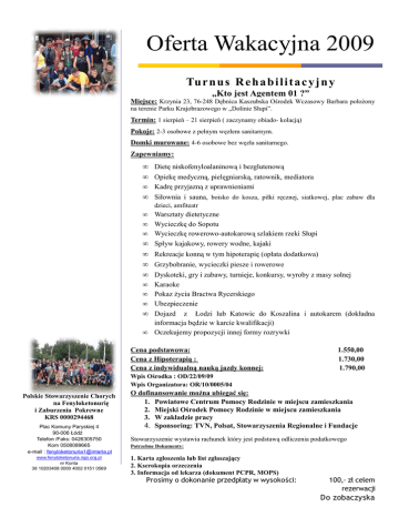 Oferta Wakacyjna 2009 Tu r n u s R e h a b i l i t a c y j n y „Kto jest Agentem 01 ?” Miejsce: Krzynia 23, 76-248 Dębnica Kaszubska Ośrodek Wczasowy Barbara położony na terenie Parku Krajobrazowego w „Dolinie Słupi”. Termin: 1 sierpień – 21 sierpień ( zaczynamy obiado- kolacją) Pokoje: 2-3 osobowe z pełnym węzłem sanitarnym. Domki murowane: 4-6 osobowe bez węzła sanitarnego. Zapewniamy: • • • • Dietę niskofenyloalaninową i bezglutenową Opiekę medyczną, pielęgniarską, ratownik, mediatora Kadrę przyjazną z uprawnieniami Siłownia i sauna, boisko do kosza, piłki ręcznej, siatkowej, plac zabaw dla dzieci, amfiteatr • • • • • • • • • • • • Warsztaty dietetyczne Wycieczkę do Sopotu Wycieczkę rowerowo-autokarową szlakiem rzeki Słupi Spływ kajakowy, rowery wodne, kajaki Rekreacje konną w tym hipoterapię (opłata dodatkowa) Grzybobranie, wycieczki piesze i rowerowe Dyskoteki, gry i zabawy, turnieje, konkursy, wyroby z masy solnej Karaoke Pokaz życia Bractwa Rycerskiego Ubezpieczenie Dojazd z Łodzi lub Katowic do Koszalina i autokarem (dokładna informacja będzie w karcie kwalifikacji) Oczekujemy propozycji innej formy rozrywki Cena podstawowa: Cena z Hipoterapią : Cena z indywidualną nauką jazdy konnej: 1.550,00 1.730,00 1.790,00 Wpis Ośrodka : OD/22/09/09 Wpis Organizatora: OR/10/0005/04 Polskie Stowarzyszenie Chorych na Fenyloketonurię i Zaburzenia Pokrewne KRS 0000294468 Plac Komuny Paryskiej 4 90-006 Łódź Telefon /Faks: 0426305750 Kom 0508089665 e-mail : [email protected] www.fenyloketonuria.ngo.org.pl nr Konta 38 10203408 0000 4002 0151 0569 O dofinansowanie można ubiegać się: 1. Powiatowe Centrum Pomocy Rodzinie w miejscu zamieszkania 2. Miejski Ośrodek Pomocy Rodzinie w miejscu zamieszkania 3. W zakładzie pracy 4. Sponsoring: TVN, Polsat, Stowarzyszenia Regionalne i Fundacje Stowarzyszenie wystawia rachunek który jest podstawą odliczenia podatkowego Potrzebne Dokumenty: 1. Karta zgłoszenia lub list zgłaszający 2. Kserokopia orzeczenia 3. Informacja od lekarza (dokument PCPR, MOPS) Prosimy o dokonanie przedpłaty w wysokości: 100,- zł celem rezerwacji Do zobaczyska