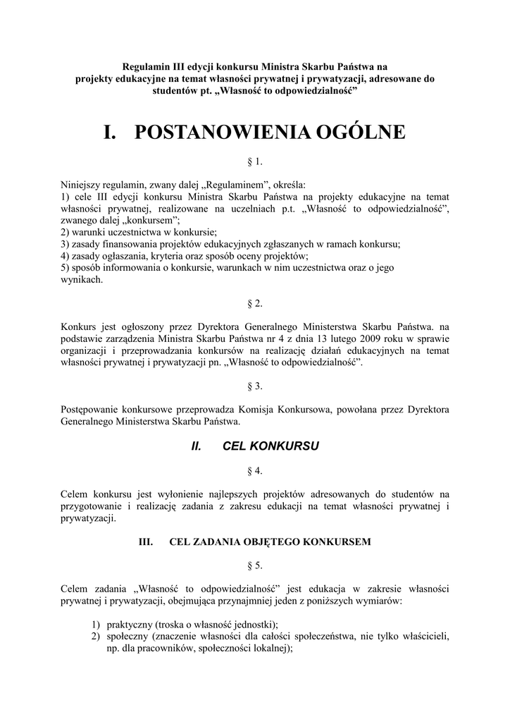 Regulamin III edycji konkursu Ministra Skarbu Państwa na projekty edukacyjne na temat własności prywatnej i prywatyzacji, adresowane do studentów pt. „Własność to odpowiedzialność” I. POSTANOWIENIA OGÓLNE § 1. Niniejszy regulamin, zwany dalej „Regulaminem”, określa: 1) cele III edycji konkursu Ministra Skarbu Państwa na projekty edukacyjne na temat własności prywatnej, realizowane na uczelniach p.t. „Własność to odpowiedzialność”, zwanego dalej „konkursem”; 2) warunki uczestnictwa w konkursie; 3) zasady finansowania projektów edukacyjnych zgłaszanych w ramach konkursu; 4) zasady ogłaszania, kryteria oraz sposób oceny projektów; 5) sposób informowania o konkursie, warunkach w nim uczestnictwa oraz o jego wynikach. § 2. Konkurs jest ogłoszony przez Dyrektora Generalnego Ministerstwa Skarbu Państwa. na podstawie zarządzenia Ministra Skarbu Państwa nr 4 z dnia 13 lutego 2009 roku w sprawie organizacji i przeprowadzania konkursów na realizację działań edukacyjnych na temat własności prywatnej i prywatyzacji pn. „Własność to odpowiedzialność”. § 3. Postępowanie konkursowe przeprowadza Komisja Konkursowa, powołana przez Dyrektora Generalnego Ministerstwa Skarbu Państwa. II. CEL KONKURSU § 4. Celem konkursu jest wyłonienie najlepszych projektów adresowanych do studentów na przygotowanie i realizację zadania z zakresu edukacji na temat własności prywatnej i prywatyzacji. III. CEL ZADANIA OBJĘTEGO KONKURSEM § 5. Celem zadania „Własność to odpowiedzialność” jest edukacja w zakresie własności prywatnej i prywatyzacji, obejmująca przynajmniej jeden z poniższych wymiarów: 1) praktyczny (troska o własność jednostki); 2) społeczny (znaczenie własności dla całości społeczeństwa, nie tylko właścicieli, np. dla pracowników, społeczności lokalnej); 3) 4) 5) 6) 7) etyczno-religijny (znaczenie moralne własności, własność w różnych religiach); polityczny (własność, jako gwarancja wolności i demokracji); ekonomiczny (skuteczność gospodarki prywatnej); znaczenie procesu prywatyzacji, jako upowszechniania własności prywatnej; prywatyzacja w dobie kryzysu. § 6. Zadanie związane z niniejszym konkursem jest skierowane do następujących grup docelowych: grupa podstawowa: 1) studenci grupa uzupełniająca: 1) media, 2) liderzy opinii, 3) pracownicy naukowi, 4) uczniowie, 5) przedsiębiorcy. IV. WARUNKI UCZESTNICTWA W KONKURSIE § 7. W konkursie mogą uczestniczyć organizacje pozarządowe w tym w szczególności: 1) samorządy studenckie; 2) organizacje studenckie; 3) koła naukowe; 4) organizacje pozarządowe działające na rzecz środowiska studenckiego i rozwoju edukacji ekonomicznej; 5) szkoły wyższe. § 8. Warunkiem przystąpienia do konkursu jest złożenie projektu realizacji zadania, o którym mowa w § 4, w formie formularza, którego wzór stanowi załącznik do regulaminu. § 9. Składany projekt powinien zawierać dane oraz podpis osoby lub osób upoważnionych do reprezentowania uczestnika konkursu. § 10. Warunkiem uczestnictwa w konkursie jest zgodność projektu z celem zadania opisanym w § 5. § 11. Minister Skarbu Państwa obejmie patronatem oraz sfinansuje realizację zwycięskich projektów. Finansowanie nastąpi na podstawie umowy cywilnoprawnej zawartej z organizacją, która wygrała konkurs. § 12. 1. 2. Realizacja projektu powinna nastąpić w terminie od 30 marca 2009 r. do 30 września 2009 r. W szczególnych przypadkach możliwa jest realizacja projektu od 1 października 2009 do 31 grudnia 2009r. IV. ZASADY ZGŁASZANIA PROJEKTÓW § 13. Projekty należy przesłać do 17 marca 2009 r. (decyduje data wpływu do Ministerstwa) na adres: Ministerstwo Skarbu Państwa, Biuro Komunikacji Społecznej, ul. Wspólna 6 / Krucza 36, 00-522 Warszawa; z dopiskiem na kopercie: "Konkurs - Własność to odpowiedzialność” albo złożyć w Ministerstwie Skarbu Państwa w Kancelarii Ogólnej. § 14. Projekty złożone po terminie nie będą rozpatrywane. § 15. Projekty, których założenia nie mieszczą się w obszarze tematycznym i zadaniowym określonym w § 5 zostaną odrzucone. VII. SPOSÓB I KRYTERIA OCENY WNIOSKÓW § 16. Komisja Konkursowa dokona oceny projektów złożonych z zachowaniem terminu, o których mowa w § 14, i nieodrzuconych na podstawie § 15. § 17. 1. Ocena, o której mowa w § 16, polega na analizie zgłoszonych projektów pod kątem następujących kryteriów: 1) merytorycznych , obejmujących uwzględnienie w projekcie przynajmniej jednego wymiaru własności prywatnej i prywatyzacji spośród wymiarów, o których mowa w § 5; 2) komunikacyjnych, obejmujących: a) współpracę z mediami, b) planowaną frekwencję lub zasięg projektu, c) atrakcyjność przekazu, d) oryginalność pomysłu. 2. Ocena, o której mowa w § 16, obejmie również doświadczenie wnioskodawcy w zakresie: 1) realizacji podobnych projektów; 2) edukacji ekonomicznej; 3) współpracy z innymi uczelniami 3. Ocena o której mowa w § 16, obejmie również planowany budżet projektu, w zakresie: 1) planowanego wkładu własnego wnioskodawcy 2) stosunku wnioskowanej kwoty do skali realizowanego przedsięwzięcia 4. Komisja konkursowa, na podstawie analiz, o których mowa w ust. 1,2 i 3 przyznaje za każdy z elementów oceny odpowiednią liczbę punktów, przy czym: 1) w przypadku o którym mowa w ust. 1 pkt 1 liczba punktów nie może przekroczyć 40; 2) w przypadku o którym mowa w ust. 1 pkt 2 liczba punktów nie może przekroczyć 30; 3) w przypadku o którym mowa w ust. 2 liczba punktów nie może przekroczyć 20. 4) w przypadku o którym mowa w ust 3. liczba punktów nie może przekroczyć 10 4. Komisja po dokonaniu oceny o której mowa w § 17 sporządza protokół zawierający zestawienie projektów oraz sumę przyznanych im punktów. Niezwłocznie po sporządzeniu protokołu komisja ogłasza zwycięzców konkursu. § 19. Od decyzji Komisji Konkursowej nie przysługuje odwoł