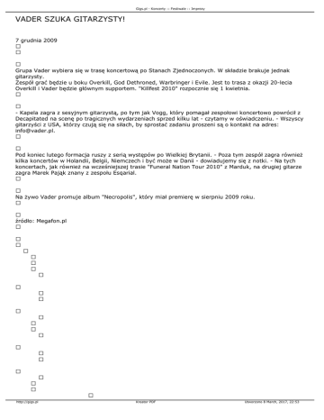 Gigs.pl - Koncerty :: Festiwale :: Imprezy VADER SZUKA GITARZYSTY! 7 grudnia 2009 Grupa Vader wybiera się w trasę koncertową po Stanach Zjednoczonych. W składzie brakuje jednak gitarzysty. Zespół grać będzie u boku Overkill, God Dethroned, Warbringer i Evile. Jest to trasa z okazji 20-lecia Overkill i Vader będzie głównym supportem. "Killfest 2010" rozpocznie się 1 kwietnia. - Kapela zagra z sesyjnym gitarzystą, po tym jak Vogg, który pomagał zespołowi koncertowo powrócił z Decapitated na scenę po tragicznych wydarzeniach sprzed kilku lat - czytamy w oświadczeniu. - Wszyscy gitarzyści z USA, którzy czują się na siłach, by sprostać zadaniu proszeni są o kontakt na adres: [email protected]. Pod koniec lutego formacja ruszy z serią występów po Wielkiej Brytanii. - Poza tym zespół zagra również kilka koncertów w Holandii, Belgii, Niemczech i być może w Danii - dowiadujemy się z notki. - Na tych koncertach, jak również na wcześniejszej trasie "Funeral Nation Tour 2010" z Marduk, na drugiej gitarze zagra Marek Pająk znany z zespołu Esqarial. Na żywo Vader promuje album "Necropolis", który miał premierę w sierpniu 2009 roku. źródło: Megafon.pl http://gigs.pl Kreator PDF Utworzono 8 March, 2017, 22:53 Gigs.pl - Koncerty :: Festiwale :: Imprezy http://gigs.pl Kreator PDF Utworzono 8 March, 2017, 22:53 Gigs.pl - Koncerty :: Festiwale :: Imprezy http://gigs.pl Kreator PDF Utworzono 8 March, 2017, 22:53