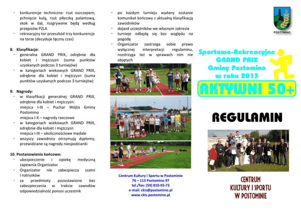 konkurencje techniczne: rzut oszczepem, pchnięcie kulą, rzut piłeczką palantową, skok w dal, rozgrywane będą według przepisów PZLA rekreacyjny tor przeszkód trzy konkurencje na torze (decyduje łączny czas) 8. Klasyfikacje: generalna GRAND PRIX, odrębnie dla kobiet i mężczyzn (suma punktów uzyskanych podczas 3 turniejów) w kategoriach wiekowych GRAND PRIX, odrębnie dla kobiet i mężczyzn (suma punktów uzyskanych podczas 3 turniejów) po każdym turnieju wydany zostanie komunikat końcowy z aktualną klasyfikacją zawodników dojazd uczestników we własnym zakresie turnieje odbędą się bez względu na pogodę Organizator zastrzega sobie prawo wyłącznej interpretacji regulaminu, rozstrzyga też w sprawach nim nie objętych 9. Nagrody: w klasyfikacji generalnej GRAND PRIX, odrębnie dla kobiet i mężczyzn: miejsca I-III – Puchar Wójta Gminy Postomino miejsca I-X – nagrody rzeczowe w kategoriach wiekowych GRAND PRIX, odrębnie dla kobiet i mężczyzn miejsca I-III – okolicznościowe medale wszyscy zawodnicy otrzymują dyplomy, przewidziane są nagrody niespodzianki 10. Postanowienia końcowe: ubezpieczenie i opiekę medyczną zapewnia Organizator Organizator nie zabezpiecza szatni i natrysków za przedmioty pozostawione bez zabezpieczenia w trakcie zawodów odpowiedzialność ponosi uczestnik REGULAMIN Centrum Kultury i Sportu w Postominie 76 – 113 Postomino 97 tel./fax: (59) 810-93-73 e-mail: [email protected] www.ckis.postomino.pl „Sport to zdrowie!” - wiemy wszyscy. Do tego aktywny wypoczynek na świeżym powietrzu oraz radość ze wspólnego przeżywania sportowych emocji, wzajemne wspieranie się, dopingowanie sobie, to przecież wartości, które trudno przecenić w każdym wieku. Należy tylko podjąć odpowiednie środki. Im wcześniej tym skuteczniej można stawiać czoła upływowi czasu. Centrum Kultury i Sportu w Postominie po raz kolejny organizuje Sportowo-Rekreacyjne GRAND PRIX Gminy Postomino „Aktywni 50+”. W tym roku ponownie postawiono na szeroko rozumianą aktywność i wspólną zabawę, nie zawsze mającą coś wspólnego ze sportem. Tradycyjnie rozegrane zostaną 3 turnieje w kilku sportowych i rekreacyjnych konkurencjach. Celem przyświecającym tegorocznej edycji zawodów jest zaktywizowanie „starszej młodzieży” i wyłonienie najbardziej wszechstronnych sportowo mieszkańców Gminy. Agnieszka Czarnuch Dyrektor Centrum Kultury i Sportu w Postominie REGULAMIN 1. Cel imprezy: aktywizacja „starszej młodzieży” wyłonienie najbardziej aktywnych mieszkańców Gminy Postomino popularyzacja lekkiej atletyki i rekreacji wśród mieszkańców Gminy Postomino popularyzacja zdrowotnych aspektów ruchu na świeżym powietrzu 2. Organizator: Centrum Kultury i Sportu w Postominie, 76-113 Postomino 97, tel./fax: (59) 810-93-73, e-mail: [email protected] przy wsparciu Gminnej Komisji Rozwiązywania Problemów Alkoholowych w Postominie. 3. Uczestnicy: kobiety i mężczyźni z rocznika 1963 i starsi 4. Kategorie wiekowe: kobiety: 50-54 lata (rocznik 1963-1959) 55-59 lat (rocznik 1958-1954) 60-64 lata (rocznik 1953-1949) 65 lat i więcej (rocznik 1948 i starsze) mężczyźni: 50-54 lata (rocznik 1963-1959) 55-59 lat (rocznik 1958-1954) 60-64 lata (rocznik 1953-1949) 65-69 lat (rocznik 1948-1944) 70 lat i więcej (rocznik 1943 i starsi) 5. Miejsce: Stadion im. Z. Galka w Postominie 6. Termin: rozpoczęcie wszystkich turniejów o godz. 14.00 zapisy do poszczególnych konkurencji na min. 30 min. przed ich rozegraniem zawodnicy przy zapisach otrzymują numer startowy 20 kwietnia 2013 r. (sobota) - Primaaprilisowy Turniej Weteranów pchnięcie kulą slalom (siedem tyczek) z piłką na czas bieg z toczeniem piłki kijem hokejowym po bieżni (60 m x 2) festiwal rzutów lekarskimi piłkami trzymanie toporów – konkurencja strong man 27 lipca 2013 r. (sobota) - „Żyj zdrowo na sportowo” – Turniej Weteranów cellotka - rzut lotką do tarczy rzut piłką palantową parytety biegowe –60 m – K, 100 m –M rzut beretem rekreacyjny tor przeszkód 28 września 2013 r. (sobota) - „Babie Lato” – Turniej Weteranów rzut oszczepem skok w piach (w dal) bieg 1 okrążenia (400 m) toczenie torowe piłki rzutowy festiwal bele czym 7. Sposób przeprowadzania zawodów: zawodnicy uczestniczą we wszystkich lub wybranych przez siebie konkurencjach cellotka rozegrana będzie zgodnie z zasadami darta festiwal rzutowy - rzut 3 różnymi akcesoriami na odległość do celu rzuty - beretem (2 rzuty) - decyduje łączna odległość rzutów toczenie torowe piłki z odległości 40 m trzymanie toporów przed sobą (na wyprostowanych rękach na czas)