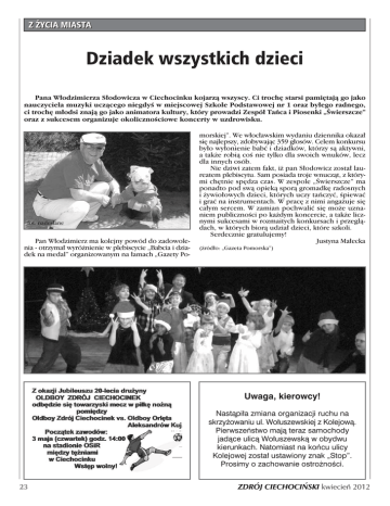 Z ˚YCIA MIASTA Dziadek wszystkich dzieci Pana W∏odzimierza S∏odowicza w Ciechocinku kojarzà wszyscy. Ci troch´ starsi pami´tajà go jako nauczyciela muzyki uczàcego niegdyÊ w miejscowej Szkole Podstawowej nr 1 oraz by∏ego radnego, ci troch´ m∏odsi znajà go jako animatora kultury, który prowadzi Zespó∏ Taƒca i Piosenki „Âwierszcze” oraz z sukcesem organizuje okolicznoÊciowe koncerty w uzdrowisku. fot. nades∏ane Pan W∏odzimierz ma kolejny powód do zadowolenia - otrzyma∏ wyró˝nienie w plebiscycie „Babcia i dziadek na medal” organizowanym na ∏amach „Gazety Po- morskiej”. We w∏oc∏awskim wydaniu dziennika okaza∏ si´ najlepszy, zdobywajàc 359 g∏osów. Celem konkursu by∏o wy∏onienie babç i dziadków, którzy sà aktywni, a tak˝e robià coÊ nie tylko dla swoich wnuków, lecz dla innych osób. Nie dziwi zatem fakt, i˝ pan S∏odowicz zosta∏ laureatem plebiscytu. Sam posiada troje wnuczàt, z którymi ch´tnie sp´dza czas. W zespole „Âwierszcze” ma ponadto pod swà opiekà sporà gromadk´ radosnych i ˝ywio∏owych dzieci, których uczy taƒczyç, Êpiewaç i graç na instrumentach. W prac´ z nimi anga˝uje si´ ca∏ym sercem. W zamian pochwaliç si´ mo˝e uznaniem publicznoÊci po ka˝dym koncercie, a tak˝e licznymi sukcesami w rozmaitych konkursach i przeglàdach, w których biorà udzia∏ dzieci, które szkoli. Serdecznie gratulujemy! Justyna Ma∏ecka (êród∏o: „Gazeta Pomorska”) Uwaga, kierowcy! Nastàpi∏a zmiana organizacji ruchu na skrzy˝owaniu ul. Wo∏uszewskiej z Kolejowà. Pierwszeƒstwo majà teraz samochody jadàce ulicà Wo∏uszewskà w obydwu kierunkach. Natomiast na koƒcu ulicy Kolejowej zosta∏ ustawiony znak „Stop”. Prosimy o zachowanie ostro˝noÊci. 23 ZDRÓJ CIECHOCI¡SKI kwiecieƒ 2012
