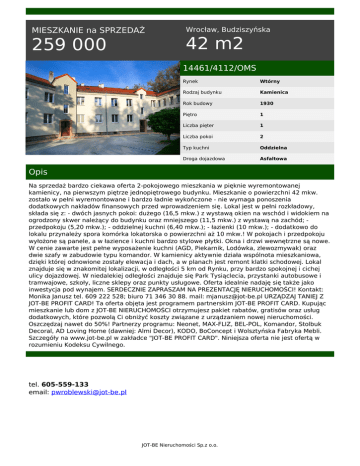 MIESZKANIE na SPRZEDAŻ 259 000 Wrocław, Budziszyńska 42 m2 14461/4112/OMS Rynek Wtórny Rodzaj budynku Kamienica Rok budowy 1930 Piętro 1 Liczba pięter 1 Liczba pokoi 2 Typ kuchni Oddzielna Droga dojazdowa Asfaltowa Opis Na sprzedaż bardzo ciekawa oferta 2-pokojowego mieszkania w pięknie wyremontowanej kamienicy, na pierwszym piętrze jednopiętrowego budynku. Mieszkanie o powierzchni 42 mkw. zostało w pełni wyremontowane i bardzo ładnie wykończone - nie wymaga ponoszenia dodatkowych nakładów finansowych przed wprowadzeniem się. Lokal jest w pełni rozkładowy, składa się z: - dwóch jasnych pokoi: dużego (16,5 mkw.) z wystawą okien na wschód i widokiem na ogrodzony skwer należący do budynku oraz mniejszego (11,5 mkw.) z wystawą na zachód; przedpokoju (5,20 mkw.); - oddzielnej kuchni (6,40 mkw.); - łazienki (10 mkw.); - dodatkowo do lokalu przynależy spora komórka lokatorska o powierzchni aż 10 mkw.! W pokojach i przedpokoju wyłożone są panele, a w łazience i kuchni bardzo stylowe płytki. Okna i drzwi wewnętrzne są nowe. W cenie zawarte jest pełne wyposażenie kuchni (AGD, Piekarnik, Lodówka, zlewozmywak) oraz dwie szafy w zabudowie typu komandor. W kamienicy aktywnie działa wspólnota mieszkaniowa, dzięki której odnowione zostały elewacja i dach, a w planach jest remont klatki schodowej. Lokal znajduje się w znakomitej lokalizacji, w odległości 5 km od Rynku, przy bardzo spokojnej i cichej ulicy dojazdowej. W niedalekiej odległości znajduje się Park Tysiąclecia, przystanki autobusowe i tramwajowe, szkoły, liczne sklepy oraz punkty usługowe. Oferta idealnie nadaję się także jako inwestycja pod wynajem. SERDECZNIE ZAPRASZAM NA PREZENTACJĘ NIERUCHOMOŚCI! Kontakt: Monika Janusz tel. 609 222 528; biuro 71 346 30 88. mail: [email protected] URZĄDZAJ TANIEJ Z JOT-BE PROFIT CARD! Ta oferta objęta jest programem partnerskim JOT-BE PROFIT CARD. Kupując mieszkanie lub dom z JOT-BE NIERUCHOMOŚCI otrzymujesz pakiet rabatów, gratisów oraz usług dodatkowych, które pozwolą Ci obniżyć koszty związane z urządzaniem nowej nieruchomości. Oszczędzaj nawet do 50%! Partnerzy programu: Neonet, MAX-FLIZ, BEL-POL, Komandor, Stolbuk Decoral, AD Loving Home (dawniej: Almi Decor), KODO, BoConcept i Wolsztyńska Fabryka Mebli. Szczegóły na www.jot-be.pl w zakładce "JOT-BE PROFIT CARD". Niniejsza oferta nie jest ofertą w rozumieniu Kodeksu Cywilnego. tel. 605-559-133 email: [email protected] JOT-BE Nieruchomości Sp.z o.o. Powered by TCPDF (www.tcpdf.org)