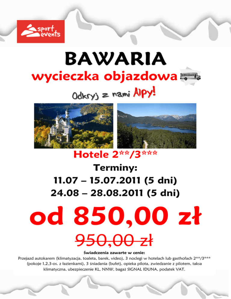 BAWARIA wycieczka objazdowa Hotele 2**/3*** Terminy: 11.07 – 15.07.2011 (5 dni) 24.08 – 28.08.2011 (5 dni) od 850,00 zł 950,00 zł Świadczenia zawarte w cenie: Przejazd autokarem (klimatyzacja, toaleta, barek, video), 3 noclegi w hotelach lub gasthofach 2**/3*** (pokoje 1,2,3-os. z łazienkami), 3 śniadania (bufet), opieka pilota, zwiedzanie z pilotem, taksa klimatyczna, ubezpieczenie KL, NNW, bagaż SIGNAL IDUNA, podatek VAT.