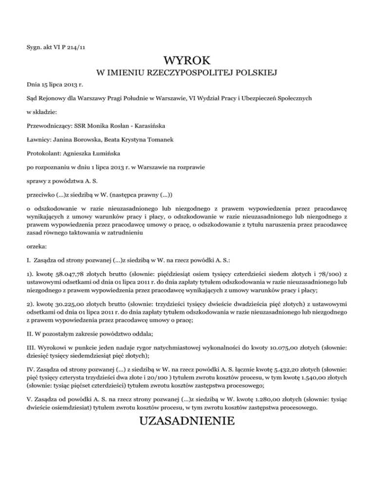 Sygn. akt VI P 214/11 WYROK W IMIENIU RZECZYPOSPOLITEJ POLSKIEJ Dnia 15 lipca 2013 r. Sąd Rejonowy dla Warszawy Pragi Południe w Warszawie, VI Wydział Pracy i Ubezpieczeń Społecznych w składzie: Przewodniczący: SSR Monika Rosłan - Karasińska Ławnicy: Janina Borowska, Beata Krystyna Tomanek Protokolant: Agnieszka Łumińska po rozpoznaniu w dniu 1 lipca 2013 r. w Warszawie na rozprawie sprawy z powództwa A. S. przeciwko (...)z siedzibą w W. (następca prawny (...)) o odszkodowanie w razie nieuzasadnionego lub niezgodnego z prawem wypowiedzenia przez pracodawcę wynikających z umowy warunków pracy i płacy, o odszkodowanie w razie nieuzasadnionego lub niezgodnego z prawem wypowiedzenia przez pracodawcę umowy o pracę, o odszkodowanie z tytułu naruszenia przez pracodawcę zasad równego taktowania w zatrudnieniu orzeka: I. Zasądza od strony pozwanej (...)z siedzibą w W. na rzecz powódki A. S.: 1). kwotę 58.047,78 złotych brutto (słownie: pięćdziesiąt osiem tysięcy czterdzieści siedem złotych i 78/100) z ustawowymi odsetkami od dnia 01 lipca 2011 r. do dnia zapłaty tytułem odszkodowania w razie nieuzasadnionego lub niezgodnego z prawem wypowiedzenia przez pracodawcę wynikających z umowy warunków pracy i płacy; 2). kwotę 30.225,00 złotych brutto (słownie: trzydzieści tysięcy dwieście dwadzieścia pięć złotych) z ustawowymi odsetkami od dnia 01 lipca 2011 r. do dnia zapłaty tytułem odszkodowania w razie nieuzasadnionego lub niezgodnego z prawem wypowiedzenia przez pracodawcę umowy o pracę; II. W pozostałym zakresie powództwo oddala; III. Wyrokowi w punkcie jeden nadaje rygor natychmiastowej wykonalności do kwoty 10.075,00 złotych (słownie: dziesięć tysięcy siedemdziesiąt pięć złotych); IV. Zasądza od strony pozwanej (...) z siedzibą w W. na rzecz powódki A. S. łącznie kwotę 5.432,20 złotych (słownie: pięć tysięcy czterysta trzydzieści dwa złote i 20/100 ) tytułem zwrotu kosztów procesu, w tym kwotę 1.540,00 złotych (słownie: tysiąc pięćset czterdzieści) tytułem zwrotu kosztów zastępstwa procesowego; V. Zasądza od powódki A. S. na rzecz strony pozwanej (...)z siedzibą w W. kwotę 1.280,00 złotych (słownie: tysiąc dwieście osiemdziesiat) tytułem zwrotu kosztów procesu, w tym zwrotu kosztów zastępstwa procesowego. UZASADNIENIE W dniu 30 marca 2011 roku A. S. wniosła pozew przeciwko (...) z siedzibą w W. o uznanie wypowiedzenia zmieniającego warunki umowy o pracę za bezskuteczne złożonego powódce w dniu 24 marca 2011 roku oraz zasądzenie od pozwanego na rzecz powódki kosztów procesu w tym zastępstwa procesowego według norm przepisanych (pozew k. 1-8). Ostatecznie pełnomocnik powódki zmodyfikował żądanie. Wniósł o zasądzenie od pozwanego kwoty; - w wysokości 58.047,78 zł tytułem odszkodowania za nieuzasadnione lub niezgodnie z prawem wypowiedzenia przez pracodawcę wynikających z umowy warunków pracy i płacy dokonanego w dniu 24 marca 2011 roku w wysokości 3- miesięcznego wynagrodzenia wraz z ustawowymi odsetkami ustawowymi od dnia wniesienia pozwu do dnia zapłaty, - w wysokości 30.225,00 zł tytułem odszkodowania z tytułu nieuzasadnionego lub niezgodnego z prawem wypowiedzenia umowy o pracę dokonanego w dniu 23 maja 2011 roku (pismo procesowe z dnia 25 stycznia 2013r. k. 1284), - w wysokości 73.426,45 zł tytułem odszkodowania za naruszenie przez pozwanego zasady równego traktowania w zatrudnieniu ze względu na płeć, skorzystanie przez nią uprawnień w związku urodzeniem i wychowywaniem dziecka oraz zatrudnienie w niepełnym wymiarze czasu pracy, rozwiązania z nią umowy o pracę za wypowiedzeniem (pismo procesowe z dnia 13 czerwca 2012 r. k. 322-339). W uzasadnieniu pozwu powódka wskazała, że była zatrudniona u pozwanego od 16 listopada 2005 roku na stanowisku dyrektora sprzedaży. W dniu 9 marca 2011 roku powódka złożyła wniosek o obniżenie wymiaru czasu pracy do wymiaru ½ przez okres od 24 marca 2011 r. do 7 marca 2012 roku. Następnie w dniu 24 marca 2011 roku strona pozwana złożyła powódce oświadczenie o wypowiedzeniu umowy o pracę zawartej dnia 1 maja 1999 roku w części dotyczącej stanowiska. Jako przyczynę podano zmiany organizacyjne mające związek z planowanym przejęciem zakładu pracy, a w związku z tym z koniecznością dostosowania warunków zatrudnienia do regulacji (...) Ponadto powódka wskazała, iż wypowiedzenie jest nieuzasadnione, gdyż przyczyna wypowiedzenia jest niekonkretna, pozorna i nieprawdziwa. Pełnomocnik pozwanego w odpowiedzi na pozew wniósł o oddalenie powództwa w całości wraz z zasądzeniem kosztów procesu, w tym kosztów zastępstwa procesowego. W uzasadnieniu odpowiedzi na pozew pozwany zaprzeczył, ażeby przyczyny rozwiązania umowy o pracę z powódką były nieuzasadnione i niezgodne z prawem. Jednocześnie przyznała, że nastąpiła pomyłka w treści wypowiedzenia zmieniającego w oznaczeniu umowy zawartej w dniu 16 listopada 2005 roku. Natomiast zmiana nazwy stanowiska powódki podyktowana była potrzebą ujednolicenia nazw stanowisk pracowników przechodzących do spółki (...)., na co wszyscy pracownicy zgodzili się bez składania wypowiedzeń zmieniających. Ponadto strona pozwana wskazała, iż dokonała odpowiedniego kryterium doboru do zwolnienia powódki, gdyż drugą osobą zajmującą stanowisko dyrektora ds. sprzedaży był pracownik w okresie przedemerytalnym. Podniósł, iż roszczenia powódki są nieuzasadnione bowiem likwidacja stanowiska powódki związana była z wprowadzeniem w firmie pozwanej globalnego narzędzia informatycznego do zarządzania obszarem (...) tzw. (...)”. Z uwagi na fakt, iż dotychczasowe obowiązki powódki związane były ze zbieraniem informacji niezbędnych do oceny (...) przestawały mieć jakiekolwiek znaczenie dla firmy, ponieważ zakres tych obowiązków konsumowało wprowadzenie tego urządzenia . (odpowiedź na pozew z dnia 28 kwietnia 2011
