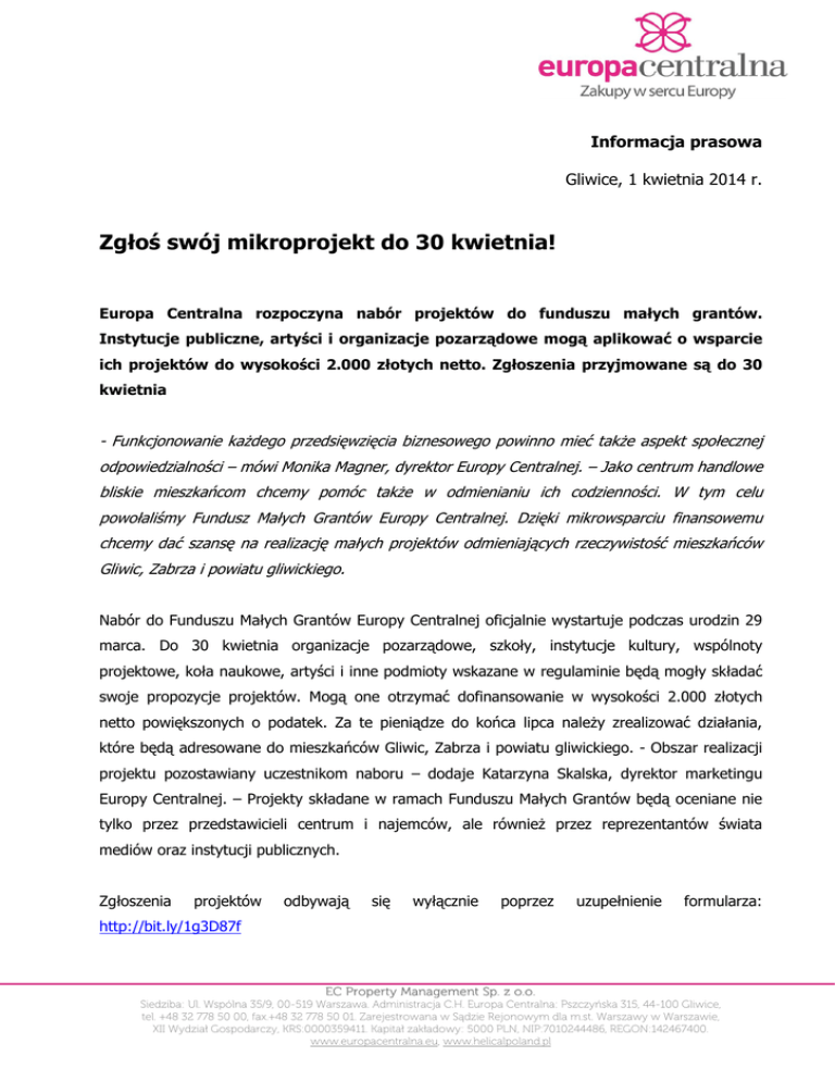 Informacja prasowa Gliwice, 1 kwietnia 2014 r. Zgłoś swój mikroprojekt do 30 kwietnia! Europa Centralna rozpoczyna nabór projektów do funduszu małych grantów. Instytucje publiczne, artyści i organizacje pozarządowe mogą aplikować o wsparcie ich projektów do wysokości 2.000 złotych netto. Zgłoszenia przyjmowane są do 30 kwietnia - Funkcjonowanie każdego przedsięwzięcia biznesowego powinno mieć także aspekt społecznej odpowiedzialności – mówi Monika Magner, dyrektor Europy Centralnej. – Jako centrum handlowe bliskie mieszkańcom chcemy pomóc także w odmienianiu ich codzienności. W tym celu powołaliśmy Fundusz Małych Grantów Europy Centralnej. Dzięki mikrowsparciu finansowemu chcemy dać szansę na realizację małych projektów odmieniających rzeczywistość mieszkańców Gliwic, Zabrza i powiatu gliwickiego. Nabór do Funduszu Małych Grantów Europy Centralnej oficjalnie wystartuje podczas urodzin 29 marca. Do 30 kwietnia organizacje pozarządowe, szkoły, instytucje kultury, wspólnoty projektowe, koła naukowe, artyści i inne podmioty wskazane w regulaminie będą mogły składać swoje propozycje projektów. Mogą one otrzymać dofinansowanie w wysokości 2.000 złotych netto powiększonych o podatek. Za te pieniądze do końca lipca należy zrealizować działania, które będą adresowane do mieszkańców Gliwic, Zabrza i powiatu gliwickiego. - Obszar realizacji projektu pozostawiany uczestnikom naboru – dodaje Katarzyna Skalska, dyrektor marketingu Europy Centralnej. – Projekty składane w ramach Funduszu Małych Grantów będą oceniane nie tylko przez przedstawicieli centrum i najemców, ale również przez reprezentantów świata mediów oraz instytucji publicznych. Zgłoszenia projektów odbywają się wyłącznie poprzez uzupełnienie formularza: http://bit.ly/1g3D87f EC Property Management Sp. z o.o. Siedziba: Ul. Wspólna 35/9, 00-519 Warszawa. Administracja C.H. Europa Centralna: Pszczyńska 315, 44-100 Gliwice, tel. +48 32 778 50 00, fax.+48 32 778 50 01. Zarejestrowana w Sądzie Rejonowym dla m.st. Warszawy w Warszawie, XII Wydział Gospodarczy, KRS:0000359411. Kapitał zakładowy: 5000 PLN, NIP:7010244486, REGON:142467400. www.europacentralna.eu, www.helicalpoland.pl Szczegółowych informacji na temat Funduszu udziela Adam Piwek z Mind Progress Group, email: [email protected] . Patronat medialny nad Funduszem Małych Grantów Europy Centralnej objęła redakcja „Dziennika Zachodniego”. To nie pierwsze działanie z obszaru społecznej odpowiedzialności biznesu realizowane przez Centrum Handlowe Europa Centralna. Jeden z największych parków handlowych w naszym kraju jest mecenasem Fundacji Biegamy z Sercem. Wspiera również klub piłkarski „Piast” Gliwice. W licznych działaniach eventowych, stanowiących serce aktywności marketingowej centrum, obecne są także działania CSR. Efektem akcji „Kajaki na start”, która odbywała się od 22 do 23 marca, było przekazanie 10.000 złotych na wakacje dla podopiecznych zabrzańskiego Centrum Wsparcia Kryzysowego Dzieci i Młodzieży. --Centrum Handlowe Europa Centralna o powierzchni 67 tys. metrów kwadratowych jest jednym z największych tego typu obiektów komercyjnych w Polsce. Unikalny koncept galerii, oferuje klientom możliwość zrobienia wszystkich niezbędnych zakupów od artykułów spożywczych, przez materiały do budowy domu, po ubrania z najnowszych kolekcji. Położenie obiektu, przy jednym z największych węzłów autostradowych w Polsce (Gliwice-Sośnica), gdzie łączą się autostrady A1 i A4 i droga krajowa nr 44 oraz na obszarze gęsto zaludnionego Górnośląskiego Okręgu Przemysłowego, sprawia, że niemal 5 mln osób może w ciągu godziny dojechać tu na zakupy. Na miejscu skorzystać można z wypożyczalni parasoli, pomieszczeń dla rodziców z dziećmi, 600 miejsc siedzących dla klientów piętra restauracyjnego, paczkomatu, bezpłatnego wi-fi dostępnego na terenie całego Centrum oraz wielu bankomatów i punktów usługowych. Klienci mogą zostawić swój samochód na dużym, liczącym 2,3 tys. miejsc parkingu, a niezmotoryzowani dojadą na zakupy bezpłatnymi liniami autobusowymi. Wśród najemców są takie firmy jak: Saturn, Castorama, Tesco Extra, Jula, Ski Team, Sports Direct, Jysk, SMYK Megastore, RTV Euro AGD, New Yorker, Reserved, H&M, Cubus, Lindex, CCC, Bershka, Solar, Monnari, Clooud, Apart, TUI, Home and You, Super Pharm, Neckermann, Deichmann, City Sport, Mohito, Promod, Cortland Apple Premium Reseller, Stradivarius, Rossmann, TAKKO Fashion, Douglas, Alpenpark, ING Bank Śląski, Lilo, Henry Moore, Motherline, Bialcon, Dobrodzień i Kalwaria, AMT Studio, New York Hot Dogs, Esotiq, Nuna Lie, Restauracja Chińska, a dla najmłodszych - Kinderplaneta. www.europacentralna.eu Kontakt dla dziennikarzy: Helical Poland Sp. z o.o. ul. Wspólna 35/9 00-519 Warszawa Więcej informacji: Marta Chodkowska tel. 601 244 127 [email protected] Leasing: Robert Gietko tel. 605 451 060 [email protected] Marketing Director C. H. Europa Centralna Katarzyna Skalska Marta Gołębiowska tel. 663 918 160 [email protected] Mind Progress Group Adam Piwek tel. 515 108 476 [email protected] Cook Communications Tomasz Rożek EC Property Management Sp. z o.o. Siedziba: Ul. Wspólna 35/9, 00-519 Warszawa. Administracja C.H. Europa Centralna: Pszczyńska 315, 44-100 Gliwice, tel. +48 32 778 50 00, fax.+48 32 778 50 01. Zarejestrowana w Sądzie Rejonowym dla m.st. Warszawy w Warszawie, XII Wydział Gospodarczy, KRS:0000359411. Kapitał zakładowy: 5000 PLN, NIP:7010244486, REGON:142467400. www.europacentralna.eu, www.helicalpoland.pl tel. 501 699 261 [email protected] tel. 663 171 033 [email protected] EC Property Management Sp. z o.o. Siedziba: Ul. Wspólna 35/9, 00-519 Warszawa. Administracja C.H. Europa Centralna: Pszczyńska 315, 44-100 Gliwice, tel. +48 32 778 50 00, fax.+48 32 778 50 01. Zarejestrowana w Sądzie Rejonowym dla m.st. Warszawy w Warszawie, XI