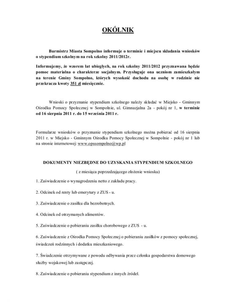 OKÓLNIK Burmistrz Miasta Sompolno informuje o terminie i miejscu składania wniosków o stypendium szkolnym na rok szkolny 2011/2012r. Informujemy, że wzorem lat ubiegłych, na rok szkolny 2011/2012 przyznawana będzie pomoc materialna o charakterze socjalnym. Przysługuje ona uczniom zamieszkałym na terenie Gminy Sompolno, których wysokość dochodu na osobę w rodzinie nie przekracza kwoty 351 zł miesięcznie. Wnioski o przyznanie stypendium szkolnego należy składać w Miejsko - Gminnym Ośrodku Pomocy Społecznej w Sompoln ie, ul. Gimnazjalna 2a - pokój nr 1, w terminie od 16 sierpnia 2011 r. do 15 września 2011 r. Formularze wniosków o przyznanie stypendium szkolnego można pobierać od 16 sierpnia 2011 r. w Miejsko - Gminnym Ośrodku Pomocy Społecznej w Sompolnie - pokój nr 1 lub na stronie internetowej: [email protected] DOKUMENTY NIEZBĘDNE DO UZYSKANIA STYPENDIUM SZKOLNEGO ( z miesiąca poprzedzającego złożenie wniosku) 1. Zaświadczenie o wynagrodzeniu netto z zakładu pracy. 2. Odcinek od renty lub emerytury z ZUS - u. 3. Zaświadczenie o zasiłku dla bezrobotnych. 4. Odcinek od otrzymanych alimentów. 5. Zaświadczenie o pobieraniu zasiłku chorobowego z ZUS - u. 6. Zaświadczenie z Ośrodka Pomocy Społecznej o pobieraniu zasiłków z pomocy społecznej, świadczeń rodzinnych i dodatku mieszkaniowego. 7. Świadczenie otrzymywane z powodu odbywania przez członka gospodarstwa domowego służby wojskowej lub zastępczej. 8. Zaświadczenie o pobieraniu stypendium z innych źródeł. Dodatkowo: I. dla osób posiadających gospodarstwo rolne: 1. Odcinek od renty lub emerytury i zasiłku rodzinnego z KRUS - u. 2. Nakaz płatniczy z 2011 roku lub zaświadczenie o wielkości gospodarstwa rolnego wyrażonej w hektarach przeliczeniowych z właściwego organu gminy. II. dla osób prowadzących działalność gospodarczą: 1. Zaświadczenie z Urzędu Skarbowego o uzyskanych dochodach za 2010 r. WYDATKI KWALIFIKOWANE DO STYPENDIUM SZKOLNEGO 1. PODRĘCZNIKI SZKOLNE, LEKTURY SZKOLNE 2. ZESZYTY 3. POMOCE DYDAKTYCZNE (np. słowniki, encyklopedie, atlasy, tablice matematyczne, itp.) 4. ARTYKUŁY SZKOLNE (np. piórnik, bloki, flamastry, kredki, pędzle, farby, klej, papier kolorowy, ołówki, długopisy, pióra, gumki, temperówki, kalkulatory, bibuła, brystole, papier kancelaryjny, nożyczki, taśma klejąca, papier milimetrowy, korektory, przybory geometryczne, plastelina, modelina) 5. TORNISTER (plecak szkolny) 6. OBUWIE SPORTOWE NA W-F (raz na semestr w cenie brutto nie wyższej niż 100 zł) 7. STRÓJ NA W-F (raz na semestr j.w.) 8. STRÓJ GALOWY wymagany przez szkołę - po uprzednim uzgodnieniu z pedagogiem szkoły 9. PRZYBORY DO NAUKI ZAWODU 10. OKULARY KOREKCYJNE 11. KOMPUTER, OPROGRAMOWANIE, CZĘŚCI DO KOMPUTERA 12. TUSZE DO DRUKAREK, POKRYCIE KOSZTÓW INTERNETOWEGO, MULTIMEDILANE PROGRAMY EDUKACYJNE 13. BIURKO, KRZESŁO DO BIURKA 14. SPRZĘT MUZYCZNY ABONAMENTU W przypadku uczestnictwa stypendysty w organizowanych przez szkołę wyjściach np. do instytucji kultury, czy wyjazdach na zieloną szkołę, szkoła poprzez dostarczenie stypendyście oryginału faktury lub rachunku umożliwi rozliczenie z pobieranego stypendium. WAŻNE! Osoba, która otrzymała stypendium szkolne dokonuje ich rozliczenia na podstawie dokumentów potwierdzających fakt wykorzystania świadczenia zgodnie z przeznaczeniem. Dokumentami takimi mogą być faktury, bądź rachunki uproszczone, imienne na rodzica lub pełnoletniego ucznia. Rozliczenie to odbywa się w terminie wskazanym w decyzji. W przypadku nieudokumentowania wydatków za dany okres rozliczeniowy następuje wstrzymania wypłaty świadczenia. Istotne jest także by np. plecak, buty itp. miały adnotację "szkolne" lub " sportowe". Jeżeli zakupiony towar nie ma tego przymiotnika w nazwie umieszczonej na fakturze a sprzedawca nie chce potwierdzić tego faktu na odwrocie rachunku, może potwierdzić szkoła do której uczęszcza uczeń. W ROKU SZKOLNYM 2011/2012 obowiązują faktury za: 1. zakup podręczników - od czerwca 2011r. do maja 2012 r. 2. pozostałe materiały szkolne od sierpnia 2011 r. do lipca 2012 r. - wg wykazu wydatków kwalifikowanych 3. internet - od września 2011 r. do czerwca 2012 r.