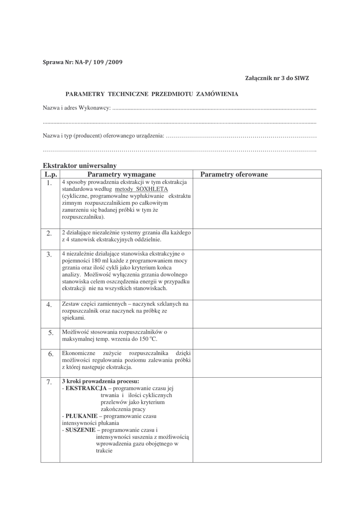 PARAMETRY TECHNICZNE PRZEDMIOTU ZAMÓWIENIA Nazwa i adres Wykonawcy: ....................................................................................................................................... ..................................................................................................................................................................................... Nazwa i typ (producent) oferowanego urz dzenia: ………………………………………………………………… ………………………………………………………………………………………………………………………. Ekstraktor uniwersalny L.p. Parametry wymagane 1. 4 sposoby prowadzenia ekstrakcji w tym ekstrakcja standardowa według metody SOXHLETA (cykliczne, programowalne wypłukiwanie ekstraktu zimnym rozpuszczalnikiem po całkowitym zanurzeniu si badanej próbki w tym e rozpuszczalniku). 2. 2 działaj ce niezale nie systemy grzania dla ka dego z 4 stanowisk ekstrakcyjnych oddzielnie. 3. 4 niezale nie działaj ce stanowiska ekstrakcyjne o pojemno ci 180 ml ka de z programowaniem mocy grzania oraz ilo cykli jako kryterium ko ca analizy. Mo liwo wył czenia grzania dowolnego stanowiska celem oszcz dzenia energii w przypadku ekstrakcji nie na wszystkich stanowiskach. 4. Zestaw cz ci zamiennych – naczynek szklanych na rozpuszczalnik oraz naczynek na próbk ze spiekami. 5. Mo liwo stosowania rozpuszczalników o maksymalnej temp. wrzenia do 150 oC. 6. Ekonomiczne zu ycie rozpuszczalnika dzi ki mo liwo ci regulowania poziomu zalewania próbki z której nast puje ekstrakcja. 7. 3 kroki prowadzenia procesu: - EKSTRAKCJA – programowanie czasu jej trwania i ilo ci cyklicznych przelewów jako kryterium zako czenia pracy - PŁUKANIE – programowanie czasu intensywno ci płukania - SUSZENIE – programowanie czasu i intensywno ci suszenia z mo liwo ci wprowadzenia gazu oboj tnego w trakcie Parametry oferowane 8. 4 rodzaje adapterów na ró ne rednice i rozmiary gilz ekstrakcyjnych. 9. Regulowany elektronicznie poziom zalewania próbki rozpuszczalnikiem. Fotooptyczny czujnik i elektroniczna kontrola wysoko ci poziomu zalania próbki rozpuszczalnikiem w ka dym naczyniu ekstrakcyjnym w zale no ci od wielko ci próbki. 10. Mo liwo umieszczenia próbki przeznaczonej do ekstrakcji w UNIWERSALNYM NACZYNKU ze spiekiem SCHOTTA. 11. Pełna automatyzacja i kontrola przebiegu procesu w aparacie dla ka dej KOLUMNY SOXHLETA b d cej składowym elementem ka dego stanowiska roboczego ekstraktora. Aktywne systemy informacji o przypadkowych bł dach w obsłudze urz dzenia. Cyfrowy system informacji o bł dach w obsłudze. 12. Wszystkie elementy maj ce kontakt z rozpuszczalnikiem wykonane z materiałów odpornych na korozj (fluorez, szkło, teflon). 13. Proste programowanie, mo liwo zachowania w pami ci programowanych metod ekstrakcji. 14. Wykonanie wg obowi zuj cych norm bezpiecze stwa dla tej klasy aparatów. 15. Bezpo rednia, w pełni kompatybilna współpraca z przystawk do wst pnej hydrolizy próbki. 16. Mo liwo analizy: * zawarto ci tłuszczu metod SOXHLETA, * pozostało ci w produktach ywno ciowych i paszach, * pozostało ci olejów mineralnych w glebie, * analiza PCB oraz PAH w glebie, * analiza zawarto ci fenoli, herbicydów oraz pestycydów, * ekstrakcja z zastosowaniem wody jako rozpuszczalnika itp. 17. Zasilanie 230V, 50 Hz. * Wykonawca wypełnia kolumn „Parametry oferowane”, nie wypełnienie kolumny przez Wykonawc skutkowa b dzie odrzuceniem oferty. ........................dnia..................... ................................................................. /miejscowo / Podpis(y) osoby/osób upowa nionych do reprezentacji Wykonawcy/Wykonawców/