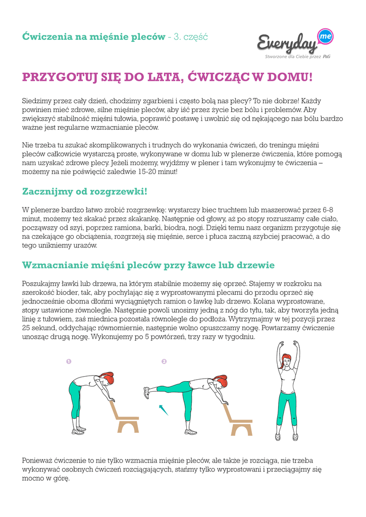 me Ćwiczenia na mięśnie pleców - 3. część Stworzone dla Ciebie przez PRZYGOTUJ SIĘ DO LATA, ĆWICZĄC W DOMU! Siedzimy przez cały dzień, chodzimy zgarbieni i często bolą nas plecy? To nie dobrze! Każdy powinien mieć zdrowe, silne mięśnie pleców, aby iść przez życie bez bólu i problemów. Aby zwiększyć stabilność mięśni tułowia, poprawić postawę i uwolnić się od nękającego nas bólu bardzo ważne jest regularne wzmacnianie pleców. Nie trzeba tu szukać skomplikowanych i trudnych do wykonania ćwiczeń, do treningu mięśni pleców całkowicie wystarczą proste, wykonywane w domu lub w plenerze ćwiczenia, które pomogą nam uzyskać zdrowe plecy. Jeżeli możemy, wyjdźmy w plener i tam wykonujmy te ćwiczenia – możemy na nie poświęcić zaledwie 15-20 minut! Zacznijmy od rozgrzewki! W plenerze bardzo łatwo zrobić rozgrzewkę: wystarczy biec truchtem lub maszerować przez 6-8 minut, możemy też skakać przez skakankę. Następnie od głowy, aż po stopy rozruszamy całe ciało, począwszy od szyi, poprzez ramiona, barki, biodra, nogi. Dzięki temu nasz organizm przygotuje się na czekające go obciążenia, rozgrzeją się mięśnie, serce i płuca zaczną szybciej pracować, a do tego unikniemy urazów. Wzmacnianie mięśni pleców przy ławce lub drzewie Poszukajmy ławki lub drzewa, na którym stabilnie możemy się oprzeć. Stajemy w rozkroku na szerokość bioder, tak, aby pochylając się z wyprostowanymi plecami do przodu oprzeć się jednocześnie oboma dłońmi wyciągniętych ramion o ławkę lub drzewo. Kolana wyprostowane, stopy ustawione równolegle. Następnie powoli unosimy jedną z nóg do tyłu, tak, aby tworzyła jedną linię z tułowiem, zaś miednica pozostała równolegle do podłoża. Wytrzymajmy w tej pozycji przez 25 sekund, oddychając równomiernie, następnie wolno opuszczamy nogę. Powtarzamy ćwiczenie unosząc drugą nogę. Wykonujemy po 5 powtórzeń, trzy razy w tygodniu. 1 2 Ponieważ ćwiczenie to nie tylko wzmacnia mięśnie pleców, ale także je rozciąga, nie trzeba wykonywać osobnych ćwiczeń rozciągających, stańmy tylko wyprostowani i przeciągajmy się mocno w górę.