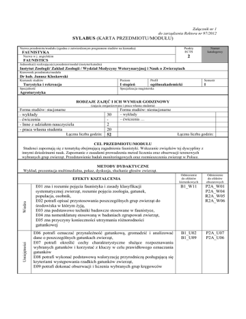 Załącznik nr 1 do zarządzenia Rektora nr 97/2012 SYLABUS (KARTA PRZEDMIOTU/MODUŁU) Nazwa przedmiotu/modułu (zgodna z zatwierdzonym programem studiów na kierunku) Punkty ECTS FAUNISTYKA Numer katalogowy 2 Nazwa w j. angielskim FAUNISTICS Jednostka(i) realizująca(e) przedmiot/moduł (instytut/katedra) Instytut Zoologii/ Zakład Zoologii / Wydział Medycyny Weterynaryjnej i Nauk o Zwierzętach Kierownik przedmiotu/modułu Dr hab. Janusz Kloskowski Kierunek studiów Turystyka i rekreacja Specjalność Poziom Profil Semestr I stopień ogólnoakademicki I Specjalizacja magisterska Agroturystyka RODZAJE ZAJĘĆ I ICH WYMIAR GODZINOWY (zajęcia zorganizowane i praca własna studenta) Forma studiów: stacjonarne wykłady 30 ćwiczenia - Inne z udziałem nauczyciela 2 - praca własna studenta 20 Łączna liczba godzin: 52 Forma studiów: niestacjonarne wykłady ćwiczenia … Łączna liczba godzin: CEL PRZEDMIOTU/MODUŁU Studenci zapoznają się z tematyką obejmującą zagadnienia faunistyki. Wskazanie związków tej dyscypliny z innymi dziedzinami nauk. Zapoznanie z zasadami prowadzenia metod liczenia oraz obserwacji terenowych wybranych grup zwierząt. Przedstawienie badań monitoringowych oraz rozmieszczenia zwierząt w Polsce. METODY DYDAKTYCZNE Wykład, prezentacja multimedialna, pokaz, dyskusja, słuchanie głosów zwierząt. Umiejętności Wiedza EFEKTY KSZTAŁCENIA E01 zna i rozumie pojęcia faunistyka i zasady klasyfikacji systematycznej zwierząt, rozumie pojęcia zoologia, gatunek, populacja, osobnik, E02 potrafi opisać przystosowania poszczególnych grup zwierząt do środowiska w którym żyją, E03 zna podstawowe techniki badawcze stosowane w faunistyce, E04 zna nomenklaturę stosowaną w badaniach zgrupowań zwierząt, E05 zna przyczyny konieczności utrzymania różnorodności gatunkowej E06 potrafi oznaczać przynależność gatunkową, gromadzić i analizować dane o poszczególnych gatunkach zwierząt, E07 potrafi określić cechy charakterystyczne służące rozpoznawaniu wybranych gatunków i korzystać z kluczy w celu prawidłowego oznaczania gatunków E08 potrafi wykonać podstawową waloryzację przyrodniczą posługującą się kryteriami występowania rzadkich gatunków zwierząt, E09 potrafi dokonać obserwacji i liczenia wybranych grup kręgowców Odniesienie do efektów kierunkowych Odniesienie do efektów obszarowych B1_W11 P2A_W01 P2A_W04 R2A_W05 R2A_W06 B1_U02 B1_U09 P2A_U07 P2A_U06 Kompetencje społeczne E9 potrafi współdziałać i pracować w grupie E10 rozumie potrzebę uczenia się przez całe życie E11 wykazuje troskę o środowisko naturalne Metody weryfikacji efektów kształcenia egzamin testowy B2_K01 B2_K02 B2_K07 P2A_K01 P2A_K05 P2A_K07 P2A_K02 R2A_K06 Numery efektów E1-E6, E8 E1-E6, E7, E9, E10, E11 E7-E9 Treści kształcenia Wykłady Definicje podstawowe: faunistyka, zoologia, systematyka. Omówienie nomenklatury stosowanej w badaniach zgrupowań zwierząt, podział świata zwierzęcego. Omówienie podstawowych technik badawczych stosowanych w badaniach faunistycznych. Przedstawienie podstawowych metod określania liczebności populacji zwierząt z uwzględnieniem specyfiki poszczególnych grup systematycznych. Omówienie składu fauny charakterystycznej dla poszczególnych obszarów biogeograficznych, zasady oceny bioróżnorodności. Sposoby obserwacji krajowych gatunków płazów i gadów (rozpoznawanie głosów). Zapoznanie z tropami i śladami wybranych zwierząt. Podstawy inwentaryzacji i waloryzacji przyrodniczej. Założenia monitoringu wybranych grup zwierząt. Formy i kryteria zaliczenia przedmiotu/modułu Zaliczenie (egzamin testowy) Procentowy udział w końcowej ocenie 100% Literatura Literatura podstawowa 1. Głowaciński Z. (red.). 2001. Polska czerwona księga zwierząt. Kręgowce. PWRiL, Warszawa. 2. Czarnecki Z., Dobrowolski K.A., Jabłoński B., Nowak E., Siwek W. 2000. Ptaki Europy. PWN, Warszawa 3. Lewiński W. 1999. Zoologia. Wyd. "Operon". 4. Klimaszewski K. 2013. Płazy i gady. Wyd. Multico, Warszawa. 5. Ohnesorge G., Scheiba B., Uhlenhaut K., 2008. Ślady i tropy zwierząt. Wyd. Multico, Warszawa. 6. Wąsik S. 2011. Ssaki Polski od A do Ż. Wyd. Multico, Warszawa. Literatura uzupełniająca Tomiałojć L., Stawarczyk T. 2003. Awifauna Polski. Rozmieszczenie, liczebność i zmiany. Polskie Towarzystwo Przyjaciół Przyrody „Pro Natura”. Wrocław. Romanowski, J. 1990. Śladami zwierząt. KAW, Warszawa.