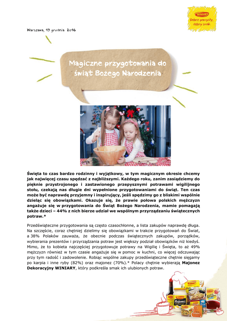 Warszawa, 19 grudnia 2016 Magiczne przygotowania do świąt Bożego Narodzenia Święta to czas bardzo rodzinny i wyjątkowy, w tym magicznym okresie chcemy jak najwięcej czasu spędzać z najbliższymi. Każdego roku, zanim zasiądziemy do pięknie przystrojonego i zastawionego przepysznymi potrawami wigilijnego stołu, czekają nas długie dni wypełnione przygotowaniami do świąt. Ten czas może być naprawdę przyjemny i inspirujący, jeśli spędzimy go z bliskimi wspólnie dzieląc się obowiązkami. Okazuje się, że prawie połowa polskich mężczyzn angażuje się w przygotowania do Świąt Bożego Narodzenia, mamie pomagają także dzieci – 44% z nich bierze udział we wspólnym przyrządzaniu świątecznych potraw.* Przedświąteczne przygotowania są często czasochłonne, a lista zakupów naprawdę długa. Na szczęście, coraz chętniej dzielimy się obowiązkami w trakcie przygotowań do Świat, a 38% Polaków zauważa, że obecnie podczas świątecznych zakupów, porządków, wybierania prezentów i przyrządzania potraw jest większy podział obowiązków niż kiedyś. Mimo, że to kobieta najczęściej przygotowuje potrawy na Wigilię i Święta, to aż 49% mężczyzn również w tym czasie angażuje się w pomoc w kuchni, co więcej odczuwając przy tym radość i zadowolenie. Robiąc wspólne zakupy przedświąteczne chętnie sięgamy po karpia i inne ryby (82%) oraz majonez (70%).* Polacy chętnie wybierają Majonez Dekoracyjny WINIARY, który podkreśla smak ich ulubionych potraw. Do naszych świątecznych koszyków trafia też barszcz czerwony (27%), bez którego niemal połowa Polaków nie wyobraża sobie tradycyjnej Wigilii.* Ulubionym barszczem czerwonym Polaków jest Barszcz Czerwony Ekspresowa Zupa WINIARY, który powstaje z najwyżej jakości buraków, uprawianych w Polsce, dzięki czemu ma doskonały kolor. A odpowiednio dobrana kompozycja aromatycznych przypraw i ziół gwarantuje idealne doprawienie**. Rodzinne przygotowania do świąt sprawiają, że ten gorący okres jest zdecydowanie łatwiejszy i przyjemniejszy. Wspólne zakupy, ubieranie choinki czy pichcenie w kuchni może być także doskonałą okazją do pogłębiania relacji, ważnych rozmów i wyjątkowego odkrywania magii Świąt. Dzielenie się obowiązkami daje dużo więcej frajdy i nie jest tak męczące jak samotna praca. Jak wynika z badania konsumenckiego przeprowadzonego na zlecenie marki WINIARY aż 64% Polaków podczas wspólnego przyrządzania posiłków odczuwa zadowolenie, 57% radość, a 22% dumę. Polscy mężczyźni coraz chętniej angażują się w przedświąteczne przygotowania, aż 49% pomaga żonie w kuchennych czynnościach, natomiast 22% samodzielnie przyrządza któreś z dań. W młodszych małżeństwach pomocna jest także często mama lub teściowa. Mamie w kuchni chętnie pomagają też dzieci, 44% pociech uczestniczy w szykowaniu potraw na Wigilię, głównie pomagając przy sałatce warzywnej i niekiedy lepiąc tradycyjne pierogi.* Więcej informacji na temat produktów marki WINIARY, dzięki którym świąteczne menu będzie wyjątkowe, a także mnóstwo oryginalnych przepisów na pyszne potrawy znajduje się na stronie www.winiary.pl *Badanie konsumenckie „Odkrywamy smaki rodzinnych chwil”, przeprowadzone przez firmę Millward Brown na zlecenie marki WINIARY (2014). **Nestle Polska dane Nielsen Retail Audit; rynek Total Polska (zdefiniowany jako suma Hipermarketów, Supermarketów, Dyskontów, Dużych Sklepów Spożywczych, Średnich Sklepów Spożywczych, Małych Sklepów Spożywczych, Kiosków, Stacji Benzynowych, Sklepów Winno-Cukierniczych), Wolumen i Wartość sprzedaży za okres XI 2015 - X 2016 w kategorii czerwonych barszczy do gotowania ## WINIARY to marka, która od lat jest gwarancją sukcesu w kuchni. Jej produkty inspirują współczesne panie domu do przygotowywania najsmaczniejszych potraw dla całej rodziny. Zupy, majonezy, buliony, sosy, Pomysł na…, dania instant, przyprawy, galaretki, kisiele czy budynie – w sumie ponad 230 różnych produktów kulinarnych WINIARY, które pozwalają w szybki i prosty sposób przyrządzić posiłek. Na stronie www.winiary.pl panie domu znajdą przepisy oraz inspiracje kulinarne na każdy dzień. Produkty marki WINIARY rokrocznie zdobywają liczne nagrody przyznawane przez konsumentów i detalistów. W 2011, 2012 oraz 2015 roku redakcja „Rzeczpospolitej” przyznała marce WINIARY prestiżowy tytuł Najmocniejszej Marki Roku. Kontakt do biura prasowego: Kamila Dębniak kom. +48 508 988 861 email: [email protected]