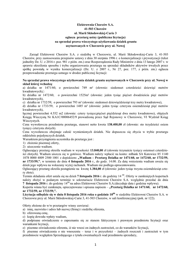 Elektrownia Chorzów S.A. 41-503 Chorzów ul. Marii Skłodowskiej-Curie 3 ogłasza przetarg ustny (publiczna licytacja) na sprzedaż prawa wieczystego użytkowania działek gruntu usytuowanych w Chorzowie przy ul. Nowej Zarząd Elektrowni Chorzów S.A. z siedzibą w Chorzowie, ul. Marii Skłodowskiej-Curie 3, 41-503 Chorzów, przy zastosowaniu przepisów ustawy z dnia 30 sierpnia 1996 r. o komercjalizacji i prywatyzacji (tekst jednolity Dz. U. z 2016 r. poz. 981 z późn. zm.) oraz Rozporządzenia Rady Ministrów z dnia 13 lutego 2007 r. w sprawie określenia sposobu i trybu organizowania przetargu na sprzedaż składników aktywów trwałych przez spółkę powstałą w wyniku komercjalizacji (Dz. U. z 2007 r., Nr 27, poz. 177, z późn. zm.) ogłasza przeprowadzenie przetargu ustnego w drodze publicznej licytacji: Na sprzedaż prawa wieczystego użytkowania działek gruntu usytuowanych w Chorzowie przy ul. Nowej w skład której wchodzą: a) działka nr 1471/60, o powierzchni 749 m² (słownie: siedemset czterdzieści dziewięć metrów kwadratowych),\ b) działka nr 1472/60, o powierzchni 1525m² (słownie: jeden tysiąc pięćset dwadzieścia pięć metrów kwadratowych), c) działka nr 1732/59, o powierzchni 793 m² (słownie: siedemset dziewięćdziesiąt trzy metry kwadratowe), d) działka nr 1733/59, o powierzchni 1485 m² (słownie: jeden tysiąc czterysta osiemdziesiąt pięć metrów kwadratowych), łącznej powierzchni 4.552 m2 (słownie: cztery tysięce;pięćset pięćdziesąt dwa metry kwadratowe), objętych Księgą Wieczystą Nr KA1C/00006452/9 prowadzoną przez Sąd Rejonowy w Chorzowie, VI Wydział Ksiąg Wieczystych. Cena wywoławcza przedmiotu przetargu, stanowi netto kwota 138.400,00 zł (słownie: sto trzydzieści osiem tysięcy czterysta złotych). Cena wywoławcza obejmuje całość wymienionych działek. Nie dopuszcza się zbycia w trybie przetargu oddzielnie pojedynczych działek. Warunkiem przystąpienia uczestnika do przetargu jest : 1) złożenie pisemnej oferty, 2) uiszczenie wadium. Ogłaszający przetarg określa wadium w wysokości 13.840,00 zł (słownie trzynaście tysięcy osiemset czterdzieści złotych). Wadium uiszcza się w gotówce. Wadium należy wpłacić na konto: mBank SA Katowice 85 1140 1078 0000 4009 2500 1001 z dopiskiem: „Wadium – Przetarg Działka nr 1471/60, nr 1472/60, nr 1732/59, nr 1733/59,”. w terminie do dnia 4 listopada 2016 r., do godz. 14.00. Za datę wniesienia wadium uważa się dzień jego wpływu na wskazany wyżej rachunek. Wadium nie podlega oprocentowaniu. Ogłaszający przetarg określa postąpienie na kwotę 1.384,00 zł (słownie: jeden tysiąc trzysta osiemdziesiąt cztery złote). Termin składania ofert ustala się na dzień 7 listopada 2016 r. do godziny 14 00. Oferty w zamkniętych kopertach należy złożyć w podanym terminie w sekretariacie Elektrowni Chorzów S.A. względnie przesłać do dnia 7 listopada 2016 r. do godziny 1400 na adres Elektrowni Chorzów S.A.(decyduje data i godzina wpływu). Koperta winna być zamknięta, opieczętowana i opisana napisem – „Przetarg Działka nr 1471/60, nr 1472/60, nr 1732/59, nr 1733/59,”. Licytacja odbędzie się w dniu 8 listopada 2016 roku o godzinie 1000 w siedzibie Elektrowni Chorzów S.A. w Chorzowie przy ul. Marii Skłodowskiej-Curie 3, 41-503 Chorzów, w sali konferencyjnej (pok. nr 122). Oferty złożone do w/w przetargów winny zawierać: a) imię, nazwisko i adres lub nazwę (firmę) i siedzibę oferenta, b) oferowaną cenę, c) kopię dowodu wpłaty wadium, d) podpisane oświadczenie o zapoznaniu się ze stanem faktycznym i prawnym przedmiotu licytacji oraz warunkami licytacji, e) pisemne oświadczenie oferenta, iż nie wnosi on żadnych zastrzeżeń, co do warunków licytacji, f) pisemne oświadczenia o nie wnoszeniu – teraz i w przyszłości – żadnych roszczeń i zastrzeżeń w tym przedmiocie względem Sprzedającego z tytułu ewentualnych wad przedmiotu sprzedaży, 1 g) aktualny wypis z rejestru przedsiębiorstw lub ewidencji podmiotów gospodarczych ( nie starszy niż 3 miesiące), h) oryginał pełnomocnictwa do reprezentowania uczestnika przetargu, i) kserokopię dokumentu potwierdzające tożsamość osoby, j) podpisane oświadczenie o zapoznaniu się z Specyfikacja sprzedawanych aktywów. Oferta winna być zszyta, strony ponumerowane, a zapisane podpisane lub parafowane przez osoby upoważnione. Do licytacji nie będzie dopuszczona osoba, która nie złożyła pisemnej oferty. Oferent związany jest ofertą w terminie 45 dni licząc od dnia przetargu. Po otwarciu ofert nastąpi przetarg ustny w drodze publicznej licytacji. Do licytacji zostaną dopuszczeni jedynie oferenci, którzy złożyli ważne oferty z ceną nie niższą niż cena wywoławcza. Stawienie się jednego uczestnika licytacji wystarcza do odbycia się licytacji. Ponadto osoba fizyczna będąca w związku małżeńskim obowiązana jest wskazać czy występuje w imieniu własnym, czy też zamierza nabyć nieruchomość w imieniu swoim i małżonka na majątek wspólny i wówczas obowiązana jest przedstawić zgodę drugiego małżonka na zakup nieruchomości bądź umowę o rozdzielności majątkowej. Cudzoziemcy mogą nabyć nieruchomość w wyniku niniejszego przetargu po spełnieniu warunków określonych w ustawie z dnia 24 marca 1920 r. o nabywaniu nieruchomości przez cudzoziemców (tekst jednolity: Dz. U. z 2004 r., Nr 167, poz. 1758 z późn. zm.). Dodatkowo każdy oferent powinien złożyć oświadczenie w trybie § 6 Rozporządzenia Rady Ministrów z 13 lutego 2007 roku w sprawie określenia sposobu i trybu organizowania przetargu na sprzedaż składników aktywów trwałych przez spółkę, powstałą w wyniku komercjalizacji (Dz.U. z 2007 r., Nr 27, poz. 177 z późn. zm.). Sprzedaż nastąpi na rzecz uczestnika licytacji, który zaoferuje najwyższą cenę. Nabywca będzie zobowiązany do zapłaty ceny nabycia najpóźniej na dzień przed podpisaniem umowy 