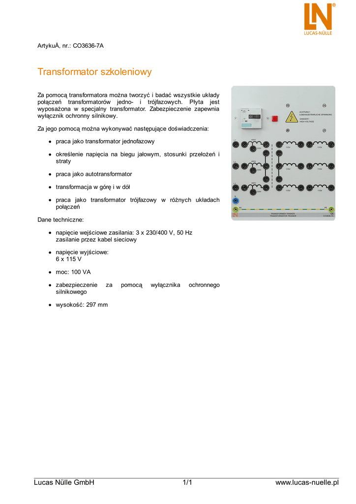 ArtykuÅ‚ nr.: CO3636-7A Transformator szkoleniowy Za pomocą transformatora można tworzyć i badać wszystkie układy połączeń transformatorów jedno- i trójfazowych. Płyta jest wyposażona w specjalny transformator. Zabezpieczenie zapewnia wyłącznik ochronny silnikowy. Za jego pomocą można wykonywać następujące doświadczenia: praca jako transformator jednofazowy określenie napięcia na biegu jałowym, stosunki przełożeń i straty praca jako autotransformator transformacja w górę i w dół praca jako transformator trójfazowy w różnych układach połączeń Dane techniczne: napięcie wejściowe zasilania: 3 x 230/400 V, 50 Hz zasilanie przez kabel sieciowy napięcie wyjściowe: 6 x 115 V moc: 100 VA zabezpieczenie silnikowego za pomocą wyłącznika ochronnego wysokość: 297 mm Lucas Nülle GmbH 1/1 www.lucas-nuelle.pl