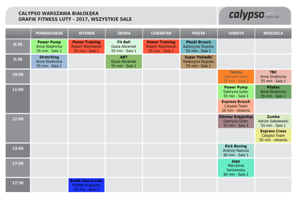 CALYPSO WARSZAWA BIAŁOŁĘKA GRAFIK FITNESS LUTY - 2017, WSZYSTKIE SALE 8:30 9:30 PONIEDZIAŁEK WTOREK ŚRODA CZWARTEK PIĄTEK Power Pump Anna Stadnicka 55 min - Sala 1 Power Training Robert Wasilewski 55 min - Sala 1 Fit Ball Gosia Abramek 55 min - Sala 1 Power Training Robert Wasilewski 55 min - Sala 1 Płaski Brzuch Katarzyna Słupska 55 min - Sala 1 Stretching Anna Stadnicka 55 min - Sala 1 ABT Gosia Abramek 55 min - Sala 1 10:00 11:00 SOBOTA NIEDZIELA Tabata Gabrysia Golec 55 min - Sala 1 TBC Anna Stadnicka 55 min - Sala 1 Power Pump Gabrysia Golec 55 min - Sala 1 Pilates Anna Stadnicka 55 min - Sala 1 Super Pośladki Katarzyna Słupska 55 min - Sala 1 Express Brzuch Calypso Team 20 min - siłownia Zdrowy Kręgosłup Gabrysia Golec 55 min - Sala 1 12:00 Zumba Adrian Sobolewski 55 min - Sala 1 Express Cross Calypso Team 30 min - siłownia Kick Boxing Andrzej Nastula 90 min - Sala 1 13:00 Joga Marcelina Sankowska 90 min - Sala 2 17:00 17:30 Break Dance kids Wojtek Krajewski 55 min - Sala 2 18:00 18:30 Zumba Adrian Sobolewski 55 min - Sala 1 Zdrowy Kręgosłup Dorota Baczyńska 55 min - Sala 1 TBC Anna Stadnicka 55 min - Sala 1 Trampoliny Karolina Skiba 55 min - Sala 1 Express Cross Calypso Team 30 min - siłownia Power Bike Katarzyna Kantek 55 min - Sala 2 Tabata Katarzyna Wojtkowska 55 min - Sala 2 Express Brzuch Calypso Team 20 min - siłownia Trampoliny Olga Jachowicz 55 min - Sala 1 Pilates Karolina Skiba 55 min - Sala 1 Express Brzuch Calypso Team 20 min - siłownia 19:00 TBC Anna Stadnicka 55 min - Sala 1 TBC Dorota Baczyńska 55 min - Sala 1 Power Bike Paweł Kwaśniewski 90 min - Sala 2 19:30 20:00 21:00 Express Brzuch Calypso Team 20 min - siłownia Zdrowy Kręgosłup Anna Stadnicka 55 min - Sala 1 Kick Boxing Andrzej Nastula 90 min - Sala 1 Power Training Robert Wasilewski 55 min - Sala 1 Salsation Ola Nadaj 55 min - Sala 1 Power Bike Paweł Kwaśniewski 90 min - Sala 2 Power Bike Katarzyna Kantek 55 min - Sala 2 Joga Marcelina Sankowska 90 min - Sala 2 Express Cross Calypso Team 30 min - siłownia Express Brzuch Calypso Team 20 min - siłownia Trampoliny Dorota Baczyńska 55 min - Sala 1 Stretching Olga Jachowicz 55 min - Sala 1 Kick Boxing Andrzej Nastula 90 min - Sala 1 Express Cross Calypso Team 30 min - siłownia Joga Marcelina Sankowska 90 min - Sala 2 Express Brzuch Calypso Team 20 min - siłownia TBC Karolina Skiba 55 min - Sala 1 Trampoliny Ola Nadaj 55 min - Sala 1 Pilates Anna Stadnicka 55 min - Sala 1