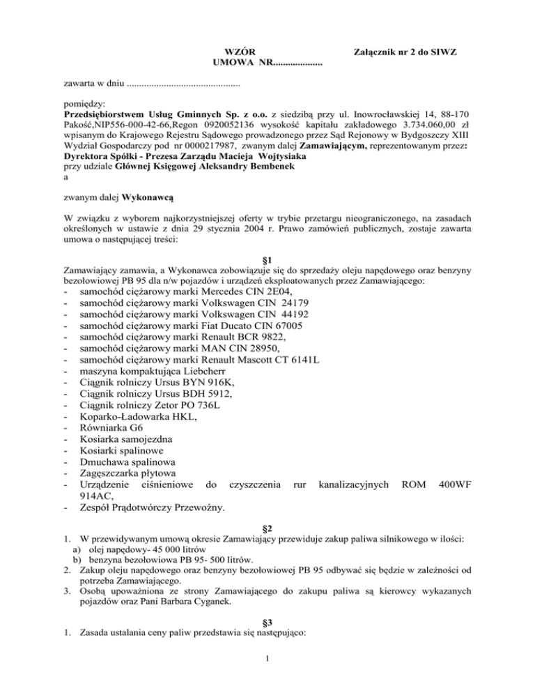 WZÓR UMOWA NR.................... Załącznik nr 2 do SIWZ zawarta w dniu .............................................. pomiędzy: Przedsiębiorstwem Usług Gminnych Sp. z o.o. z siedzibą przy ul. Inowrocławskiej 14, 88-170 Pakość,NIP556-000-42-66,Regon 0920052136 wysokość kapitału zakładowego 3.734.060,00 zł wpisanym do Krajowego Rejestru Sądowego prowadzonego przez Sąd Rejonowy w Bydgoszczy XIII Wydział Gospodarczy pod nr 0000217987, zwanym dalej Zamawiającym, reprezentowanym przez: Dyrektora Spółki - Prezesa Zarządu Macieja Wojtysiaka przy udziale Głównej Księgowej Aleksandry Bembenek a zwanym dalej Wykonawcą W związku z wyborem najkorzystniejszej oferty w trybie przetargu nieograniczonego, na zasadach określonych w ustawie z dnia 29 stycznia 2004 r. Prawo zamówień publicznych, zostaje zawarta umowa o następującej treści: §1 Zamawiający zamawia, a Wykonawca zobowiązuje się do sprzedaży oleju napędowego oraz benzyny bezołowiowej PB 95 dla n/w pojazdów i urządzeń eksploatowanych przez Zamawiającego: - samochód ciężarowy marki Mercedes CIN 2E04, samochód ciężarowy marki Volkswagen CIN 24179 samochód ciężarowy marki Volkswagen CIN 44192 samochód ciężarowy marki Fiat Ducato CIN 67005 samochód ciężarowy marki Renault BCR 9822, samochód ciężarowy marki MAN CIN 28950, samochód ciężarowy marki Renault Mascott CT 6141L maszyna kompaktująca Liebcherr Ciągnik rolniczy Ursus BYN 916K, Ciągnik rolniczy Ursus BDH 5912, Ciągnik rolniczy Zetor PO 736L Koparko-Ładowarka HKL, Równiarka G6 Kosiarka samojezdna Kosiarki spalinowe Dmuchawa spalinowa Zagęszczarka płytowa Urządzenie ciśnieniowe do czyszczenia rur kanalizacyjnych 914AC, Zespół Prądotwórczy Przewoźny. ROM 400WF §2 1. W przewidywanym umową okresie Zamawiający przewiduje zakup paliwa silnikowego w ilości: a) olej napędowy- 45 000 litrów b) benzyna bezołowiowa PB 95- 500 litrów. 2. Zakup oleju napędowego oraz benzyny bezołowiowej PB 95 odbywać się będzie w zależności od potrzeba Zamawiającego. 3. Osobą upoważniona ze strony Zamawiającego do zakupu paliwa są kierowcy wykazanych pojazdów oraz Pani Barbara Cyganek. §3 1. Zasada ustalania ceny paliw przedstawia się następująco: 1 cena 1 litra = cena bieżąca/ litr oleju napędowego - ............. zł rabatu cena 1 litra = cena bieżąca/ litr benzyny bezołowiowej PB 95 - .............. zł rabatu gdzie: cena bieżąca- cena brutto 1 litra paliwa obowiązująca na stacji w dniu tankowania. 2. Wykonawcę wiążą ceny wskazane w ofercie, która jest załącznikiem do niniejszej umowy i stanowi jej integralną część. 3. Zgodnie z planowaną ilością paliwa w okresie umowy, szacunkowa wartość zamówienia wynosić będzie nie więcej niż .......................... zł brutto. §4 Sprzedawca zapewnia właściwą jakość zakupywanego oleju napędowego i benzyny bezołowiowej PB 95 zgodnie z obowiązującymi w tym zakresie przepisami. §5 Zapłata wynagrodzenia, ustalonego w §3 następować będzie na podstawie faktur przelewem w terminie ………………… dni od daty wystawienia. §6 W przypadku nie wykonania lub nienależytego wykonania umowy strony zastrzegają sobie prawo dochodzenia odszkodowania w wysokości rzeczywiście poniesionej szkody. §7 1. Zmiana umowy wymaga formy pisemnej pod rygorem nieważności. 2. Zakazuje się zmian postanowień zawartej umowy w stosunku do treści oferty, na podstawie której dokonano wyboru Wykonawcy, chyba że konieczność wprowadzenia tych zmian wynika z okoliczności, których nie można było przewidzieć w chwili zawarcia umowy lub zmiany te zostały przewidziane w Specyfikacji Istotnych Warunków Zamówienia. §8 1. Umowa zostaje zawarta na czas określony, od dnia 01.02.2016r. do dnia 31.01.2017r. 2. W przypadku nienależytego wywiązywania się z obowiązków określonych w niniejszej umowie, każda ze stron ma prawo do jej rozwiązania z zachowaniem miesięcznego okresu wypowiedzenia, złożonym w formie pisemnej, ze skutkiem na koniec miesiąca kalendarzowego. 3. W razie zaistnienia istotnej zmiany okoliczności powodującej, że wykonanie umowy nie leży w interesie publicznym, czego nie można było przewidzieć w chwili zawarcia umowy, Zamawiający może odstąpić od umowy w terminie 30 dni od powzięcia wiadomości o tych okolicznościach. W takim przypadku Wykonawca może żądać wyłącznie wynagrodzenia należnego z tytułu wykonania części umowy. §9 Integralną część niniejszej umowy stanowi oferta Wykonawcy. §10 W sprawach nie uregulowanych niniejszą umową mają zastosowanie przepisy powszechnie obowiązujące. §11 Spory wynikłe na tle realizacji niniejszej umowy będzie rozstrzygał sąd powszechny właściwy dla siedziby Zamawiającego. §12 Umowę sporządzono w dwóch jednobrzmiących egzemplarzach, po jednym dla każdej ze stron. ZAMAWIAJĄCY WYKONAWCA 2