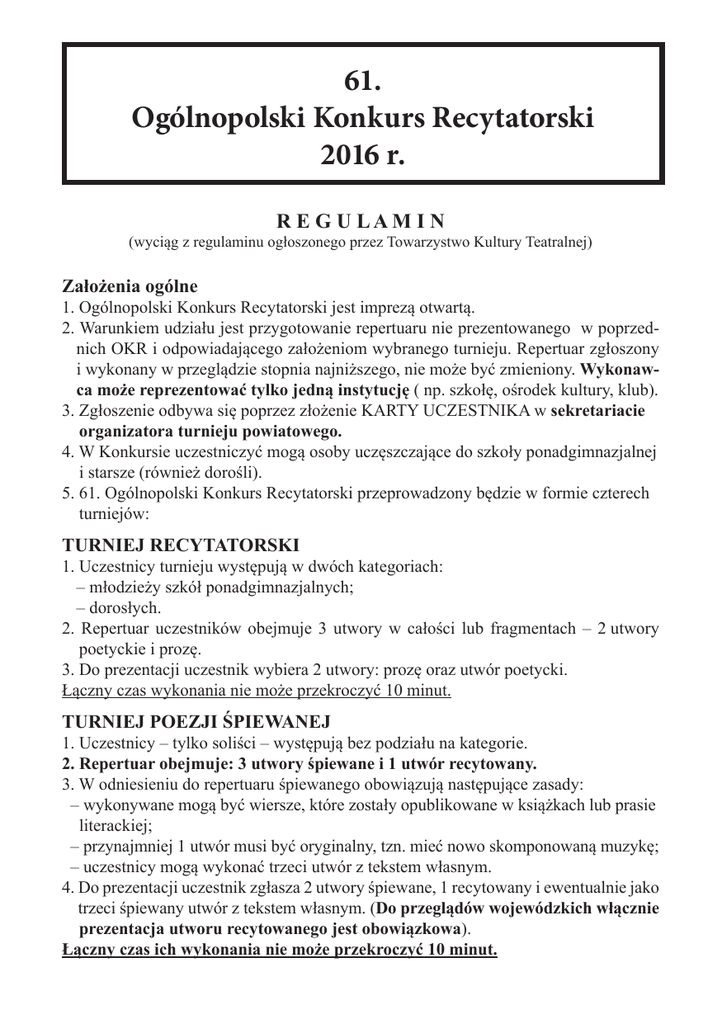 61. Ogólnopolski Konkurs Recytatorski 2016 r. R E G U LA M I N (wyciąg z regulaminu ogłoszonego przez Towarzystwo Kultury Teatralnej) Założenia ogólne 1. Ogólnopolski Konkurs Recytatorski jest imprezą otwartą. 2. Warunkiem udziału jest przygotowanie repertuaru nie prezentowanego w poprzednich OKR i odpowiadającego założeniom wybranego turnieju. Repertuar zgłoszony i wykonany w przeglądzie stopnia najniższego, nie może być zmieniony. Wykonawca może reprezentować tylko jedną instytucję ( np. szkołę, ośrodek kultury, klub). 3. Zgłoszenie odbywa się poprzez złożenie KARTY UCZESTNIKA w sekretariacie organizatora turnieju powiatowego. 4. W Konkursie uczestniczyć mogą osoby uczęszczające do szkoły ponadgimnazjalnej i starsze (również dorośli). 5. 61. Ogólnopolski Konkurs Recytatorski przeprowadzony będzie w formie czterech turniejów: TURNIEJ RECYTATORSKI 1. Uczestnicy turnieju występują w dwóch kategoriach: – młodzieży szkół ponadgimnazjalnych; – dorosłych. 2. Repertuar uczestników obejmuje 3 utwory w całości lub fragmentach – 2 utwory poetyckie i prozę. 3. Do prezentacji uczestnik wybiera 2 utwory: prozę oraz utwór poetycki. Łączny czas wykonania nie może przekroczyć 10 minut. TURNIEJ POEZJI ŚPIEWANEJ 1. Uczestnicy – tylko soliści – występują bez podziału na kategorie. 2. Repertuar obejmuje: 3 utwory śpiewane i 1 utwór recytowany. 3. W odniesieniu do repertuaru śpiewanego obowiązują następujące zasady: – wykonywane mogą być wiersze, które zostały opublikowane w książkach lub prasie literackiej; – przynajmniej 1 utwór musi być oryginalny, tzn. mieć nowo skomponowaną muzykę; – uczestnicy mogą wykonać trzeci utwór z tekstem własnym. 4. Do prezentacji uczestnik zgłasza 2 utwory śpiewane, 1 recytowany i ewentualnie jako trzeci śpiewany utwór z tekstem własnym. (Do przeglądów wojewódzkich włącznie prezentacja utworu recytowanego jest obowiązkowa). Łączny czas ich wykonania nie może przekroczyć 10 minut. 5. Do akompaniamentu może być stosowany 1 instrument lub mały zespół muzyczny (do 3 osób) bądź wcześniej dokonane nagranie (półplayback). 6. Utwór znany i posiadający określony kształt wykonawczy podlega ocenie tylko wówczas, gdy uczestnik przedstawił nową, własną interpretację. TURNIEJ TEATRÓW JEDNEGO AKTORA 1. Uczestnicy występują bez podziału na kategorie. 2. Uczestnicy przygotowują spektakl w oparciu o dowolny materiał literacki. Czas trwania nie może przekroczyć 30 minut. WYWIEDZIONE ZE SŁOWA 1. Uczestnicy występują bez podziału na kategorie. 2. Repertuar jest dowolny (np. wiersz lub jego fragment, monolog literacki, collage tekstów) 3. Dowolna forma prezentacji (np. teatr jednego wiersza, łączenie słowa mówionego ze śpiewem, z dźwiękiem, ruchem, rekwizytem). Czas występu nie może przekroczyć 7 minut. U w a g a : Przekroczenie limitu czasu przez wykonawcę może spowodować wyłączenie go z oceny przez Sąd Konkursowy. Ocena uczestników 1. Do oceny prezentacji konkursowych powołane zostaną przez organizatorów przeglądów Sądy Konkursowe właściwe dla stopnia przeglądu. 2. Nie mogą być jurorami w całej edycji OKR: a. wykonawcy uczestniczący w Konkursie; b. instruktorzy, których recytatorzy biorą udział w Konkursie. 3. Sądy Konkursowe dokonują oceny wg następujących kryteriów: – dobór repertuaru (wartości artystyczne utworów oraz ich dobór do możliwości wykonawczych uczestnika); – interpretacja utworów; – kultura słowa; – ogólny wyraz artystyczny; – w turnieju wywiedzione ze słowa Sądy Konkursowe uwzględniają ponadto: celowość użycia środków pozasłownych (np. kostiumu, dźwięku, elementów scenografii i innych) wspomagających interpretację, kompozycję sceniczną występu. – w turnieju teatrów jednego aktora Sądy Konkursowe uwzględnią również: opracowanie dramaturgiczne, opracowanie reżyserskie, wykonanie zadań aktorskich, inne elementy spektaklu – scenografia, muzyka. – w turnieju poezji śpiewanej Sądy Konkursowe uwzględniają także: zgodność muzyki z charakterem wiersza, muzykalność i warunki głosowe wykonawcy, wartości artystyczne muzyki. Przebieg konkursu w województwie lubelskim 1. W województwie lubelskim obowiązują trzystopniowe eliminacje: środowiskowe (szkolne, gminne, miejskie), powiatowe (rejonowe) i wojewódzkie. Uwaga! W nie- których powiatach eliminacje nie będą się odbywać – wówczas chętni zgłaszają się do innych, wyznaczonych placówek – lista na str. 4 regulaminu. 2. Zasady udziału w turniejach powiatowych (rejonowych) ustalają ich organiza torzy. Turnieje powinny zakończyć się przed 11 kwietnia 2016 r. Organizatorzy eliminacji powiatowych (rejonowych) są zobowiązni do przesłania protokołów i kart uczestników w nieprzekraczalnym terminie 12 kwietnia 2016 r. (Proszę pamiętać o tym, że listy zwykłe docierają do nas nawet po tygodniu od ich wysłania). Adres: Wojewódzki Ośrodek Kultury, ul. Dolna Panny Marii 3, 20-010 Lublin, fax. 81 53 237 75, osoba odpowiedzialna: Anna Kistelska, e-mail: [email protected] Nominacje z Turniejów Powiatowych: Jury, typuje do udziału w Turnieju Wojewódzkim: z turnieju recytatorskiego – jednego recytatora; z turniejów poezji śpiewanej, teatru jednego aktora, „wywiedzione ze słowa” – po jednym uczestniku; powiatowy Sąd Konkursowy może dodatkowo zakwalifikować w turnieju recytatorskim jednego wykonawcę – uczestnika Spotkania Finałowego 60. OKR 2015, jeżeli uzyskał nagrodę w przeglądzie powiatowym obecnego Konkursu. Turnieje powiatowe (rejonowe) - ogłoszenia Powiatowy Młodzieżowy Dom Kultury w Lubartowie Organizator:........................................................................................................................ 11.04.16 godz. termin 10.00 zgłoszeń..................................................... 4 kwietnia 2016 Termin eliminacji.