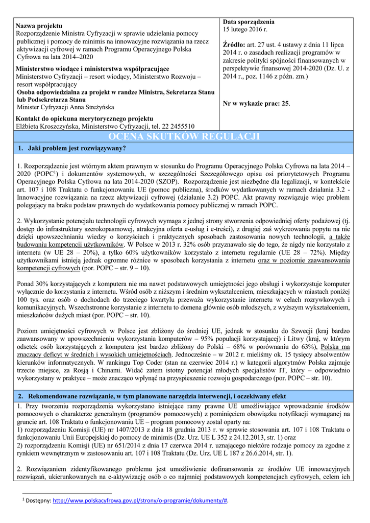 Nazwa projektu Rozporządzenie Ministra Cyfryzacji w sprawie udzielania pomocy publicznej i pomocy de minimis na innowacyjne rozwiązania na rzecz aktywizacji cyfrowej w ramach Programu Operacyjnego Polska Cyfrowa na lata 2014–2020 Ministerstwo wiodące i ministerstwa współpracujące Ministerstwo Cyfryzacji – resort wiodący, Ministerstwo Rozwoju – resort współpracujący Osoba odpowiedzialna za projekt w randze Ministra, Sekretarza Stanu lub Podsekretarza Stanu Minister Cyfryzacji Anna Streżyńska Data sporządzenia 15 lutego 2016 r. Źródło: art. 27 ust. 4 ustawy z dnia 11 lipca 2014 r. o zasadach realizacji programów w zakresie polityki spójności finansowanych w perspektywie finansowej 2014-2020 (Dz. U. z 2014 r., poz. 1146 z późn. zm.) Nr w wykazie prac: 25. Kontakt do opiekuna merytorycznego projektu Elżbieta Kroszczyńska, Ministerstwo Cyfryzacji, tel. 22 2455510 OCENA SKUTKÓW REGULACJI 1. Jaki problem jest rozwiązywany? 1. Rozporządzenie jest wtórnym aktem prawnym w stosunku do Programu Operacyjnego Polska Cyfrowa na lata 2014 – 2020 (POPC1) i dokumentów systemowych, w szczególności Szczegółowego opisu osi priorytetowych Programu Operacyjnego Polska Cyfrowa na lata 2014-2020 (SZOP). Rozporządzenie jest niezbędne dla legalizacji, w kontekście art. 107 i 108 Traktatu o funkcjonowaniu UE (pomoc publiczna), środków wydatkowanych w ramach działania 3.2 Innowacyjne rozwiązania na rzecz aktywizacji cyfrowej (działanie 3.2) POPC. Akt prawny rozwiązuje więc problem polegający na braku podstaw prawnych do wydatkowania pomocy publicznej w ramach POPC. 2. Wykorzystanie potencjału technologii cyfrowych wymaga z jednej strony stworzenia odpowiedniej oferty podażowej (tj. dostęp do infrastruktury szerokopasmowej, atrakcyjna oferta e-usług i e-treści), z drugiej zaś wykreowania popytu na nie dzięki upowszechnianiu wiedzy o korzyściach i praktycznych sposobach zastosowania nowych technologii, a także budowaniu kompetencji użytkowników. W Polsce w 2013 r. 32% osób przyznawało się do tego, że nigdy nie korzystało z internetu (w UE 28 – 20%), a tylko 60% użytkowników korzystało z internetu regularnie (UE 28 – 72%). Między użytkownikami istnieją jednak ogromne różnice w sposobach korzystania z internetu oraz w poziomie zaawansowania kompetencji cyfrowych (por. POPC – str. 9 – 10). Ponad 30% korzystających z komputera nie ma nawet podstawowych umiejętności jego obsługi i wykorzystuje komputer wyłącznie do korzystania z internetu. Wśród osób z niższym i średnim wykształceniem, mieszkających w miastach poniżej 100 tys. oraz osób o dochodach do trzeciego kwartylu przeważa wykorzystanie internetu w celach rozrywkowych i komunikacyjnych. Wszechstronne korzystanie z internetu to domena głównie osób młodszych, z wyższym wykształceniem, mieszkańców dużych miast (por. POPC – str. 10). Poziom umiejętności cyfrowych w Polsce jest zbliżony do średniej UE, jednak w stosunku do Szwecji (kraj bardzo zaawansowany w upowszechnieniu wykorzystania komputerów – 95% populacji korzystającej) i Litwy (kraj, w którym odsetek osób korzystających z komputera jest bardzo zbliżony do Polski – 68% w porównaniu do 63%), Polska ma znaczący deficyt w średnich i wysokich umiejętnościach. Jednocześnie – w 2012 r. mieliśmy ok. 15 tysięcy absolwentów kierunków informatycznych. W rankingu Top Coder (stan na czerwiec 2014 r.) w kategorii algorytmów Polska zajmuje trzecie miejsce, za Rosją i Chinami. Widać zatem istotny potencjał młodych specjalistów IT, który – odpowiednio wykorzystany w praktyce – może znacząco wpłynąć na przyspieszenie rozwoju gospodarczego (por. POPC – str. 10). 2. Rekomendowane rozwiązanie, w tym planowane narzędzia interwencji, i oczekiwany efekt 1. Przy tworzeniu rozporządzenia wykorzystano istniejące ramy prawne UE umożliwiające wprowadzanie środków pomocowych o charakterze generalnym (programów pomocowych) z pominięciem obowiązku notyfikacji wymaganej na gruncie art. 108 Traktatu o funkcjonowaniu UE – program pomocowy został oparty na: 1) rozporządzeniu Komisji (UE) nr 1407/2013 z dnia 18 grudnia 2013 r. w sprawie stosowania art. 107 i 108 Traktatu o funkcjonowaniu Unii Europejskiej do pomocy de minimis (Dz. Urz. UE L 352 z 24.12.2013, str. 1) oraz 2) rozporządzeniu Komisji (UE) nr 651/2014 z dnia 17 czerwca 2014 r. uznającego niektóre rodzaje pomocy za zgodne z rynkiem wewnętrznym w zastosowaniu art. 107 i 108 Traktatu (Dz. Urz. UE L 187 z 26.6.2014, str. 1). 2. Rozwiązaniem zidentyfikowanego problemu jest umożliwienie dofinansowania ze środków UE innowacyjnych rozwiązań, ukierunkowanych na e-aktywizację osób o co najmniej podstawowych kompetencjach cyfrowych, celem ich 1 Dostępny: http://www.polskacyfrowa.gov.pl/strony/o-programie/dokumenty/#. podniesienia i rozwoju poprzez praktyczne stosowanie, np. przez naukę programowania, czy też obsługi oprogramowania do tworzenia multimediów. Wspierane projekty mogą przyjmować formę instytucjonalną (np. medialab) lub formę realizacji wspólnych przedsięwzięć (projektów) informatyczno-społecznych, tj. udziału w pracach projektowych służących budowie lub rozwijaniu aplikacji, jak również warsztatów tematycznych (np. typu hackathon, codefest) oraz różnych form samokształcenia na odległość (np. e-learning, masowe otwarte kursy online) lub form mieszanych. Zakłada się również wsparcie tworzenia oprogramowania, w tym aplikacji na rzecz rozwijania kompetencji cyfrowych oraz cyfrowej aktywizacji. Interwencja realizowana w ramach niniejszego działania przyczyni się do zwiększenia stopnia i jakość korzystania z TIK (technologie informacyjno-komunikacyjne), a przez to zwiększenia wykorzystania e-usług publicznych. Działanie przyczyni się także do e-aktywizacji społeczeństwa poprzez nabywanie i rozwijanie kompetencji cyfrowych oraz do rozwoju kapitału społecznego i twórcz