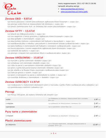 menu wygenerowane: 2011-07-08 23:36:06 sprawdź aktualną wersję: • www.pyzatachata.pl/menu/ • www.pyzatachata.pl/menu/pdf/ Zestaw EKO - 9.87zł <p>kasza gryczana z sosem pieczarkowym ogórkiem kiszonym + zupa</p> <p>pierogi ruskie 8szt.ze skawuszkami lub śmietaną + zupa</p> <p>placki ziemniaczane 4szt. ze śmietaną lub sosem pieczarkowym+ zupa</p> Zestaw SYTY - 13.47zł <p>placek po zbójnicku + zupa</p> <p>sos węgierski z kaszą gryczaną z ogórkiem kiszonym+ zupa</p> <p>dwa gołąbki z ziemniakami +zupa</p> <p>dwa kotlety mielone z ziemniakami lub frytkami z buraczkami + zupa</p> <p>wątróbka z cebulką i pieczarkami z ziemniakami zestaw surówek+ zupa</p> <p>pęto kiełbasy z ziemniakami lub frytkami z zestawem surówek+ zupa</p> <p>kasza gryczana z sosem węgierskim ogórkiem kiszonym+ zupa</p> <p>naleśniki do wyboru + zupa</p> <p>pierogi z mięsem lub szpinakowe (8szt.)+surówka+ zupa</p> Zestaw KRÓLEWSKI - 15.87zł <p>karczek z grilla+ziemniaki+dodatki+zupa</p> <p>schabowy xxl+ziemniaki+dodatki+zupa</p> <p>ryba na parze z warzywami+ziemniaki+dodatki+zupa</p> <p>pierś z grilla lub panierowana+ziemniaki+dodatki+zupa</p> <p>de volaille a la Pyzata Chata+ziemniaki+surówka+zupa</p> <p>ryba po grecku z ryżem +zupa</p> <p>pierś z wzrzywami na parze z ziemniakami lu ryżem + zupa</p> <p>szaszłyk drobiowy z ziemniakami + dodatki+ zupa</p> Zestaw DZIECIĘCY 11.97zł <p>rosół z makaronem domowym+pierś z kurczaka z grilla+frytki+surówka+zabawka</p> <p>pomidorowa+naleśnik+zabawka</p> Pierogi <p>Porcja 100 gram, do wyboru śmietana lub skwarki</p> ruskie <p>Podawane ze śmietaną i skwaruszkami lub w zestawie Eko</p> 1.97 PLN z mięsem <p>podawane ze skwaruszkami i śmietaną</p> 2.47 PLN szpinakowe <p>z czosnkiem i serem feta</p> 2.47 PLN <p>podawane ze skwarkami i śmietaną</p> 2.47 PLN 12.87 PLN Pyzy tarte z ziemniaków z mięsem Placki ziemniaczane po zbójnicku <p>z farszem węgierskim , dostępny również w zestawie: SYTY</p> >1< menu wygenerowane: 2011-07-08 23:36:06 sprawdź aktualną wersję: • www.pyzatachata.pl/menu/ • www.pyzatachata.pl/menu/pdf/ <p>dostępny również w zestawie: EKO z sosem grzybowym</p> 1.87 PLN rosół z makaronem domowym 3.77 PLN pomidorowa z makaronem domowym lub ryżem 3.77 PLN flaki 5.87 PLN Zupa dnia <p>codziennie inna zupa pytaj o ofertę w restauracji</p> 3.77 PLN z serem, owocami i bitą śmietaną <p>podawany z dipem do wyboru :owoce leśne truskawka lub czekolada</p> 9.77 PLN z farszem starolubelskim <p>z grzybami, marchewką, wędzonką i sosem śmietanowym</p> 9.77 PLN z nutellą i bananami <p> podawany z dipem czekoladowym 9.77 PLN ze szpinakiem <p> podawany z sosem pieczarkowym 9.77 PLN karczek <p>opiekany na ruszcie węglowym podawany z sosem. Dostępny również w zestawie Królewskim</p> 8.47 PLN pierś z kurczaka <p>podawana z sosem i masełkiem czosnkowym. Dostępny również w zestawie Królewskim</p> 8.47 PLN pęto kielbasy z rusztu opiekana na ruszcie węglowym podawana z sosem . Dostępna również w zestawie sytym 6.47 PLN korytko grillowe na 4 osoby <p>karczek x 2, pierś z kurczaka x 2, kiełbasa + ziemniaki i surówki</p> 45.70 PLN ze śmietaną Zupy Naleśniki Mięsiwa z grilla Mięsa duszone/smażone pierś z kurczaka panierowana 7.87 PLN mielony 2.97 PLN wątróbka <p>zapiekana z cebulką i groszkiem</p> 5.97 PLN gołąbki 2.97 PLN kotlet schabowy xxl 8.87 PLN ryba na parze z warzywami 9.57 PLN de volaille a'la Pyzata Chata napchany serem grzybami masłem doprawiony chrzanem i musztardą 9.97 PLN Sałatki >2< menu wygenerowane: 2011-07-08 23:36:06 sprawdź aktualną wersję: • www.pyzatachata.pl/menu/ • www.pyzatachata.pl/menu/pdf/ <p>własna kompozycja do wyboru warzywa sery mięsa warzywa marynowane sosy itp.</p> 7.97 PLN ciasta domowe 4.87 PLN tiramisu 5.87 PLN puchar owocowy 5.17 PLN frytki małe 2.97 PLN frytki duże 3.87 PLN ziemniaki zapiekane z cebulą 3.67 PLN buraczki zasmażane 3.67 PLN warzywa z wody 3.97 PLN ziemniaki puree 3.27 PLN kapusta zasmażana 3.67 PLN Ryż 3.27 PLN surówka z kiszonej kapusty z jabłkiem 3.27 PLN surówka z marchewki z chrzanem 3.27 PLN dip czosnkowy 0.97 PLN dip paprykowy 0.97 PLN chleb własny wypiek, zawsze świeży 0.97 PLN soki cappy 0,33 3.87 PLN coca-cola, sprite, fanta, nestea <p>0,5l.</p> 4.87 PLN kropla beskidu <p>0,5l</p> 3.87 PLN kompot domowy 1.97 PLN zsiadłe mleko 3.87 PLN bar sałatkowy Desery Dodatki Napoje >3<