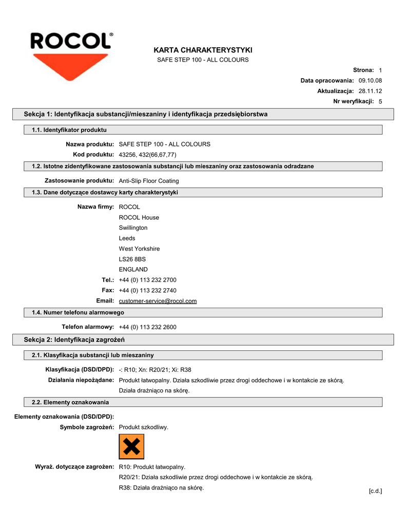 KARTA CHARAKTERYSTYKI SAFE STEP 100 - ALL COLOURS Strona: 1 Data opracowania: 09.10.08 Aktualizacja: 28.11.12 Nr weryfikacji: 5 Sekcja 1: Identyfikacja substancji/mieszaniny i identyfikacja przedsiębiorstwa 1.1. Identyfikator produktu Nazwa produktu: SAFE STEP 100 - ALL COLOURS Kod produktu: 43256, 432(66,67,77) 1.2. Istotne zidentyfikowane zastosowania substancji lub mieszaniny oraz zastosowania odradzane Zastosowanie produktu: Anti-Slip Floor Coating 1.3. Dane dotyczące dostawcy karty charakterystyki Nazwa firmy: ROCOL ROCOL House Swillington Leeds West Yorkshire LS26 8BS ENGLAND Tel.: +44 (0) 113 232 2700 Fax: +44 (0) 113 232 2740 Email: [email protected] 1.4. Numer telefonu alarmowego Telefon alarmowy: +44 (0) 113 232 2600 Sekcja 2: Identyfikacja zagrożeń 2.1. Klasyfikacja substancji lub mieszaniny Klasyfikacja (DSD/DPD): -: R10; Xn: R20/21; Xi: R38 Działania niepożądane: Produkt łatwopalny. Działa szkodliwie przez drogi oddechowe i w kontakcie ze skórą. Działa drażniąco na skórę. 2.2. Elementy oznakowania Elementy oznakowania (DSD/DPD): Symbole zagrożeń: Produkt szkodliwy. Wyraż. dotyczące zagrożen: R10: Produkt łatwopalny. R20/21: Działa szkodliwie przez drogi oddechowe i w kontakcie ze skórą. R38: Działa drażniąco na skórę. [c.d.] KARTA CHARAKTERYSTYKI SAFE STEP 100 - ALL COLOURS Strona: 2 Wyraż. dotyczące bezpiecz.: S36/37: Nosić odpowiednią odzież ochronną i odpowiednie rękawice ochronne. 2.3. Inne zagrożenia PBT: Substancji nie oznaczono jako substancji trwałej, ulegającej bioakumulacji i toksycznej (tzw. substancja PBT). Sekcja 3: Skład/informacja o składnikach 3.2. Mieszaniny Składniki niebezpieczne: XYLENE EINECS 215-535-7 CAS 1330-20-7 Klasyfikacja (DSD/DPD) Klasyfikacja (CLP) Procento wa -: R10; Xn: R20/21; Xi: R38 Flam. Liq. 3: H226; Acute Tox. 4: H332; Acute Tox. 4: H312; Skin Irrit. 2: H315 10-30% F: R11; Xn: R20 Flam. Liq. 2: H225; Acute Tox. 4: H332 1-10% ETHYLBENZENE 202-849-4 100-41-4 Sekcja 4: Środki pierwszej pomocy 4.1. Opis środków pierwszej pomocy Kontakt ze skórą Natychmiast zmyć dużą ilością wody z mydłem. Zdjąć natychmiast zanieczyszczoną odzież i obuwie, chyba że są przyklejone do skóry. Obtain medical attention if soreness or redness persists. Zanieczyszczenie oka Płukać oko pod bieżącą wodą przez 15 minut. Obtain medical attention if soreness or redness persists. Spożycie: Przemyć jamę ustną wodą. Nie należy wywoływać wymiotów. Jeśli poszkodowany jest przytomny, to należy mu podać natychmiast pół litra wody do wypicia. Seek medical attention if you feel unwell. Wdychanie: Wynieść poszkodowanego z zagrożonego miejsca dbając przy tym o własne bezpieczeństwo. Seek medical attention if you feel unwell. 4.2. Najważniejsze ostre i opóźnione objawy oraz skutki narażenia Kontakt ze skórą W miejscu zetknięcia może wystąpić podrażnienie i zaczerwienienie. Zanieczyszczenie oka Może wystąpić podrażnienie i zaczerwienienie. Może wystąpić silne łzawienie oczu. Spożycie: Może wystąpić podrażnienie i zaczerwienienie jamy ustnej i gardła. Mogą wystąpić wymioty. Wdychanie: Może wystąpić podrażnienie gardła z odczuciem ucisku w klatce piersiowej. 4.3. Wskazania dotyczące wszelkiej natychmiastowej pomocy lekarskiej i szczególnego postępowania z poszkodowanym [c.d.] KARTA CHARAKTERYSTYKI SAFE STEP 100 - ALL COLOURS Strona: 3 Sekcja 5: Postępowanie w przypadku pożaru 5.1. Środki gaśnicze Środki gaśnicze: Ditlenek węgla. Proszek gaśniczy. Do schłodzenia pojemników zastosować pył wodny. 5.2. Szczególne zagrożenia związane z substancją lub mieszaniną Zagroż. w przyp. naraż.: Produkt łatwopalny. Podczas spalania wydziela toksyczne dymy. 5.3. Informacje dla straży pożarnej Informacje dla straży pożarnej: Zastosować niezależny aparat oddechowy. W celu zapobieżenia zetknięciu ze skórą i dostaniem do oczu należy nosić odzież ochronną. Sekcja 6: Postępowanie w przypadku niezamierzonego uwolnienia do środowiska 6.1. Indywidualne środki ostrożności, wyposażenie ochronne i procedury w sytuacjach awaryjnych Śr. ostrożn. wzgledem ludzi: Informacje odnośnie ochrony osobistej podano w punkcie 8 karty bezpieczeństwa. Aby zapobiec dalszemu wyciekowi obrócić cieknące pojemniki tak, by miejsce cieknące znalazło się u góry. Wyeliminować wszelkie źródła ognia. 6.2. Środki ostrożności w zakresie ochrony środowiska Śr. ostrożn. wzgl. środ.: Nie wylewać do kanalizacji lub do rzeki. Powstrzymać dalszy rozlew za pomocą obwałowania. 6.3. Metody i materiały zapobiegające rozprzestrzenianiu się skażenia i służące do usuwania skażenia Procedury usuwania: Zmieszać piasek z wermikulitem. Przenieść do zamykanego, opisanego pojemnika awaryjnego w celu likwidacji odpowiednią metodą. Podczas akcji oczyszczania nie stosować urządzeń iskrzących. 6.4. Odniesienia do innych sekcji Sekcja 7: Postępowanie z substancjami i mieszaninami oraz ich magazynowanie 7.1. Środki ostrożności dotyczące bezpiecznego postępowania Wymagania przy manipul.: Unikać bezpośredniego kontaktu z daną substancją. Zapewnić odpowiednie przewietrzanie danego obszaru. Nie manipulować w przestrzeni zamkniętej. Palenie zabronione! 7.2. Warunki bezpiecznego magazynowania, łącznie z informacjami dotyczącymi wszelkich wzajemnych niezgodności Warunki magazynowania: Przechowywać w chłodnym, dobrze wentylowanym miejscu Przechowywać pojemnik szczelnie zamknięty. Przechowywać z dala od źródeł ognia. Odpowiednie opakowanie: Może być przechowywany wyłącznie w oryginalnym opakowaniu. 7.3. Szczególne zastosowanie(-a) końcowe [c.d.] KARTA CHARAKTERYSTYKI SAFE STEP 100 - ALL COLOURS Strona: 4 Sekcja 8: Kontrola narażenia/środki ochrony indywidualnej 8.1. Parametry dotyczące kontroli Składniki niebezpieczne: XYLENE Dopuszcz. stęż. w miejsc. zamiesz. TWA 8 godz EU Pył wdychany STEL 15 min TWA 8 godz STEL 15 min 50 ppm 100 pp