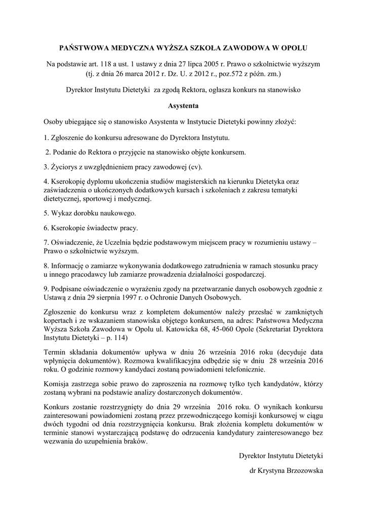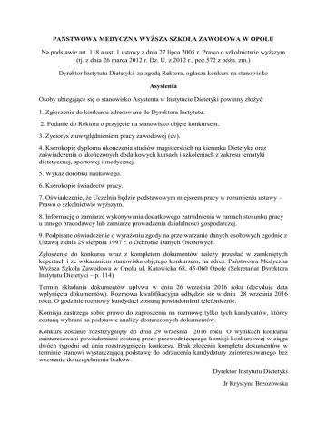 PAŃSTWOWA MEDYCZNA WYŻSZA SZKOŁA ZAWODOWA W OPOLU Na podstawie art. 118 a ust. 1 ustawy z dnia 27 lipca 2005 r. Prawo o szkolnictwie wyższym (tj. z dnia 26 marca 2012 r. Dz. U. z 2012 r., poz.572 z późn. zm.) Dyrektor Instytutu Dietetyki za zgodą Rektora, ogłasza konkurs na stanowisko Asystenta Osoby ubiegające się o stanowisko Asystenta w Instytucie Dietetyki powinny złożyć: 1. Zgłoszenie do konkursu adresowane do Dyrektora Instytutu. 2. Podanie do Rektora o przyjęcie na stanowisko objęte konkursem. 3. Życiorys z uwzględnieniem pracy zawodowej (cv). 4. Kserokopię dyplomu ukończenia studiów magisterskich na kierunku Dietetyka oraz zaświadczenia o ukończonych dodatkowych kursach i szkoleniach z zakresu tematyki dietetycznej, sportowej i medycznej. 5. Wykaz dorobku naukowego. 6. Kserokopie świadectw pracy. 7. Oświadczenie, że Uczelnia będzie podstawowym miejscem pracy w rozumieniu ustawy – Prawo o szkolnictwie wyższym. 8. Informację o zamiarze wykonywania dodatkowego zatrudnienia w ramach stosunku pracy u innego pracodawcy lub zamiarze prowadzenia działalności gospodarczej. 9. Podpisane oświadczenie o wyrażeniu zgody na przetwarzanie danych osobowych zgodnie z Ustawą z dnia 29 sierpnia 1997 r. o Ochronie Danych Osobowych. Zgłoszenie do konkursu wraz z kompletem dokumentów należy przesłać w zamkniętych kopertach i ze wskazaniem stanowiska objętego konkursem, na adres: Państwowa Medyczna Wyższa Szkoła Zawodowa w Opolu ul. Katowicka 68, 45-060 Opole (Sekretariat Dyrektora Instytutu Dietetyki – p. 114) Termin składania dokumentów upływa w dniu 26 września 2016 roku (decyduje data wpłynięcia dokumentów). Rozmowa kwalifikacyjna odbędzie się w dniu 28 września 2016 roku. O godzinie rozmowy kandydaci zostaną powiadomieni telefonicznie. Komisja zastrzega sobie prawo do zaproszenia na rozmowę tylko tych kandydatów, którzy zostaną wybrani na podstawie analizy dostarczonych dokumentów. Konkurs zostanie rozstrzygnięty do dnia 29 września 2016 roku. O wynikach konkursu zainteresowani powiadomieni zostaną przez przewodniczącego komisji konkursowej w ciągu dwóch tygodni od dnia rozstrzygnięcia konkursu. Brak złożenia kompletu dokumentów w terminie stanowi wystarczającą podstawę do odrzucenia kandydatury zainteresowanego bez wezwania do uzupełnienia braków. Dyrektor Instytutu Dietetyki dr Krystyna Brzozowska