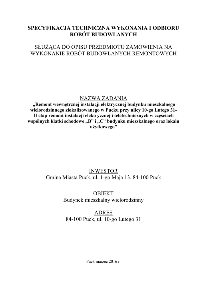 wielorodzinnego zlokalizowanego w Pucku przy ulicy 10-go Lutego 31II etap remont instalacji elektrycznej i teletechnicznych w częściach