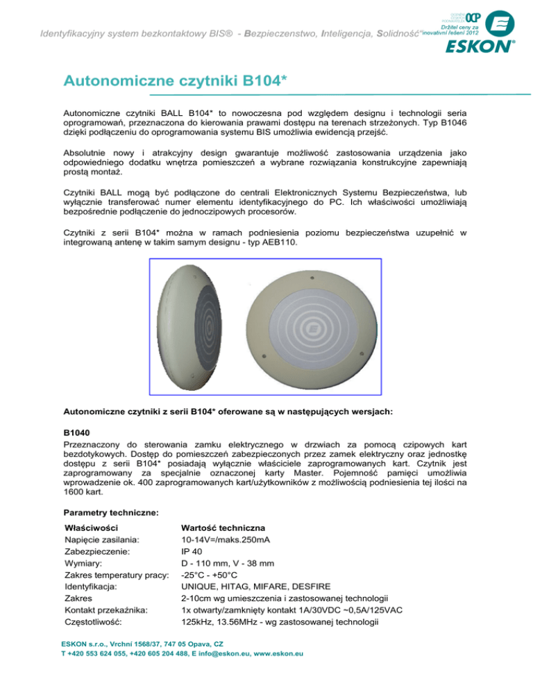 Identyfikacyjny system bezkontaktowy BIS® - Bezpieczenstwo, Inteligencja, Solidność“ Autonomiczne czytniki B104* Autonomiczne czytniki BALL B104* to nowoczesna pod względem designu i technologii seria oprogramowań, przeznaczona do kierowania prawami dostępu na terenach strzeżonych. Typ B1046 dzięki podłączeniu do oprogramowania systemu BIS umożliwia ewidencją przejść. Absolutnie nowy i atrakcyjny design gwarantuje możliwość zastosowania urządzenia jako odpowiedniego dodatku wnętrza pomieszczeń a wybrane rozwiązania konstrukcyjne zapewniają prostą montaż. Czytniki BALL mogą być podłączone do centrali Elektronicznych Systemu Bezpieczeństwa, lub wyłącznie transferować numer elementu identyfikacyjnego do PC. Ich właściwości umożliwiają bezpośrednie podłączenie do jednoczipowych procesorów. Czytniki z serii B104* można w ramach podniesienia poziomu bezpieczeństwa uzupełnić w integrowaną antenę w takim samym designu - typ AEB110. Autonomiczne czytniki z serii B104* oferowane są w następujących wersjach: B1040 Przeznaczony do sterowania zamku elektrycznego w drzwiach za pomocą czipowych kart bezdotykowych. Dostęp do pomieszczeń zabezpieczonych przez zamek elektryczny oraz jednostkę dostępu z serii B104* posiadają wyłącznie właściciele zaprogramowanych kart. Czytnik jest zaprogramowany za specjalnie oznaczonej karty Master. Pojemność pamięci umożliwia wprowadzenie ok. 400 zaprogramowanych kart/użytkowników z możliwością podniesienia tej ilości na 1600 kart. Parametry techniczne: Właściwości Napięcie zasilania: Zabezpieczenie: Wymiary: Zakres temperatury pracy: Identyfikacja: Zakres Kontakt przekaźnika: Częstotliwość: Wartość techniczna 10-14V=/maks.250mA IP 40 D - 110 mm, V - 38 mm -25°C - +50°C UNIQUE, HITAG, MIFARE, DESFIRE 2-10cm wg umieszczenia i zastosowanej technologii 1x otwarty/zamknięty kontakt 1A/30VDC ~0,5A/125VAC 125kHz, 13.56MHz - wg zastosowanej technologii ESKON s.r.o., Vrchní 1568/37, 747 05 Opava, CZ T +420 553 624 055, +420 605 204 488, E [email protected], www.eskon.eu Identyfikacyjny system bezkontaktowy BIS® - Bezpieczenstwo, Inteligencja, Solidność“ Autonomiczne czytniki B104* Właściwości Ilość dopuszczalnych kart: Wartość techniczna 400 ( opcja zwiększenia na maks.1600) B1042 Czytnik B1042 służy do transferu numeru identyfikacyjnego karty bezdotykowej do urządzenia z interfejsem WIEGAND. Przeznaczony do podłączenie do centrali Elektronicznego Systemu Bezpieczeństwa, Elektronicznego Systemu Ochrony Przeciwpożarowej oraz innych urządzeń peryferyjnych. Parametry techniczne: Właściwości Napięcie zasilania: Zabezpieczenie: Wymiary: Zakres temperatury pracy: Identyfikacja: Zakres Kontakt przekaźnika: Częstotliwość: Wyjście danych: Wartość techniczna 10-14V=/maks.250mA IP 40 D - 110 mm, V - 38 mm -25°C - +50°C UNIQUE, HITAG, MIFARE, DESFIRE 2-10cm wg umieszczenia i zastosowanej technologii 1x otwarty/zamknięty kontakt 1A/30VDC ~0,5A/125VAC 125kHz, 13.56MHz - wg zastosowanej technologii Wiegand B1045 Czytnik B1045 jest stosowany do transferu numeru identyfikacyjnego elementu do urządzenia z interfejsem RS485. Parametry techniczne: Właściwości Napięcie zasilania: Zabezpieczenie: Wymiary: Zakres temperatury pracy: Identyfikacja: Zakres Kontakt przekaźnika: Częstotliwość: Parametry linii transferowej: Wartość techniczna 10-14V=/maks.250mA IP 40 D - 110 mm, V - 38 mm -25°C - +50°C UNIQUE, HITAG, MIFARE, DESFIRE 2-10cm wg umieszczenia i zastosowanej technologii 1x otwarty/zamknięty kontakt 1A/30VDC ~0,5A/125VAC 125kHz, 13.56MHz - wg zastosowanej technologii RS485 , 19200bps, data 8 bit, 1 stop bit, bez parzystości B1046 Czytniki B1046 z korzystną opcją zdalnego programowania oraz odzyskiwania danych po połączeniu z komputerem. Warunkiem jest software aplikacji BIS w wersji BISW3 w.2.6 i wyższy. Parametry techniczne: Właściwości Napięcie zasilania: Zabezpieczenie: Wymiary: Wartość techniczna 10-14V=/maks.250mA IP 40 D - 110 mm, V - 38 mm ESKON s.r.o., Vrchní 1568/37, 747 05 Opava, CZ T +420 553 624 055, +420 605 204 488, E [email protected], www.eskon.eu Identyfikacyjny system bezkontaktowy BIS® - Bezpieczenstwo, Inteligencja, Solidność“ Autonomiczne czytniki B104* Właściwości Zakres temperatury pracy: Identyfikacja: Zakres Kontakt przekaźnika: Częstotliwość: Parametry linii transferowej: Ilość dopuszczalnych kart: Wartość techniczna -25°C - +50°C UNIQUE, HITAG, MIFARE, DESFIRE 2-10cm wg umieszczenia i zastosowanej technologii 1x otwarty/zamknięty kontakt 1A/30VDC ~0,5A/125VAC 125kHz, 13.56MHz - wg zastosowanej technologii RS485 , 19200bps, data 8 bit, 1 stop bit, bez parzystości 400 ( opcja zwiększenia na maks.1600) B1046+ Jednostka przeznaczony jest dla małych i średnich organizacji, które preferują prostą ewidencję dostępu bez potrzeby wprowadzania danych dotyczących przyczyny przerwy w czasie pracy. Czujnik ten może być również z powodzeniem stosowany do udzielania pozwolenia na wejście do zastrzeżonych obszarów, w tym możliwość ograniczenia czasu dostępu (tzw. Strefa czasowa tj.) Parametry techniczne: Właściwości Napięcie zasilania: Zabezpieczenie: Wymiary: Zakres temperatury pracy: Identyfikacja: Zakres Częstotliwość: Parametry linii transferowej: Ilość dopuszczalnych kart: Wartość techniczna 10-14V=/maks.250mA IP 40 D - 110 mm, V - 38 mm -25°C - +50°C UNIQUE, HITAG, MIFARE, DESFIRE 5-10cm wg umieszczenia i zastosowanej technologii 125kHz, 13.56MHz - wg zastosowanej technologii RS485 , 19200bps, data 8 bit, 1 stop bit, bez parzystości 400 (opcja zwiększenia) ESKON s.r.o., Vrchní 1568/37, 747 05 Opava, CZ T +420 553 624 055, +420 605 204 488, E [email protected], www.eskon.eu