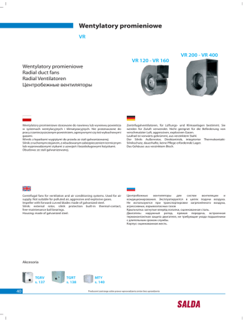 Wentylatory promieniowe VR VR 200 - VR 400 VR 120 - VR 160 Wentylatory promieniowe Radial duct fans Radial Ventilatoren Центробежные вентиляторы Wentylatory promieniowe stosowane do nawiewu lub wywiewu powietrza w systemach wentylacyjnych i klimatyzacyjnych. Nie przeznaczone do pracy z zanieczyszczonym powietrzem, agresywnymi czy też wybuchowymi gazami. Wirnik: z łopatkami wygiętymi do przodu ze stali galwanizowanej Silnik: z ruchomym stojanem, z wbudowanym zabezpieczeniem termicznym lub wyprowadzonymi stykami z uzwojeń i bezobsługowymi łożyskami. Obudowa: ze stali galwanizowanej. Zentrifugalventilatoren, für Lüftungs- und Klimaanlagen bestimmt. Sie werden für Zuluft verwendet. Nicht geeignet für die Beförderung von verschmutzter Luft, aggressiven, explosiven Gasen. Laufrad ist vorwärts gekrümmt, aus verzinktem Stahl. Der Silnik: Außenrotor, Direktantrieb, integrierter ThermokontaktSilnikschutz, dauerhafte, keine Pflege erfordernde Lager. Das Gehäuse: aus verzinktem Blech. Centrifugal fans for ventilation and air conditioning systems. Used for air supply. Not suitable for polluted air, aggressive and explosive gases. Impeller with forward curved blades made of galvanized steel. Silnik: external rotor, silnik protection built-in thermal-contact, free-maintenance ball bearings. Housing: made of galvanized steel. Центробежные вентиляторы для систем вентиляции и кондиционирования. Эксплуатируются в целях подачи воздуха. Не используются при транспортировке загрязнённого воздуха, агрессивных, взрывоопасных газов Крыльчатка: загнутые вперёд лопатки, оцинкованная сталь. Двигатель: наружный ротор, прямая передача, встроенная термоконтактная защита двигателя, не требующие ухода подшипники с длительным сроком службы. Корпус: оцинкованная жесть. Akcesoria TGRV s. 137 40 TGRT s. 138 MTY s. 140 Producent zastrzega sobie prawo wprowadzania zmian bez uprzedzenia Wentylatory promieniowe VR VR 120 - VR 160 VR 200 - VR 400 Typ Wymiary [mm] A B C D E F VR 120-2c L1 99 68,4 169,3 179,2 - - VR 140-2d L1 115 105 217 245,5 - - VR 160-2a L1 98 94,4 224,2 248,2 - - VR 160-2b L1 98 94,4 224,2 248,2 - - VR 200-4 L1/L3 156 125 395 330 182 165 VR 225-4 L1/L3 168 140 420 354 194 180 VR 250-4 L1/L3 200 155 475 395 228 207 VR 280-4 L1/L3 207 175 515 436 240 215 VR 315-4 L1/L3 250 194 594 493 281 246 VR 355-4 L3 280 220 668 550 309 272 VR 400-4 L3 313 246 749 617 349 298 Akcesoria Producent zastrzega sobie prawo wprowadzania zmian bez uprzedzenia 41 Wentylatory promieniowe VR 120-2c L1 VR 140-2d L1 VR 160-2a L1 VR 160-2b L1 Ciśnienie całkowite [Pa] VR Wydajność [m3/h] [V/Hz] [kW] [A] [min-1] [m3/h] [°C] [dBA] [kg] silnik skrzynka zacisków VR 200-4 L1 VR 200-4 L3 VR 225-4 L1 VR 225-4 L3 VR 140-2d L1 VR 160-2a L1 VR 160-2b L1 230/50 89 0,40 1880 370 50 61 TGRV 1,5 2,20 No. 3 IP-44 IP-55 230/50 185 0,80 2120 592 60 67 TGRV 1,5 2,50 No. 3 IP-44 IP-55 230/50 210 0,92 1850 575 40 70 TGRV 1,5 2,75 No. 3 IP-44 IP-55 230/50 300 1,30 2150 620 40 73 TGRV 1,5 4,05 No. 3 IP-44 IP-55 VR 200-4 L1 VR 200-4 L3 VR 225-4 L1 VR 225-4 L3 230/50 0,36 1,8 1180 1075 40 62 TGRV1,5 / MTY2 7,8 No.1 IP-54 IP-55 400/50 0,31 0,51 1230 1092 70 60 TGRT1 7 No.2 IP-54 IP-55 230/50 0,51 2,3 1250 1650 40 63 TGRV3 / MTY4 9 No.1 IP-54 IP-55 400/50 0,56 0,95 1270 1665 40 62 TGRT1 9 No.2 IP-54 IP-55 Ciśnienie całkowite [Pa] Napięcie/Częstotliwość Zużycie energii Natężenie Obroty Maks. wydajność Maks. temperatura medium Ciśnienie akustyczne z 1m Regulator prędkości Ciężar Schemat podłączenia Stopień ochrony: VR120-2c L1 Wydajność [m3/h] Napięcie/Częstotliwość Zużycie energii Natężenie Obroty Maks. wydajność Maks. temperatura medium Ciśnienie akustyczne z 1m Regulator prędkości Ciężar Schemat podłączenia Stopień ochrony: 42 [V/Hz] [kW] [A] [min-1] [m3/h] [°C] [dBA] [kg] silnik skrzynka zacisków Producent zastrzega sobie prawo wprowadzania zmian bez uprzedzenia Wentylatory promieniowe VR Ciśnienie całkowite [Pa] VR 250-4 L1 VR 250-4 L3 VR 280-4 L1 VR 280-4 L3 Wydajność [m3/h] VR 250-4 L1 VR 250-4 L3 230/50 0,69 3,0 1190 1885 40 66 TGRV4 / MTY4 14,5 No. 1 IP-54 IP-55 [V/Hz] [kW] [A] [min-1] [m3/h] [°C] [dBA] [kg] silnik skrzynka zacisków 400/50 0,93 1,9 1380 2645 50 64 TGRT2 14,5 No. 2 IP-54 IP-55 Ciśnienie całkowite [Pa] Napięcie/Częstotliwość Zużycie energii Natężenie Obroty Maks. wydajność Maks. temperatura medium Ciśnienie akustyczne z 1m Regulator prędkości Ciężar Schemat podłączenia Stopień ochrony: VR 280-4 L1 230/50 1,15 5,1 1210 2885 40 69 TGRV7 20 No. 1 IP-54 IP-55 VR 280-4 L3 400/50 1,5 2,6 1310 3805 40 65 TGRT3 19,4 No. 2 IP-54 IP-55 VR 315-4 L1 VR 315-4 L3 VR 355-4 L3 VR 400-4 L3 Wydajność [m3/h] VR 315-4 L1 Napięcie/Częstotliwość Zużycie energii Natężenie Obroty Maks. wydajność Maks. temperatura medium Ciśnienie akustyczne z 1m Regulator prędkości Ciężar Schemat podłączenia Stopień ochrony: [V/Hz] [kW] [A] [min-1] [m3/h] [°C] [dBA] [kg] silnik skrzynka zacisków VR 315-4 L3 230/50 2,5 11 1340 4475 40 58 TGRV14 30,7 No. 1 IP-54 IP-55 Producent zastrzega sobie prawo wprowadzania zmian bez uprzedzenia 400/50 2,5 4,1 1300 5060 40 68 TGRT5 26 No. 2 IP-54 IP-55 VR 355-4 L3 400/50 3,7 6 1320 6320 40 73 TGRT7 40 No. 2 IP-54 IP-55 VR 400-4 L3 400/50 5 8,1 1330 7150 40 75 TGRT11 No. 2 IP-54 IP-55 43 Wentylatory promieniowe VR Schemat podłączenia No. 1 (1~230V) U1 = brązowy U2 = niebieski Z1 = czarny Z2 = pomarańczowy TK = biały PE = żółty-green Schemat podłączenia No. 2 (3~400V) U1 = brązowy U2 = czerwony V1 = niebieski V2 = szary W1 = czarny W2 = pomarańcz