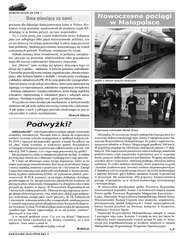 DOKOŃCZENIE ZE STR. 1 Dwa miesiące za nami grożenia dla dalszego funkcjonowania kolei w Polsce. Kolejarze swoje postulaty zaadresowali do premiera rządu RP, składając je w formie petycji, na ręce wojewodów. To o czym piszę jest często traktowane przez kolejarza jako coś odległego albo jakaś niezrozumiała polityka, coś co nie dotyczy zwykłego pracownika. Ludzie mają przecież inne problemy, bardziej przyziemne, koncentrujące się wokół codziennych potrzeb. Problemy ważniejsze bo swoje. Jednak musimy mieć świadomość, ze polityka, zarządzanie, decyzje na poziomie właścicielskim albo pracodawcy mają dla naszej codzienności kluczowe znaczenie. Już „bliższe” nam wydają się sprawy dotyczące tego co dzieje się w spółce – zakładzie, w którym jesteśmy zatrudnieni. Chociażby przewidywane zmiany organizacyjne, obrona miejsc pracy albo kolejna batalia o dodatki i świadczenia wynikające z układów zakładowych (PR, PLK) oraz podwyżki wynagrodzeń. Tam też mamy swoje sekcje zawodowe, które tymi sprawami się zajmują i co najważniejsze, zakładowe organizacje związkowe – komisje zakładowe i międzyzakładowe, które będąc najbliżej członków, reprezentują w zakładach pracy i sekcjach nasze interesy. Działają wszędzie tam, gdzie jest taka potrzeba. Wszystko to musi działać jak mechanizm, w którym każda struktura tak jak koło zębate ma swoją ważną rolę i znaczenie. A jak jedno z nich, z jakiegoś powodu niedomaga, to jest to odczuwalne w całym mechanizmie. Henryk Sikora Nowoczesne pociągi w Małopolsce Jeden z dwóch nowych Acatusów. Podwyżki? Jakie podwyżki? – mówią pracodawcy tonując zapędy i roszczenia związków zawodowych. Początek roku to okazja do rozpoczęcia rozmów na temat wzrostu wynagrodzeń w spółkach kolejowych. Po 2010 r. lepszym niż poprzedni, apetyty wzrosły bo odbicie się od „dna” widać wyraźnie, w większości spółek. Przykładowo w Energetyce kolejowej wypracowano całkiem niezły zysk (ok. 148 mln zł tj. 268 % planu). I co z tego mają pracownicy tej spółki? Jak się rozmawia z nimi, to entuzjazmu jakoś nie słychać. A widmo prywatyzacji miesza się z obawami wynikającymi z tego procesu. W Cargo od dłuższego czasu trwają negocjacje, które są na etapie znacznego zaawansowania. Być może na przełomie lutego i marca zapadną ustalenia o podwyżce od 1 kwietnia br. Zarząd Cargo chce znaczną część podwyżki uruchamiać w formie premii, której wypłata uzależniona byłaby od wykonania planów przewozowych. W PLK rozmowy są na etapie delikatnie określając przedwstępnym, bo zarząd uzależnia jakiekolwiek konkrety od przyjęcia przez właściciela, biznesplanu (w ubiegłym roku walne przyjęło go dopiero w lipcu). W Przewozach Regionalnych od 3 lat nie było żadnej podwyżki. Obecnie trwają negocjacje nowego układu zbiorowego pracy i być może przy okazji jego podpisania i wdrożenia, nastąpi jakiś „ruch” płacowy. W TK Telekom od 1 stycznia br. wdrożono podwyżkę wynagrodzeń, ustaloną jeszcze w ramach negocjacji przed ubiegłorocznym Świętem Kolejarza. Jej wysokość wynosi 70 zł dla każdego pracownika do uposażenia zasadniczego. Strony zapowiadają, że to nie koniec „ruchów” płacowych w tym roku. A w innych spółkach cisza. Czy coś się dzieje? Napiszcie coś na ten temat i podzielcie się, drodzy czytelnicy, co o tym sądzicie. Nasz adres e-mail to: [email protected] Redakcja KOLEJARZ MAŁOPOLSKI 2 Przemawia marszałek Marek Sowa Od piątku 28 stycznia po torach małopolski kursują dwa nowoczesne elektryczne pociągi typu Acatus 2 zakupione przez Samorząd Województwa Małopolskiego. To jedne z najnowocześniejszych składów w Polsce. Mogą osiągać prędkość 160 km/h. W pojeździe znajduje się 180 miejsc siedzących stałych i 15 składanych. Dla zapewnienia pasażerom odpowiedniego standardu podróżowania część pasażerska wyposażona jest w wygodne fotele, poręcze, półki bagażowe nad fotelami. Wagony posiadają szerokie drzwi wejściowe, obniżoną podłogę, obszerną kabinę sanitarną. To tylko niektóre elementy, które poprawią wygodę i komfort podróżowania, również osobom niepełnosprawnym. Z dodatkowych rozwiązań mogą cieszyć się osoby podróżujące z małymi dziećmi, gdyż kabina sanitarna została wyposażona w przewijak dla niemowląt. Dla poprawy bezpieczeństwa pociągi wyposażone są w system monitoringu zewnętrznego i wewnętrznego. W uroczystym przekazaniu spółce Przewozy Regionalne nowoczesnych pojazdów Acatus 2 uczestniczyli między innymi Prezes spółki Przewozy Regionalne Małgorzata Kuczewska – Łaska, Marszałek Województwa Małopolskiego Marek Sowa, Wicemarszałek Roman Ciepiela oraz posłowie, senatorowie, przedstawiciele spółek kolejowych i władz samorządowych, którzy licznie przybyli na dworzec kolejowy w Krakowie, Tarnowie i Nowym Sączu. Samorząd Województwa Małopolskiego zakupił w sumie 5 pociągów tego typu. Kolejne 3 wyjadą na tory już latem br. Całkowity koszt zamówienia wynosi ponad 91 mln zł. Inwestycja jest współfinansowana ze środków unijnych w ramach Małopolskiego Regionalnego Programu Operacyjnego. A.P.