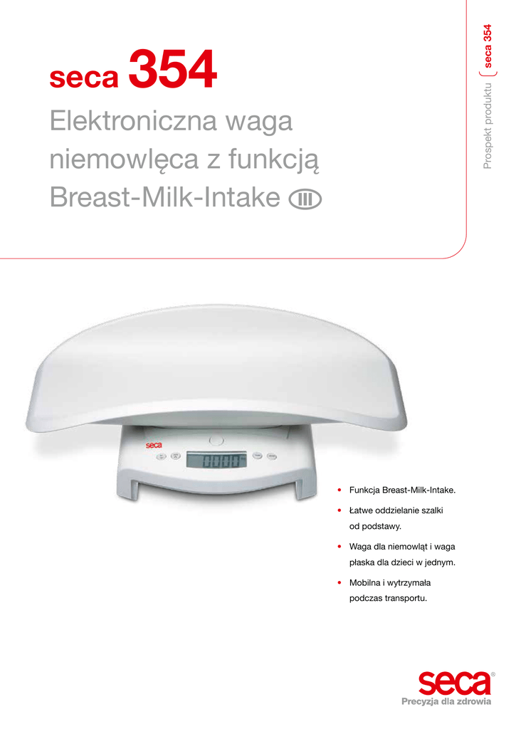 354 Prospekt produktuseca 354 seca Elektroniczna waga niemowlęca z funkcją Breast-Milk-Intake • Funkcja Breast-Milk-Intake. • Łatwe oddzielanie szalki od podstawy. • Waga dla niemowląt i waga płaska dla dzieci w jednym. • Mobilna i wytrzymała podczas transportu. Prospekt produktuseca 354 seca 354: Niezawodna ochrona dla prawidłowego rozwoju. O dżywianie odgrywa ważną rolę podczas zdrowego rozwoju noworodka. Dzięki nowej wadze dla niemowląt seca 354, można codziennie za pomocą jednego przycisku kontrolować, ile mleka wypiło niemowlę podczas karmienia. Dzięki temu, seca oferuje najbardziej niezawodne narzędzie do kontroli odżywiania niemowląt. Waga seca 354 jest więc idealnym rozwiązaniem dla rodziców, którzy chcą w domu skontrolować ilość wypitego mleka przez ich niemowlę. Bezpieczeństwo i ochrona. Łatwa obsługa dzięki czytelnym przyciskom. Mobilna i wytrzymała podczas transportu. W szalce seca 354 można bezpiecznie i Łatwa obsługa seca 354 jest możliwa dzięki Kompaktowa i wytrzymała konstrukcja czyni forma szalki z lekko podwyższonymi ścian- umożliwia po zważeniu uprzednie zajęcie dlatych, którzy w celu zapewnienia zdrowia wygodnie ważyć niemowlęta. Zaokrąglona kami bocznymi, gwarantuje bezpieczeństwo. Dzięki funkcji Breast-Milk-Intake można określić ilość mleka spożywanego przez niemowlę podczas karmienia. Za pomocą jednego przycisku, można zapisać przed intuicyjnym przyciskom. Funkcja HOLD się niemowlęciem a dopiero potem odczytanie wyniku. Dzięki funkcji TARA, pieluchy lub miękkie podkładki są odejmowane od wagi całkowitej. karmieniem wagę niemowlęcia, która jest wagę seca 354 narzędziem pracy również dzieci muszą być mobilni. Energooszczędna bateria – do 20 000 ważeń na jednym zestawie baterii – waga zyskuje niezależność od lokalizacji. Praktyczna, opcjonalna torba seca 414 z paskiem na ramię ułatwia mobilne stosowanie wagi. odejmowana podczas ponownego ważenia od aktualnej wagi. Waga dla niemowląt i waga płaska dla dzieci w jednym. Wystarczy jeden ruch aby zmienić wagę dla niemowląt w wagę płaską o nośności 20 kg: Przez naciśnięcie przycisku zwalnia się po- łączenie między szalką i podstawą. Stabilne połączenie między szalką i podstawą umożli- seca 414 seca 413 wia bezproblemowe podnoszenie oraz bezpieczny transport wagi. seca 354 Dane techniczne • Nośność: 20 kg • Wymiary (szer. x wys. x gł.): Szalka odłącza się od podstawy za jednym naciśnięciem przycisku. • • • • Podziałka: 10 g < 10 kg > 20 g 552 x 156 x 332 mm Ciężar własny: 3 kg Zasilanie: Baterie Funkcje: TARA, auto-HOLD, BMIF, przełączanie jednostek pomiaru kg/lbs Klasa dokładności: 201135417012 Zastrzegamy sobie prawo do zmian. • seca gmbh & co. kg • Hammer Steindamm 9 – 25 • 22089 Hamburg • Niemcy • Telefon +48 22 6570 441 • Faks +48 22 6570 426 • www.seca.com