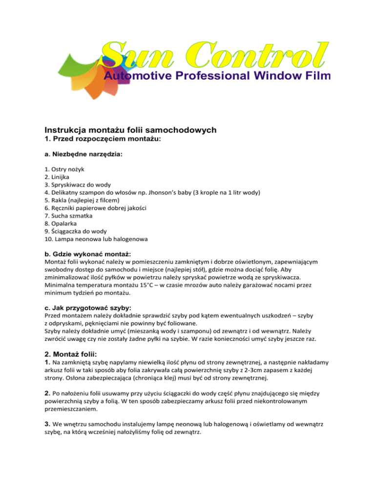 Automotive Professional Window Film Instrukcja montażu folii samochodowych 1. Przed rozpoczęciem montażu: a. Niezbędne narzędzia: 1. Ostry nożyk 2. Linijka 3. Spryskiwacz do wody 4. Delikatny szampon do włosów np. Jhonson’s baby (3 krople na 1 litr wody) 5. Rakla (najlepiej z filcem) 6. Ręczniki papierowe dobrej jakości 7. Sucha szmatka 8. Opalarka 9. Ściągaczka do wody 10. Lampa neonowa lub halogenowa b. Gdzie wykonać montaż: Montaż folii wykonać należy w pomieszczeniu zamkniętym i dobrze oświetlonym, zapewniającym swobodny dostęp do samochodu i miejsce (najlepiej stół), gdzie można dociąć folię. Aby zminimalizować ilość pyłków w powietrzu należy spryskać powietrze wodą ze spryskiwacza. Minimalna temperatura montażu 15°C – w czasie mrozów auto należy garażować nocami przez minimum tydzień po montażu. c. Jak przygotować szyby: Przed montażem należy dokładnie sprawdzić szyby pod kątem ewentualnych uszkodzeń – szyby z odpryskami, pęknięciami nie powinny być foliowane. Szyby należy dokładnie umyć (mieszanką wody i szamponu) od zewnątrz i od wewnątrz. Należy zwrócić uwagę czy nie zostały żadne pyłki na szybie. W razie konieczności umyć szyby jeszcze raz. 2. Montaż folii: 1. Na zamkniętą szybę napylamy niewielką ilość płynu od strony zewnętrznej, a następnie nakładamy arkusz folii w taki sposób aby folia zakrywała całą powierzchnię szyby z 2-3cm zapasem z każdej strony. Osłona zabezpieczająca (chroniąca klej) musi być od strony zewnętrznej. 2. Po nałożeniu folii usuwamy przy użyciu ściągaczki do wody część płynu znajdującego się między powierzchnią szyby a folią. W ten sposób zabezpieczamy arkusz folii przed niekontrolowanym przemieszczaniem. 3. We wnętrzu samochodu instalujemy lampę neonową lub halogenową i oświetlamy od wewnątrz szybę, na którą wcześniej nałożyliśmy folię od zewnątrz. Automotive Professional Window Film 4. Przy użyciu nożyka należy odciąć nadmiar folii w taki sposób aby krawędzie boczne oraz górna były większe o około 1-2mm od widocznej powierzchni szyby. (W przypadku szyb opuszczanych dolna krawędź tak przyciętego arkusza folii powinna być równa z dolną krawędzią zewnętrznej uszczelki). 5. Jeśli szyby są zaokrąglone – przeważnie tyczy się to tylnich szyb, folię należy formować na gorąco za pomocą opalarki i rakli. Pilnując jednocześnie by nie przegrzać folii. Proces ten jest czasochłonny, ale należy go wykonać starannie by folia była dobrze dopasowana do szyby. 6. Następnie przy użyciu taśmy papierowej z klejem (bądź nożykiem) rozklejamy folię na powierzchni 3-4cm w wybranym górnym narożniku, cały arkusz folii dwustronnie pokrywamy płynem i prowizorycznie (na chwilę) przyklejamy do innej czystej szyby. 7. Opuszczamy szybę o kilka centymetrów tak aby była widoczna jej górna krawędź. Ponownie myjemy szybę a następnie całą jej powierzchnię spryskujemy przygotowanym płynem. Bezpośrednio po tej czynności z górnego fragmentu folii usuwamy folię zabezpieczającą klej, który również spryskujemy tym samym płynem. Folię z klejem przenosimy na szybę. W czasie przenoszenia folii na szybę należy uważać by nie dotknąć folią do elementów karoserii i innych. Folia dzięki podwójnej warstwie płynu swobodnie przesuwa się po szybie co pozwala na właściwe jej rozmieszczenie. 8. Po nałożeniu folii na szybę za pomocą rakli usuwamy płyn znajdujący się pod folią. Czynność taką najlepiej wykonuje się przy użyciu rakla stosowanego do naklejania folii reklamowych (Państwa GRATIS) owiniętego w ręcznik papierowy który wchłania usuwany płyn. Kierunki usuwania płynu – zalecane jest usuwanie płynu od środka do bocznych krawędzi arkusza folii. Po usunięciu płynu odcinamy część folii od górnej krawędzi szyby /około 1 mm/ co zabezpiecza przed odrywaniem folii podczas zamykania szyby. Po wykonaniu tych czynności zamykamy szybę, usuwamy dolną część folii zabezpieczającej oraz pozostały płyn, a następnie przy pomocy opalarki nagrzewamy szybę wraz z folią do temperatury około 50 stopni C. 9. Po upływie kilku minut od wykonania ostatniej czynności należy sprawdzić wygląd foliowanej szyby i w zależności od potrzeb wykonać niezbędne poprawki. 10. Widoczne pod folią drobinki wody (w postaci „smug”) mogą parować jeszcze przez 24godziny. W tym czasie auto powinno stać w ciepłym miejscu. 11. Jeśli pozostały jakiekolwiek drobinki kurzu między szybą a folią, należy je wycisnąć rakielką poza obszar montażu (jeszcze przed ostatecznym wyciśnięciem wody spod folii). 12. Nie należy opuszczać szyb przez okres 4 tygodni po montażu.