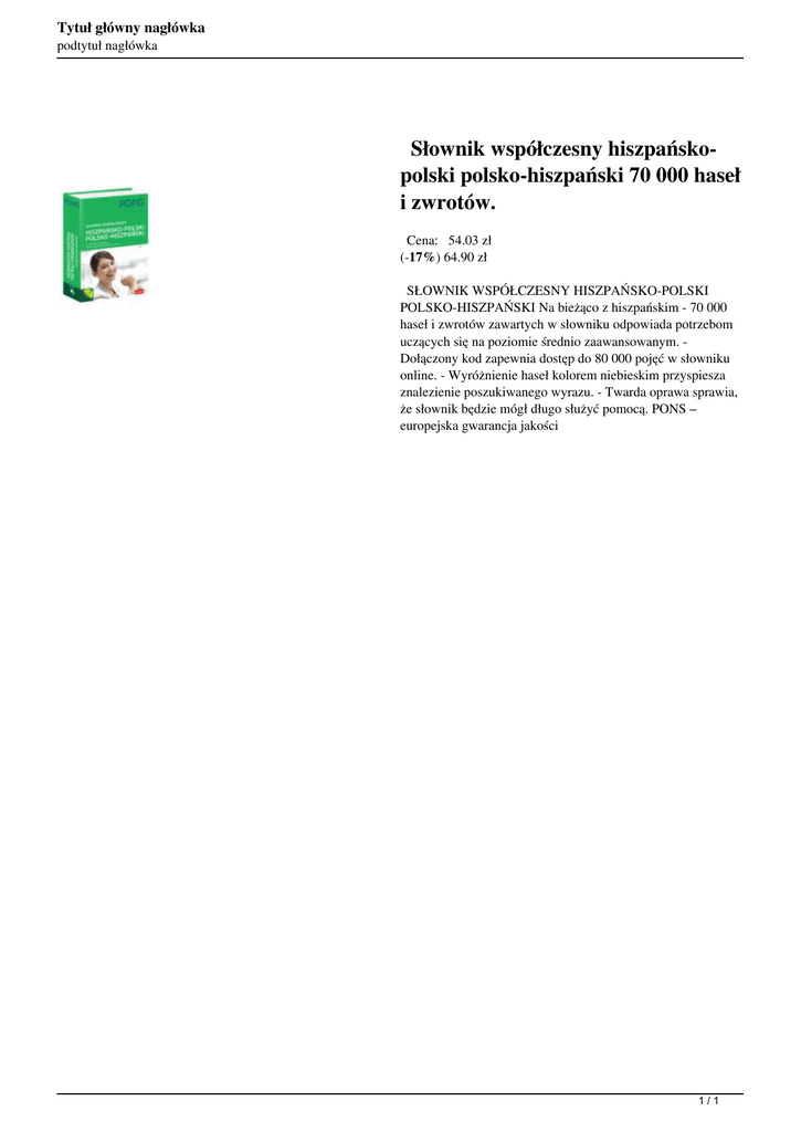 Tytuł główny nagłówka podtytuł nagłówka Słownik współczesny hiszpańskopolski polsko-hiszpański 70 000 haseł i zwrotów. Cena: 54.03 zł (-17%) 64.90 zł SŁOWNIK WSPÓŁCZESNY HISZPAŃSKO-POLSKI POLSKO-HISZPAŃSKI Na bieżąco z hiszpańskim - 70 000 haseł i zwrotów zawartych w słowniku odpowiada potrzebom uczących się na poziomie średnio zaawansowanym. Dołączony kod zapewnia dostęp do 80 000 pojęć w słowniku online. - Wyróżnienie haseł kolorem niebieskim przyspiesza znalezienie poszukiwanego wyrazu. - Twarda oprawa sprawia, że słownik będzie mógł długo służyć pomocą. PONS – europejska gwarancja jakości 1/1 Powered by TCPDF (www.tcpdf.org)