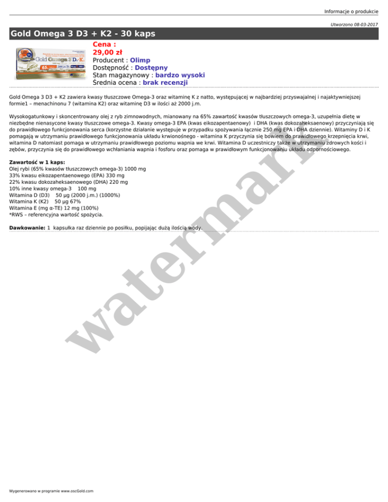 Informacje o produkcie Utworzono 08-03-2017 Gold Omega 3 D3 + K2 - 30 kaps Cena : 29,00 zł Producent : Olimp Dostępność : Dostępny Stan magazynowy : bardzo wysoki Średnia ocena : brak recenzji Gold Omega 3 D3 + K2 zawiera kwasy tłuszczowe Omega-3 oraz witaminę K z natto, występującej w najbardziej przyswajalnej i najaktywniejszej formie1 – menachinonu 7 (witamina K2) oraz witaminę D3 w ilości aż 2000 j.m. er m ar k Wysokogatunkowy i skoncentrowany olej z ryb zimnowodnych, mianowany na 65% zawartość kwasów tłuszczowych omega-3, uzupełnia dietę w niezbędne nienasycone kwasy tłuszczowe omega-3. Kwasy omega-3 EPA (kwas eikozapentaenowy) i DHA (kwas dokozaheksaenowy) przyczyniają się do prawidłowego funkcjonowania serca (korzystne działanie występuje w przypadku spożywania łącznie 250 mg EPA i DHA dziennie). Witaminy D i K pomagają w utrzymaniu prawidłowego funkcjonowania układu krwionośnego - witamina K przyczynia się bowiem do prawidłowego krzepnięcia krwi, witamina D natomiast pomaga w utrzymaniu prawidłowego poziomu wapnia we krwi. Witamina D uczestniczy także w utrzymaniu zdrowych kości i zębów, przyczynia się do prawidłowego wchłaniania wapnia i fosforu oraz pomaga w prawidłowym funkcjonowaniu układu odpornościowego. Zawartość w 1 kaps: Olej rybi (65% kwasów tłuszczowych omega-3) 1000 mg 33% kwasu eikozapentaenowego (EPA) 330 mg 22% kwasu dokozaheksaenowego (DHA) 220 mg 10% inne kwasy omega-3 100 mg Witamina D (D3) 50 µg (2000 j.m.) (1000%) Witamina K (K2) 50 µg 67% Witamina E (mg α-TE) 12 mg (100%) *RWS – referencyjna wartość spożycia. w at Dawkowanie: 1 kapsułka raz dziennie po posiłku, popijając dużą ilością wody. Wygenerowano w programie www.oscGold.com