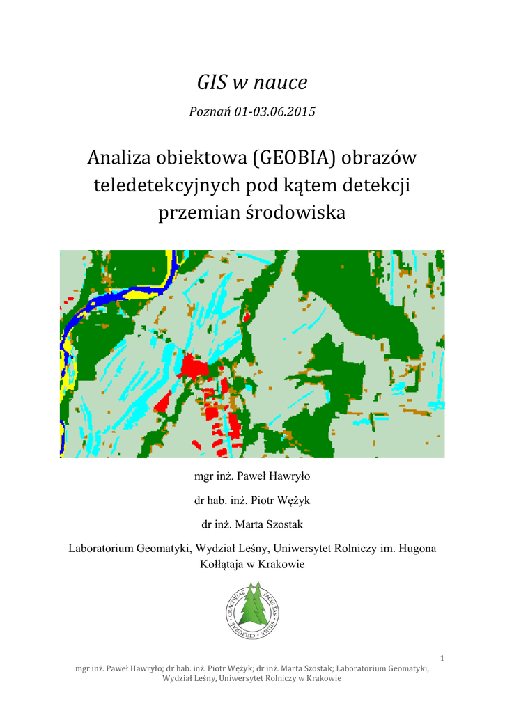 GIS w nauce Poznań 01-03.06.2015 Analiza obiektowa (GEOBIA) obrazów teledetekcyjnych pod kątem detekcji przemian środowiska mgr inż. Paweł Hawryło dr hab. inż. Piotr Wężyk dr inż. Marta Szostak Laboratorium Geomatyki, Wydział Leśny, Uniwersytet Rolniczy im. Hugona Kołłątaja w Krakowie mgr inż. Paweł Hawryło; dr hab. inż. Piotr Wężyk; dr inż. Marta Szostak; Laboratorium Geomatyki, Wydział Leśny, Uniwersytet Rolniczy w Krakowie 1 1. Wstęp Celem warsztatów jest poznanie podstaw klasyfikacji obiektowej w oprogramowaniu eCognition Developer. Wykorzystane zostaną dane wieloźródłowe: zobrazowanie satelitarne systemu BlackBridge RapidEye, znormalizowany Numeryczny Model Pokrycia Terenu wygenerowany z chmury punktów ALS oraz warstwa wektorowa budynków pozyskana z Open Street Map. Klasyfikacja zostanie przeprowadzona w oprogramowaniu eCognition Developer 8.7 Trial firmy Trimble. Klasyfikacja ma na celu wyróżnienie następujących klas: a) b) c) d) e) f) g) 2. Woda Tereny nadrzeczne Zabudowa Lasy Sukcesja leśna Roślinność niska Tereny pozbawione roślinności Przygotowanie środowiska pracy Skopiuj dane potrzebne do wykonania ćwiczenia do swojego katalogu roboczego na dysku lokalnym. Nie stosuj polskich znaków oraz spacji w nazwach tworzonych folderów. Dane wejściowe znajdują się w folderze Warsztaty_GEOBIA: RapidEye_2011_08_11_AOI.img, ndsm.img, Budynki_OSM.shp. 3. Podstawowe komponenty interfejsu programu Rycina 1 przedstawia układ podstawowych komponentów interfejsu programu: 1) Główne okno robocze programu. Tutaj wyświetlane będą dane oraz wyniki analiz; 2) Process tree - w tym miejscu konstruowany będzie zbiór reguł klasyfikacyjnych, w formie (dosłownie) drzewa procesów, odpowiadających za przetwarzanie danych; 3) Image Object Information - tutaj wyświetlane będą informacje na temat wyselekcjonowanych obiektów lub wartości zdefiniowanych zmiennych; 4) Class Hierarchy - zarządzanie klasami 5) Feature View - przeglądanie, tworzenie nowych lub modyfikacja istniejących cech (właściwości) obiektów dostępnych w procesie klasyfikacji. mgr inż. Paweł Hawryło; dr hab. inż. Piotr Wężyk; dr inż. Marta Szostak; Laboratorium Geomatyki, Wydział Leśny, Uniwersytet Rolniczy w Krakowie 2 Ryc. 1. Interfejs oprogramowania eCognition Developer 4. Tworzenie reguł klasyfikacyjnych Analizy przeprowadzane w oprogramowaniu eCognition Developer budowane są z pojedynczych algorytmów segmentacji, klasyfikacji, modyfikacji kształtu, łączenia obiektów i innych procesów. Algorytmy te przeplatają się ze sobą i choć można stwierdzić, iż klasyfikacja jest zawsze poprzedzona segmentacją, to niejednokrotnie segmentacja dotyczy sklasyfikowanych uprzednio obiektów. Należy również pamiętać, iż sam proces segmentacji często jest wieloetapowy, gdyż bardzo rzadko udaje się tak dobrać parametry segmentacji, aby były optymalne dla każdej z klas pokrycia terenu. Sekwencje różnych algorytmów tworzą tzw. reguły klasyfikacyjne (ang. rule set). 5. Cechy obiektów Podczas tworzenia reguł klasyfikacyjnych operator wykorzystuje cechy dostępne w oknie Feature View. Cechy te podzielone są na kilka kategorii. Podczas warsztatów wykorzystywane będą cechy odnoszące się do obiektów z dwóch pierwszych kategorii, tj. Object Features oraz Class-Related features. 6. Budowa okna pojedynczego algorytmu (procesu) Chociaż w programie dostępnych jest bardzo wiele algorytmów przeznaczonych do bardzo różnych celów, okna tych algorytmów charakteryzują się pewnymi wspólnymi cechami. Poniżej przedstawiono budowę okna algorytmu segmentacji Multiresolution segmentation. Okno każdego algorytmu podzielone jest w pierwszej kolejności na dwie części - lewą, w której dokonujemy wyboru algorytmu (Algorithm) oraz prawą, gdzie w zależności od wybranego algorytmu pojawiają się jego parametry (Parameter), które mogą być mgr inż. Paweł Hawryło; dr hab. inż. Piotr Wężyk; dr inż. Marta Szostak; Laboratorium Geomatyki, Wydział Leśny, Uniwersytet Rolniczy w Krakowie 3 modyfikowane przez użytkownika. W lewej części znajduje się również bardzo ważna zakładka Image Object Domain, przy użyciu której użytkownik definiuje dziedzinę działania algorytmu. Ryc. 2. Budowa okna pojedynczego algorytmu na przykładzie algorytmu Multiresolution segmentation. 7. Klasyfikacja obiektowa Poniżej przedstawiono kolejne operacje, które należy wykonać w celu przeprowadzenia klasyfikacji wybranego fragmentu terenu z okolic Nowego Targu: A. Założenie projektu: Kierując się wskazówkami instruktora załóż nowy projekt (File/New Project) stosując następującą kolejność oraz aliasy: nDSM; dla kanałów obrazu RapidEye: RE_NIR, RE_red, RE_green, RE_red-edge, RE_blue; Budynki_OSM. B. Segmentacja: Wykonaj segmentację obrazu przy użyciu algorytmu Multiresolution segmentation stosując następujące wartości parametrów: Level name=Level_1, Scale parameter=100, Shape=0.2, Compactness=0.5, wagi dla warstw - nDSM oraz RE_NIR=2, pozostałe kanały =1. Zmodyfikuj granice otrzymanych segmentów algorytmem spectral difference segmentation: Maximum spectra difference=150 mgr inż. Paweł Hawryło; dr hab. inż. Piotr Wężyk; dr inż. Marta Szostak; Laboratorium Geomatyki, Wydział Leśny, Uniwersytet Rolniczy w Krakowie 4 C. Klasyfikacja: Woda: Obiekty niesklasyfikowane o wartości cechy Mean RE_NIR < 3800 zaklasyfikuj do klasy Woda (Assign class), Utwórz warstwę indeksu roślinności NDVI przy użyciu algorytmu layer arithmetics: Output value: "(RE_NIR-RE_red)/(RE_NIR+RE_red)", Output layer:NDVI, Output layer type: 3Bit float Obiekty z klasy Woda o wartości cechy Mean NDVI >=0.05 zaklasyfikuj do klasy Unclassified (Assign class), Połącz obiekty z klasy Woda (Merge region), Obiekty z klasy Woda o wysokości Mean nDSM>=1 m zaklasyfikuj do klasy Unclassified (Assign class), Obiekty z klasy Woda o powierzchni mniejszej niż 1000 p