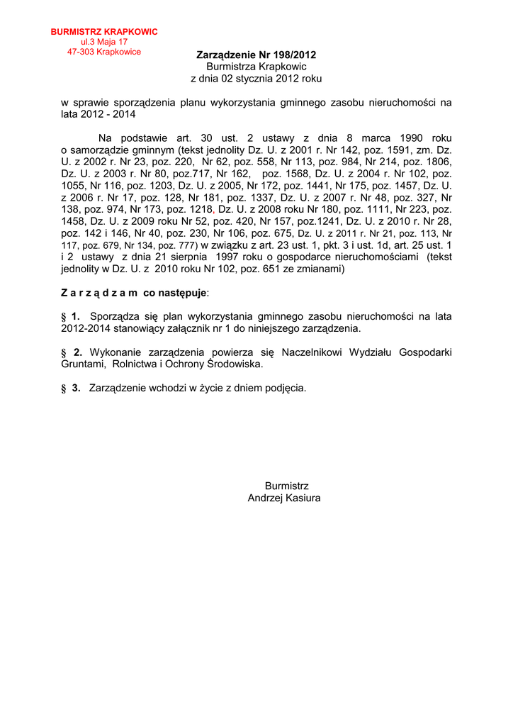 Zarządzenie Nr 198/2012 Burmistrza Krapkowic z dnia 2.01.2012 r.