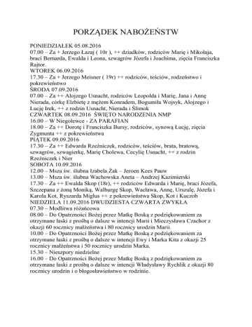 PORZĄDEK NABOŻEŃSTW PONIEDZIAŁEK 05.08.2016 07.00 – Za + Jerzego Łazaj ( 10r ), ++ dziadków, rodziców Marię i Mikołaja, braci Bernarda, Ewalda i Leona, szwagrów Józefa i Joachima, zięcia Franciszka Rajtor. WTOREK 06.09.2016 17.30 – Za + Jerzego Meisner ( 19r) ++ rodziców, teściów, rodzeństwo i pokrewieństwo ŚRODA 07.09.2016 07.00 – Za ++ Alojzego Usnacht, rodziców Leopolda i Marię, Jana i Annę Nierada, córkę Elzbietę z mężem Konradem, Bogumiła Wojsyk, Alojzego i Łucję Irek, ++ z rodzin Usnacht, Nierada i Ślimok CZWARTEK 08.09.2016 ŚWIĘTO NARODZENIA NMP 16.00 – W Niegolewce - ZA PARAFIAN 18.00 – Za ++ Dorotę i Franciszka Bursy, rodziców, synową Łucję, zięcia Zygmunta ++ z pokrewieństwa PIĄTEK 09.09.2016 17.30 – Za ++ Edwarda Rzeźniczek, rodziców, teściów, brata, bratową, szwagrów, szwagierkę, Marię Cholewa, Cecylię Usnacht, ++ z rodzin Rzeźniczek i Nier SOBOTA 10.09.2016 12.00 – Msza św. ślubna Izabela Żak – Jeroen Kees Pauw 13.00 – Msza św. ślubna Wachowska Aneta – Andrzej Kazimierski 17.30 – Za ++ Ewalda Skop (18r), ++ rodziców Edwarda i Marię, braci Józefa, Szczepana z żoną Moniką, Walburgę Skop, Wacława, Annę, Urszulę, Józefa i Karola Kot, Ryszarda Miglus ++ z pokrewieństwa Skop, Kot i Kuczob NIEDZIELA 11.09.2016 DWUDZIESTA CZWARTA ZWYKŁA 07.30 – Modlitwa różańcowa 08.00 – Do Opatrzności Bożej przez Matkę Boską z podziękowaniem za otrzymane łaski z prośbą o dalsze w intencji Marii i Mieczysława Czachor z okazji 60 rocznicy małżeństwa i 80 rocznicy urodzin Marii. 10.00 – Do Opatrzności Bożej przez Matkę Boską z podziękowaniem za otrzymane łaski z prośbą o dalsze w intencji Ewy i Marka Kita z okazji 25 rocznicy małżeństwa i 50 rocznicy urodzin Marka. 15.30 – Nieszpory niedzielne 16.00 – Do Opatrzności Bożej przez Matkę Boską z podziękowaniem za otrzymane łaski z prośbą o dalsze w intencji Władysławy Rychlik z okazji 80 rocznicy urodzin i o błogosławieństwo w rodzinie. OGŁOSZENIA DUSZPASTERSKIE Dzisiaj XXIII NIEDZIELA ZWYKŁA oraz DOŻYNKI PARAFIALNE. O godz. 10.00 uroczysta procesja z darami chleba i wina oraz z koroną żniwną, czyli wieńcem dożynkowym i MSZA ŚW. DZIĘKCZYNNA DOŻYNKOWA. Po południu korowód dożynkowy i festyn w ogrodzie probostwa. Program jest na plakatach i w internecie na naszej lubszeckiej stronie www.lubsza.org . Zapraszamy Wszystkich. Bóg zapłać Wszystkim za pracę i przygotowania. W poniedziałek o godz. 16.00 zapraszamy do sprzątania ogrodu po festynie dożynkowym. Od czwartku do niedzieli na Górze Św. Anny obchody kalwaryjskie ku czci Podwyższenia Krzyża Świętego. Wyjazd autobusu na Górę Św. Anny w czwartek o godz. 8.10 z Kamienicy, 8.20 z Kamieńskich Młynów. O godz. 8.40 błogoslawieństwo na drogę w naszym kościele i wyjazd z Lubszy. W czwartek ŚWIĘTO NARODZENIA NAJŚWIĘTSZEJ MARYI PANNY. O godz. 16.00 w Niegolewce przy Krzyżu na granicy parafii i diecezji MSZA ŚW. ZA PARAFIAN wraz z parafianami z Siedlec i Mzyków z błogosławieństwem ziarna do siewu. O godz. 18.00 Msza św. w naszym kościele i poświęcenie ziarna siewnego. W sobotę o godz. 9.00 do czyszczenia kościoła zapraszam Parafian i Parafianki z Drogobyczy i Okrąglika. W sobotę o godz. 17.00 okazja do spowiedzi przed niedzielą. W niedzielę ( 11 września ) kolekta na nasz kościół. Bóg zapłać za pomoc, prace, czyszczenie kościoła, kwiaty, dekoracje i dary dożynkowe oraz za zaangażowanie przy organizacji dożynek parafialnych.