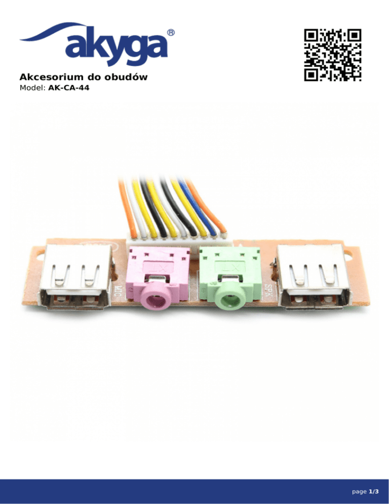 Akcesorium do obudów Model: AK-CA-44 page 1/3 Akcesorium do obudów model: AK-CA-44 Kod produktu AK-CA-44 Typ produktu Akcesorium do obudów Gniazda USB 2.0 na przednim panelu 2 szt Gniazdo audio na przednim panelu 1 szt Gniazdo mikrofonu na przednim panelu 1 szt Długość przewodu 65 cm Opakowanie UniBag Wymiary produktu (L x W x H) 70 x 20 Wymiary opakowania (L x W x H) 195 x 270 x 15 mm Waga netto 81 g Waga brutto 90 g Zgodność z RoHS Kod EAN Tak 5901720133281 Szkic page 2/3 Akcesorium do obudów model: AK-CA-44 page 3/3